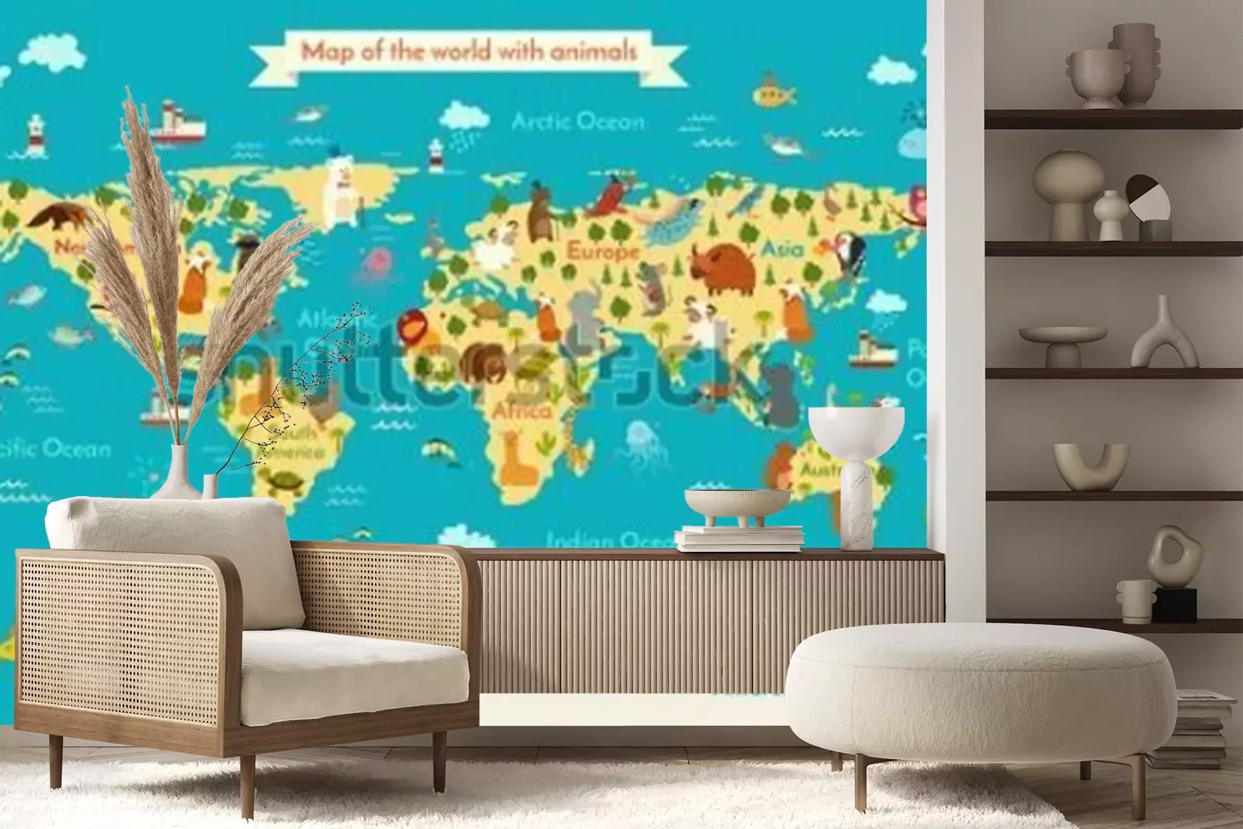 Papier peint  Animals world map. Preschool illustration, baby, continents, oceans, drawn, Earth.