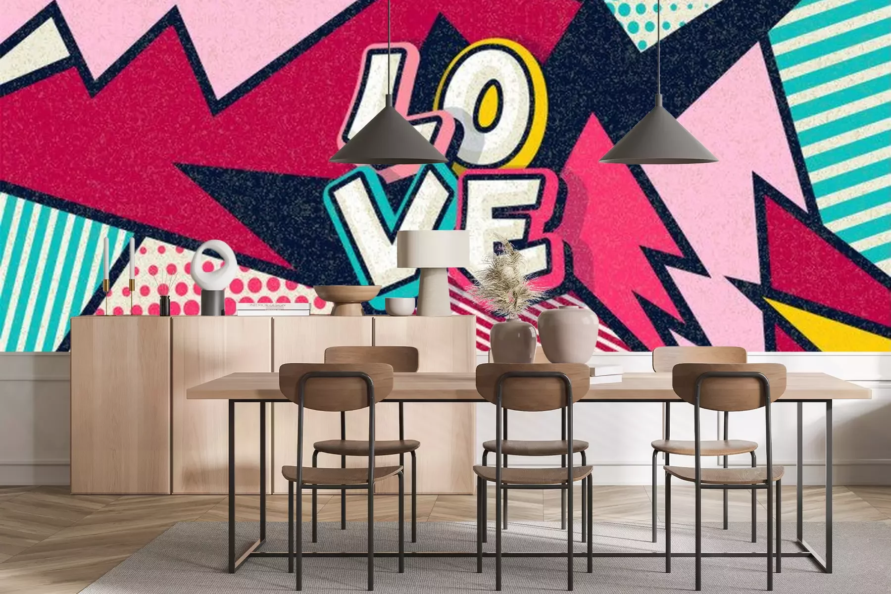 Papier peint  Love! Pop art funny comic word. Fashionable poster and banner. Social Media Connecting Blog Communication Content. Trendy and fashion color retro vintage illustration background. Vector easy editable