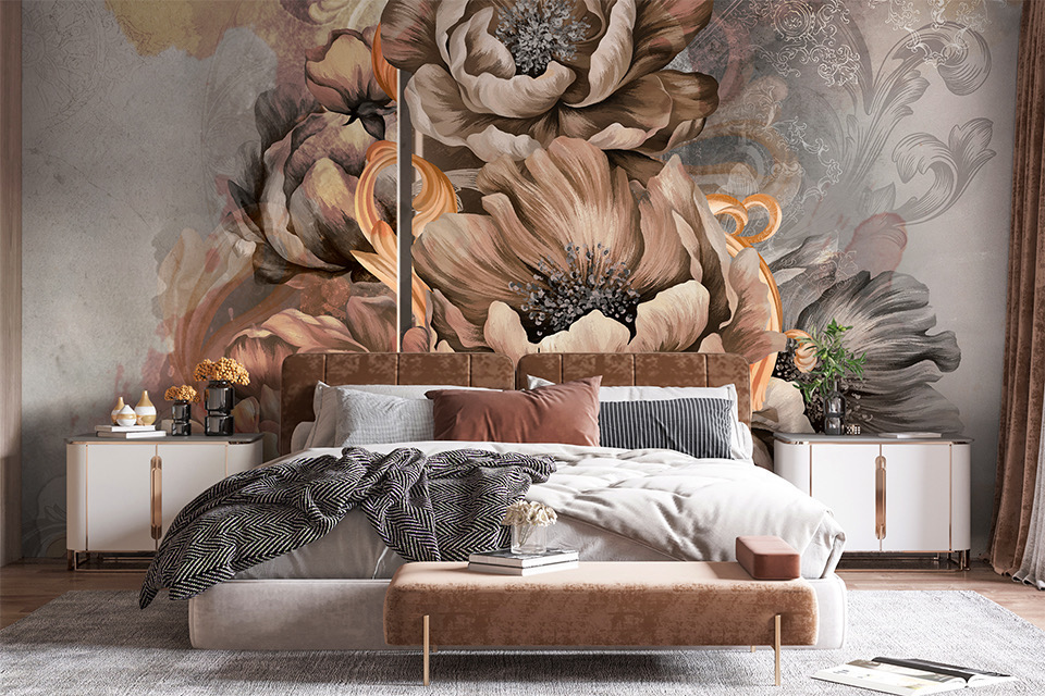 Un papier peint floral avec des fleurs luxuriantes est le choix parfait pour un intérieur moderne, où la nuance marron subtile Mocha Mousse souligne la chaleur et le caractère cosy de l'espace - redro.fr