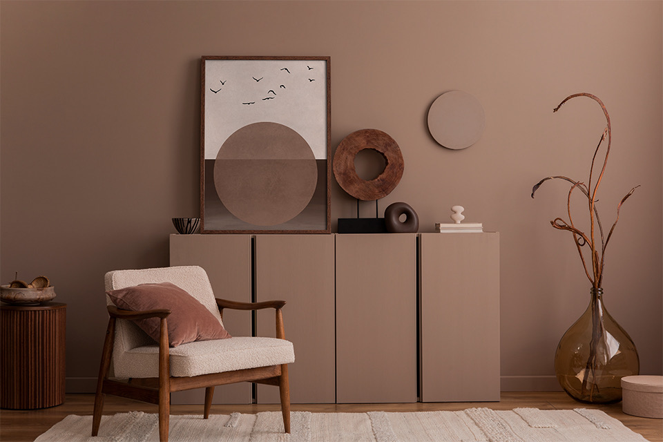 Notre deuxième suggestion est de ne choisir que des accessoires dans la teinte Mocha Mousse. Il peut s'agir de décorations murales telles que des posters ou des tableaux, des lampes ou des meubles. De telles touches décoratives conviendront parfaitement aux décors écolos, vintage et bohèmes, mais vous permettront également de réchauffer visuellement un espace minimaliste, scandinave et industriel.