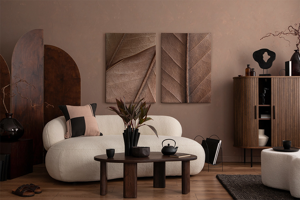 Les décorations murales marron complètent parfaitement les intérieurs de style wabi sabi, bohème ou japonais (1. tableau feuille, 2. tableau feuille brune) - redro.fr