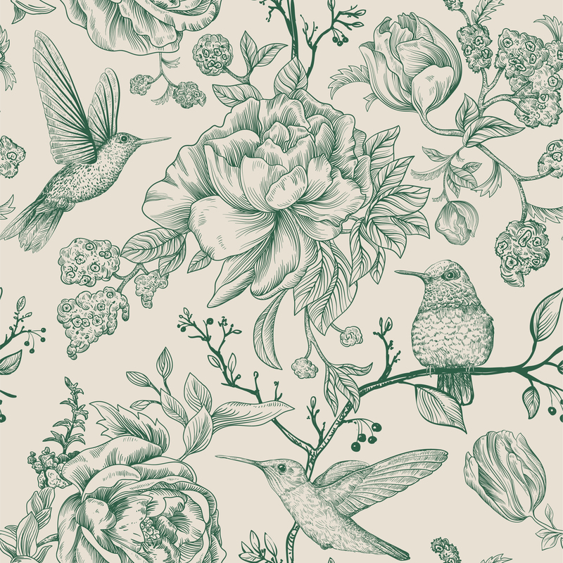 Papier peint à motif : Colibris parmi les fleurs et les feuilles