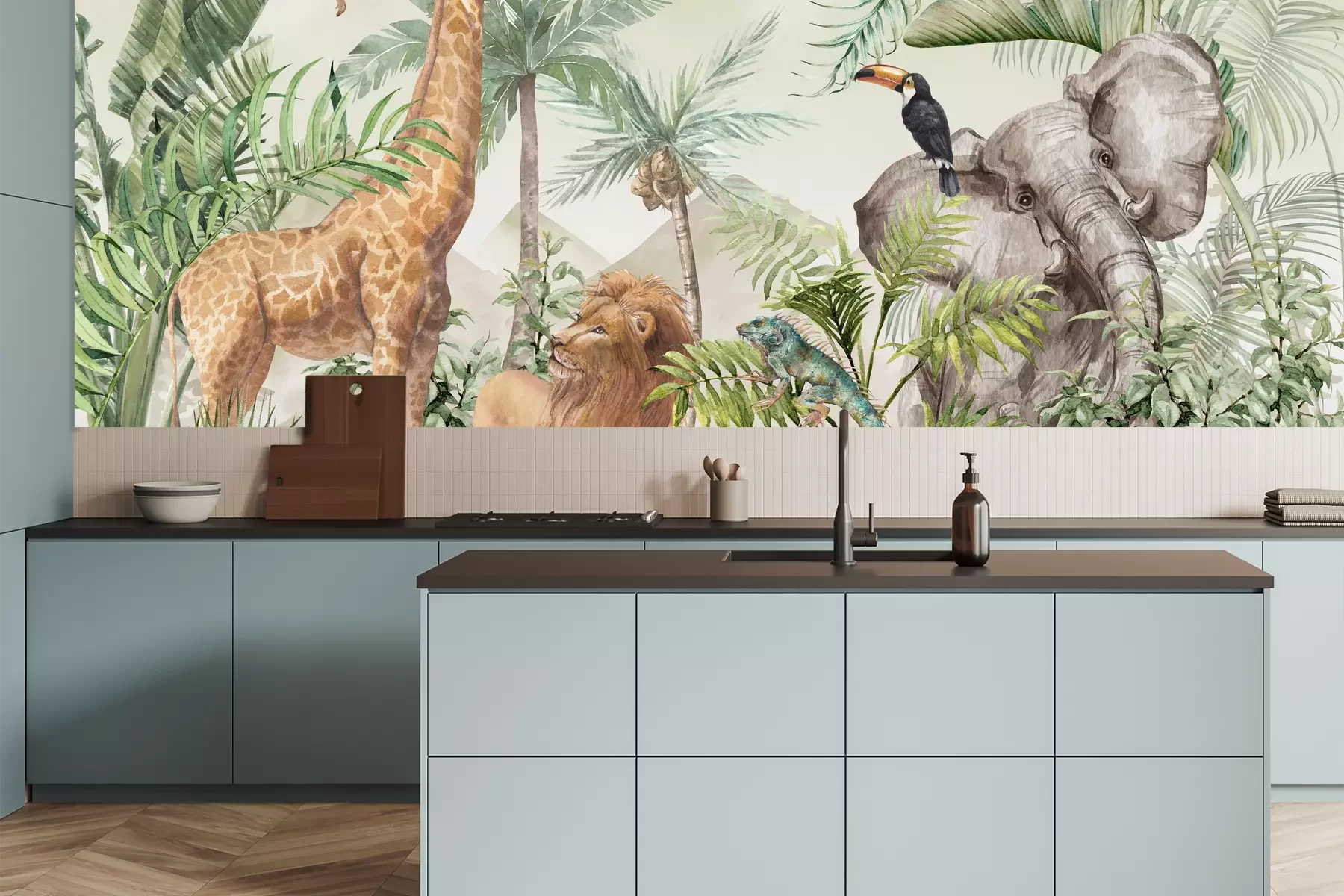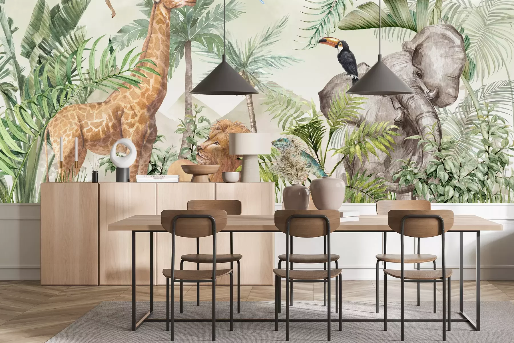 *Le rabais ne s'applique pas aux adhésifs, accessoires et cartes-cadeaux.Ce papier peint exotique et expressif de notre collection est un excellent choix pour les jeunes amoureux de la nature. Ce motif plein de vie, représentant des animaux tropicaux parmi une végétation luxuriante, attire immédiatement l’attention et incite à découvrir les moindres détails. C’est une décoration colorée et inspirante, très appréciée pour les décorations des chambres d’enfants et d’adolescents. Si vous recherchez des accents décoratifs impressionnants capables de donner à votre intérieur un caractère unique, notre papier peint forêt tropicale mérite votre attention. Son style, rappelant une illustration, apportera une atmosphère joyeuse à la chambre, tandis que ses tons verts apaisant favoriseront la concentration pendant les devoirs. Ce motif décoratif créera un bel ensemble avec des meubles en bois naturel : lit, commode, armoires et bureau. Introduisez des plantes exotiques dans la pièce afin de mettre en valeur le charme de notre papier peint jungle. Pour renforcer encore l’effet de votre décoration murale, misez sur la présence d’accessoires adaptés : paniers tressés pour les jouets, coussins moelleux et couvertures dans des tons vert pastel, ainsi qu’un tapis clair à poils courts. Ce papier peint animaux offre bien plus de possibilités décoratives. Ses arbres exotiques créeront une ambiance unique dans les crèches ou les espaces de jeux. Dans de tels lieux, les avantages pratiques de notre papier peint forêt tropicale prennent une importance particulière. Grâce à la qualité de l’impression, il conservera une apparence impeccable et des couleurs intenses pendant de longues années. Dans les pièces principalement utilisées par les enfants, sa non-toxicité, sa facilité de nettoyage et sa résistance aux rayures sont également essentielles. Vous apprécierez aussi la pose rapide et sans problème qu’offre notre papier peint jungle. Les tons verts de la nature et les animaux exotiques représentés sur le motif transformeront vos murs sans risque de formation de bulles d’air. Cette forêt tropicale impressionnante est un choix qui apportera chaleur et convivialité à votre intérieur. Placée sur un mur, elle peut inspirer de nombreux jeux et faire en sorte que les enfants se sentent pleinement à l’aise – que ce soit dans leur propre chambre ou dans une classe de maternelle.