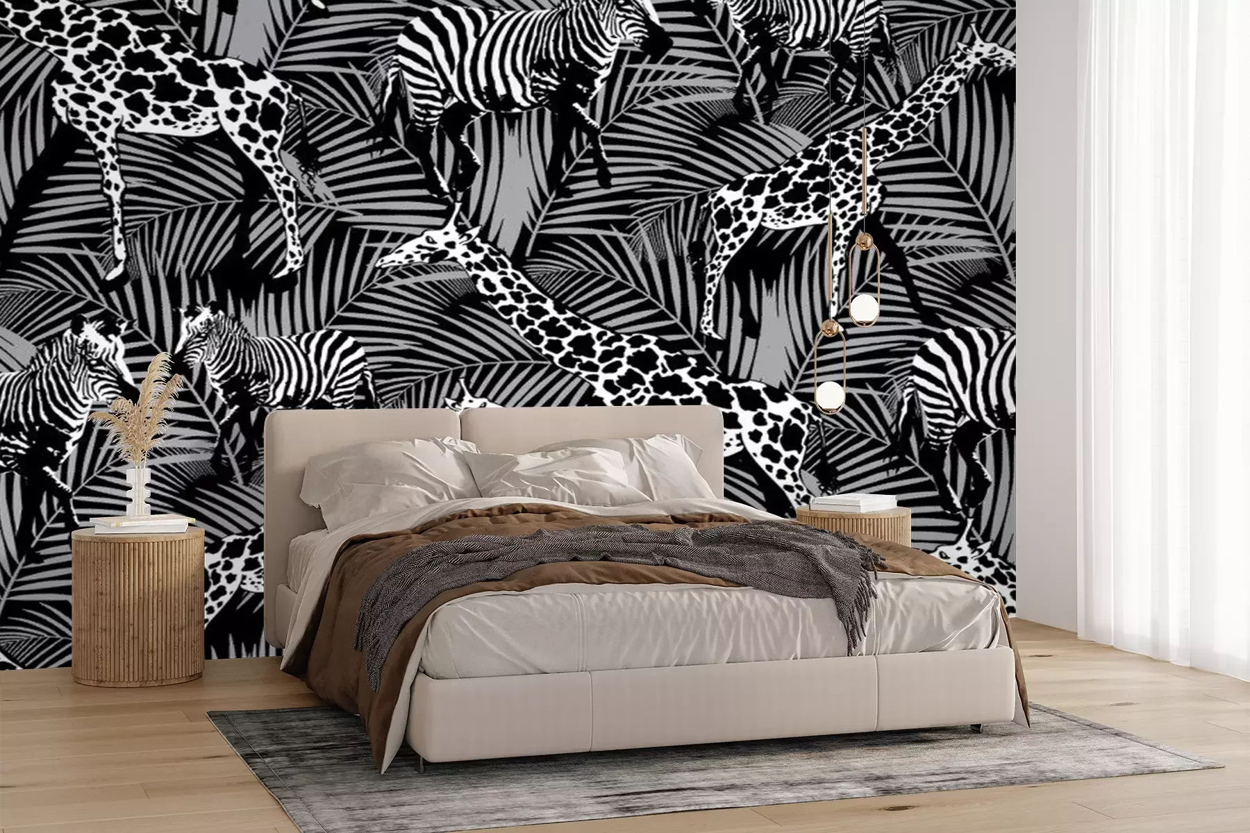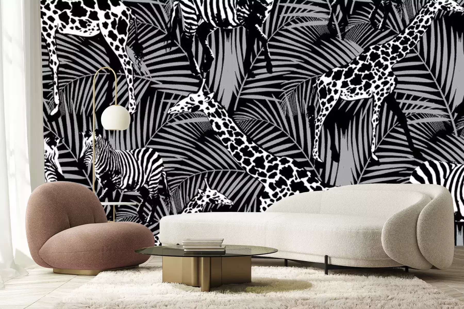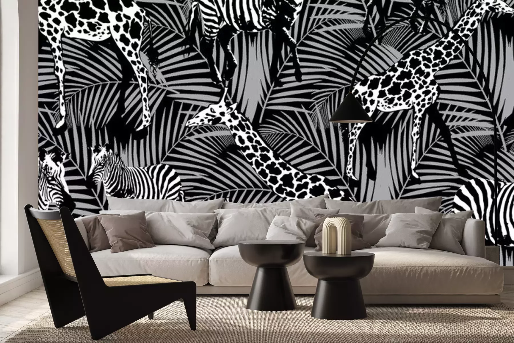 Papier peint  Animaux tropicaux sur un fond recouvert de feuilles