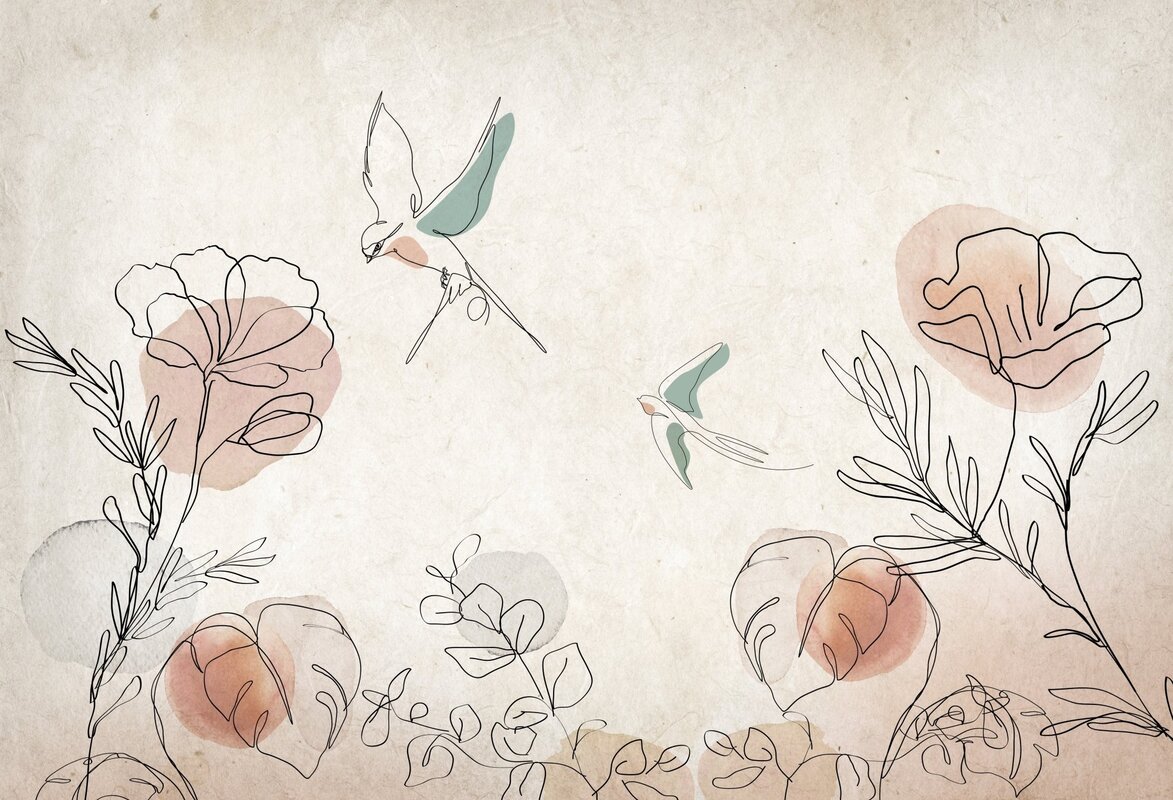 Papier peint : Aquarelle abstraite de fleurs et d’oiseaux