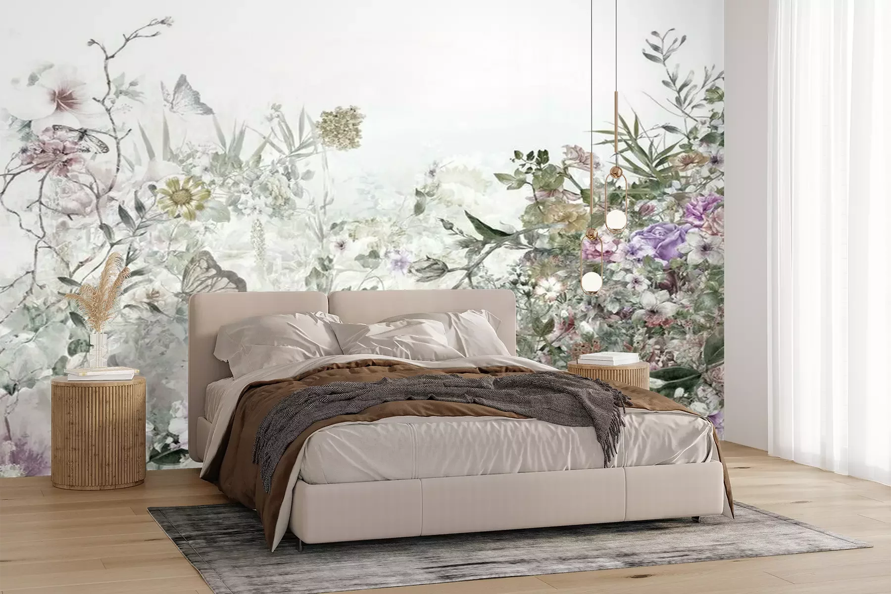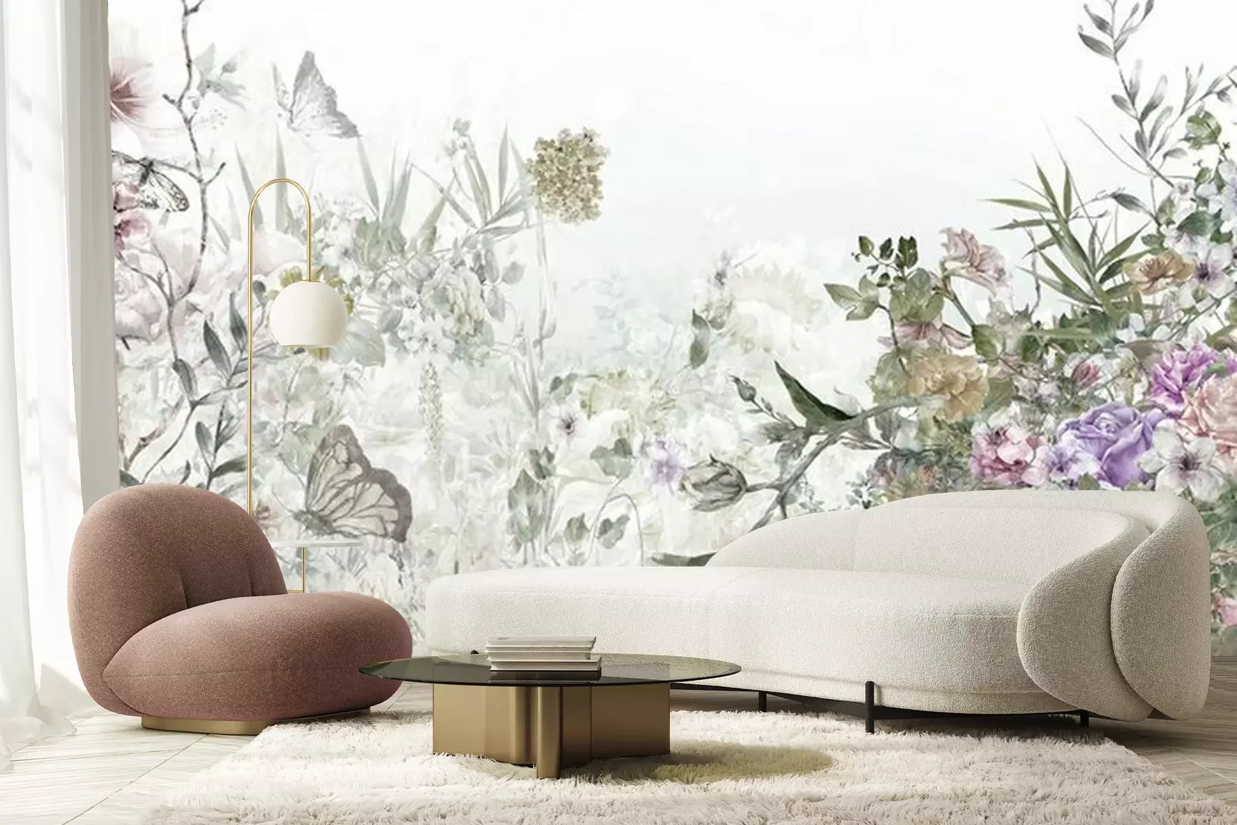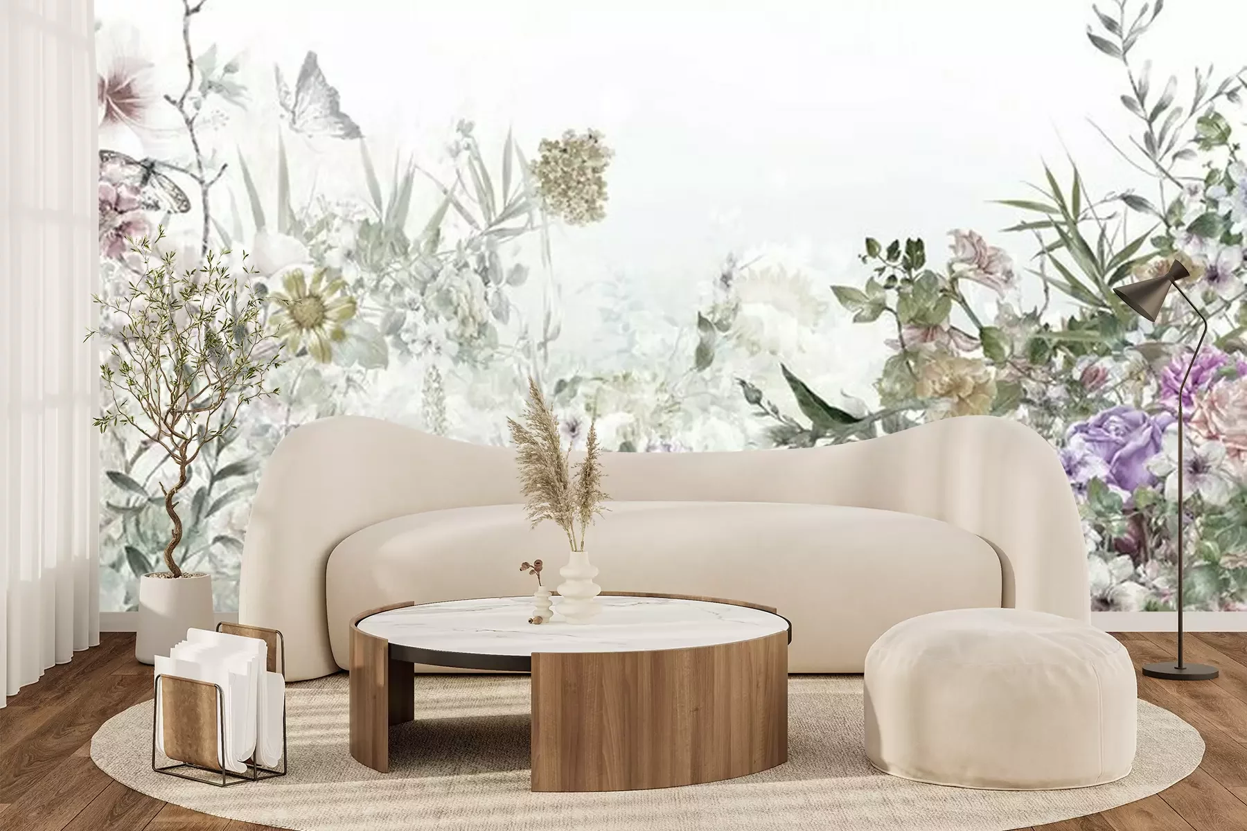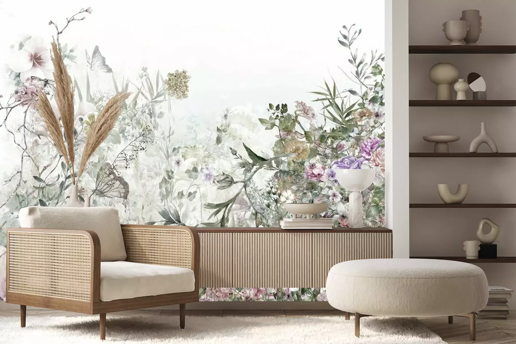 Papier peint  Aquarelle de feuilles et de fleurs, sur fond blanc
