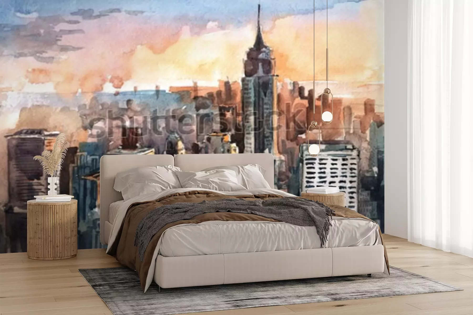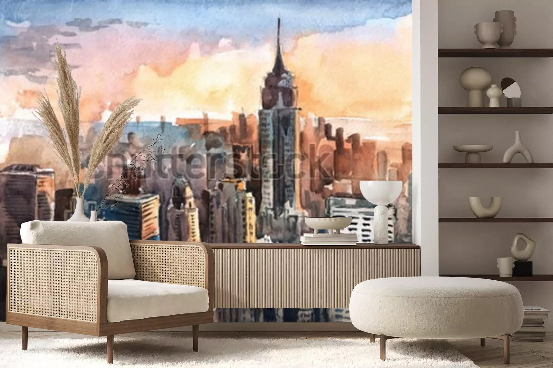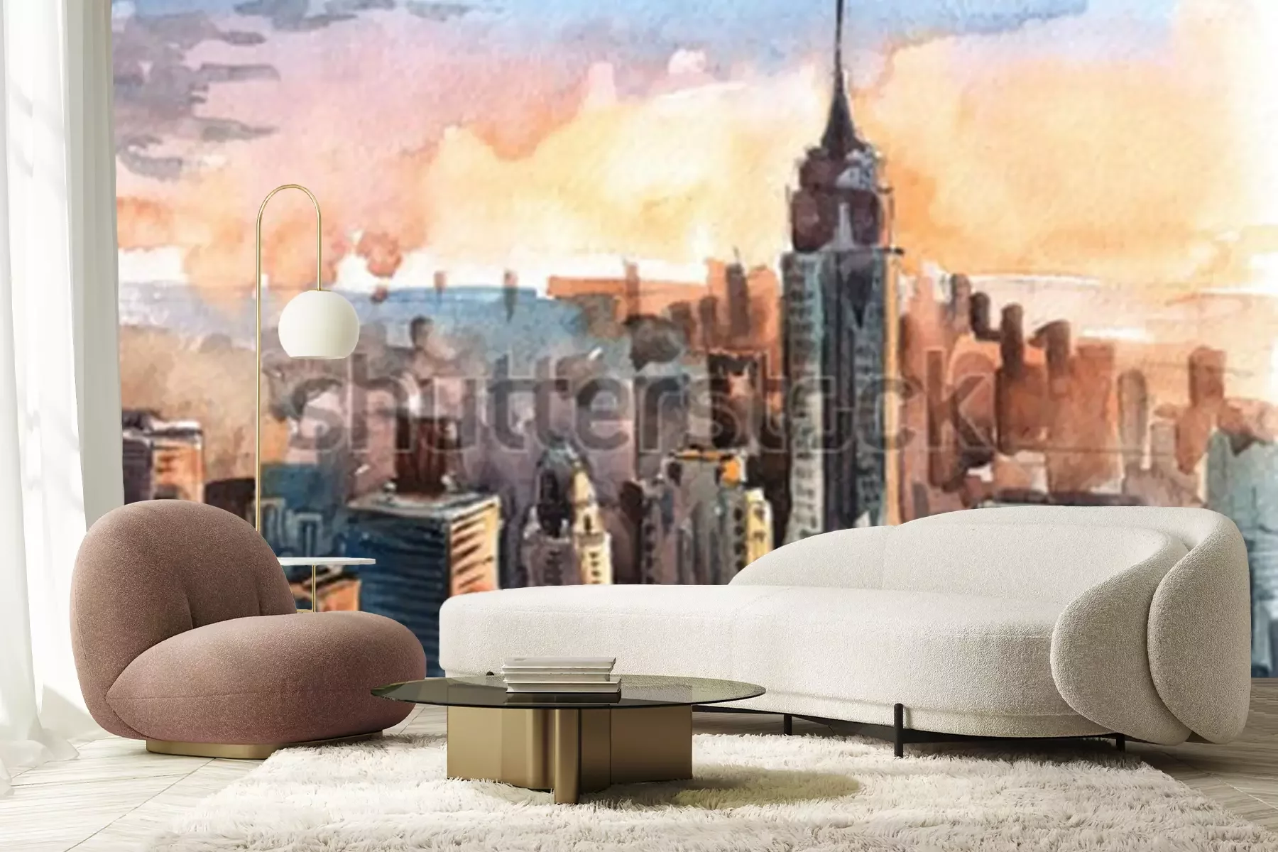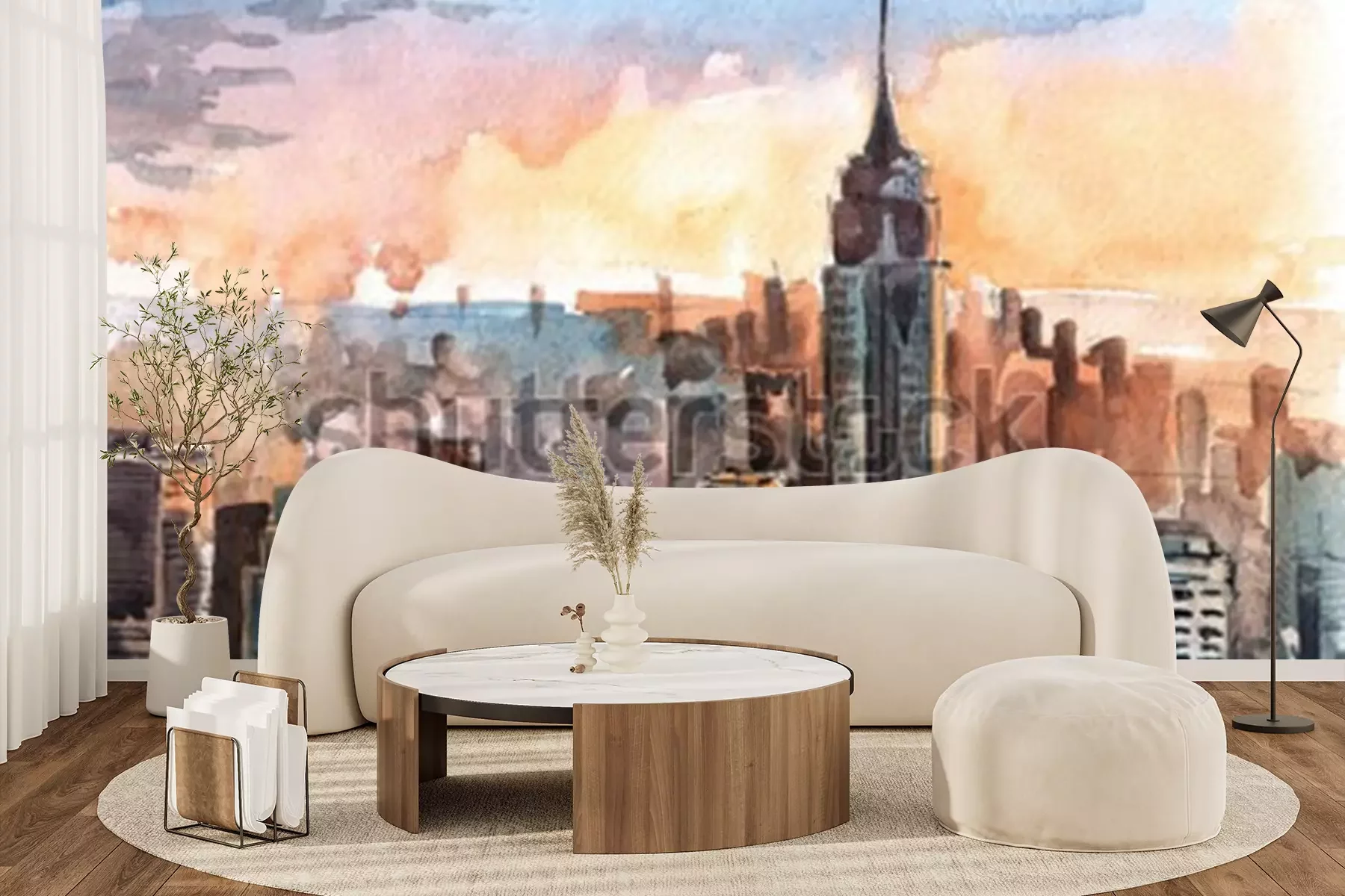 Papier peint  Aquarelle de gratte-ciel de Manhattan au coucher du soleil - Circuits de la ville de New York