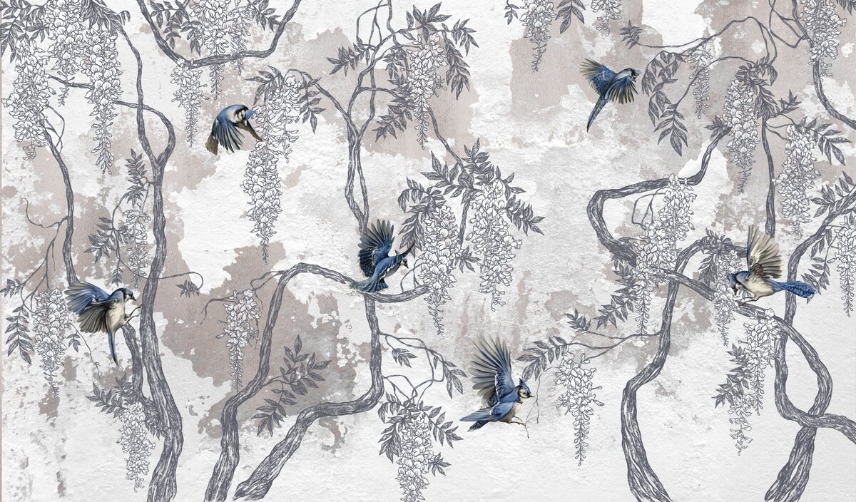 Papier peint : Arbres fleuris avec des oiseaux sur béton