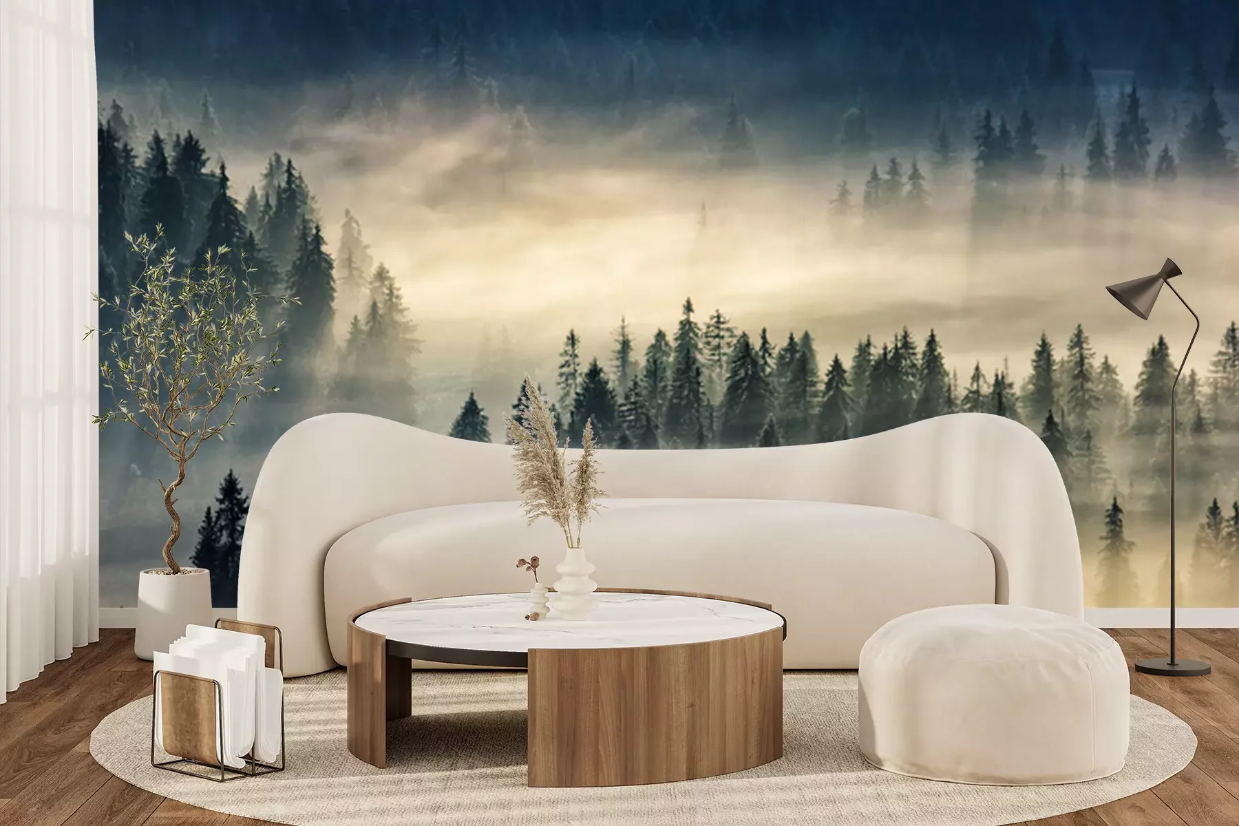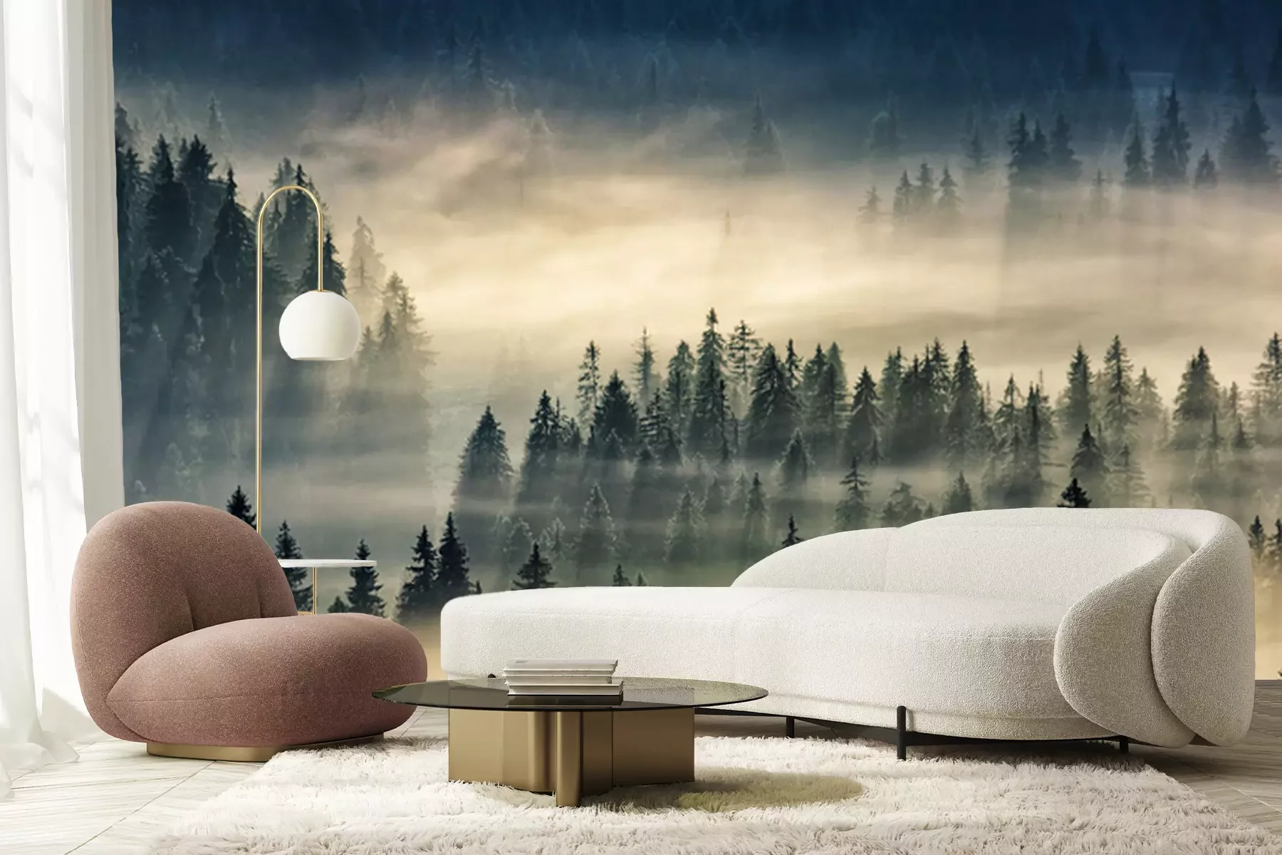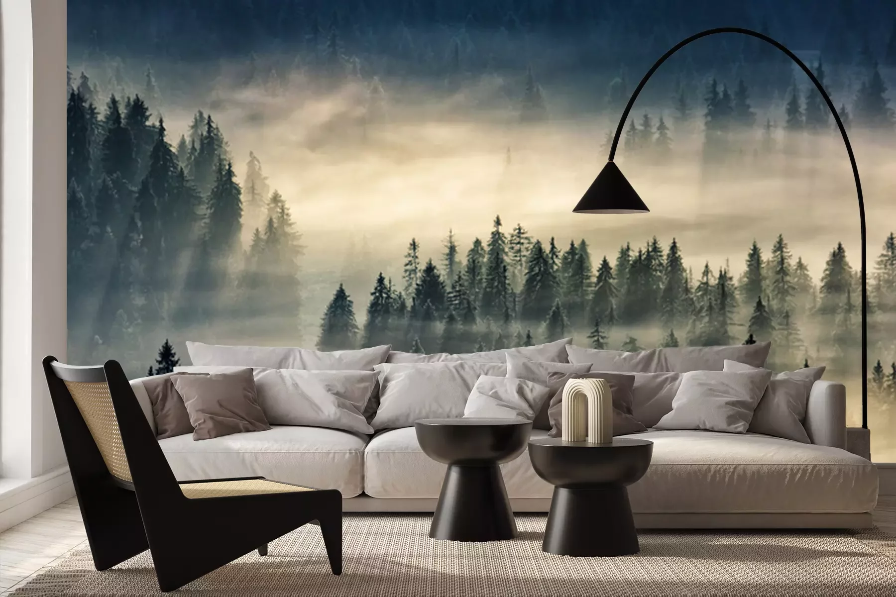Papier peint  Arbres noirs enveloppés d'une brume jaunâtre