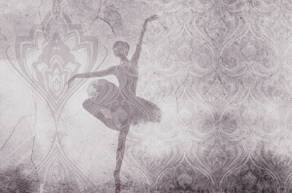 Papier peint : Ballerine en mouvement sur fond en béton avec des ornements décoratifs