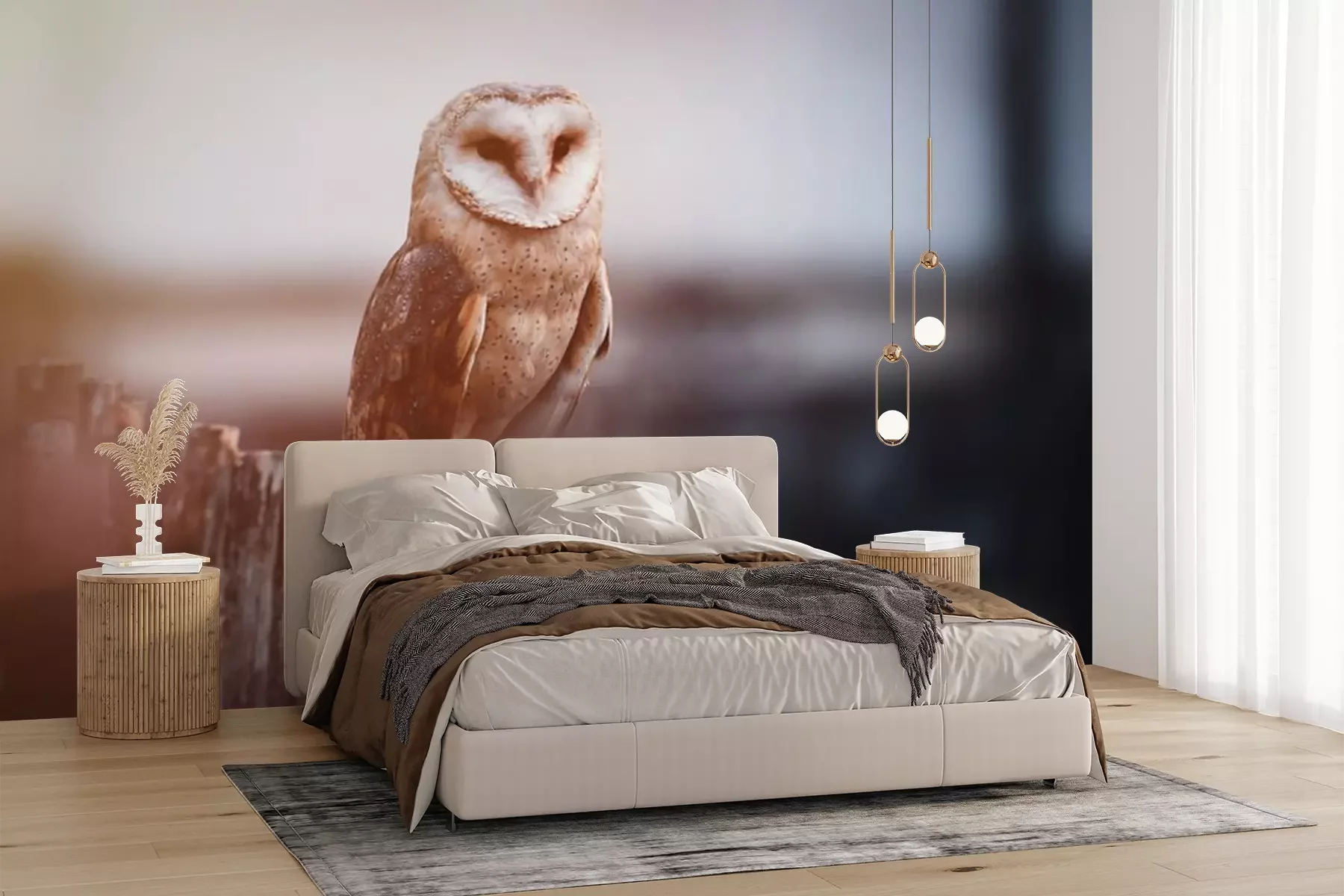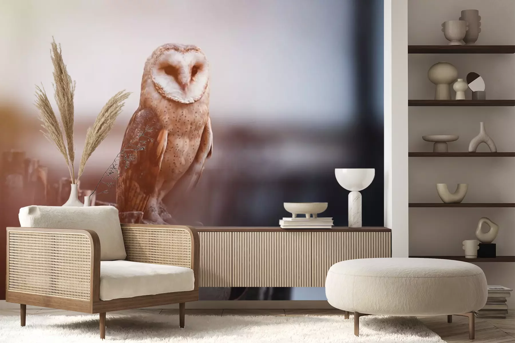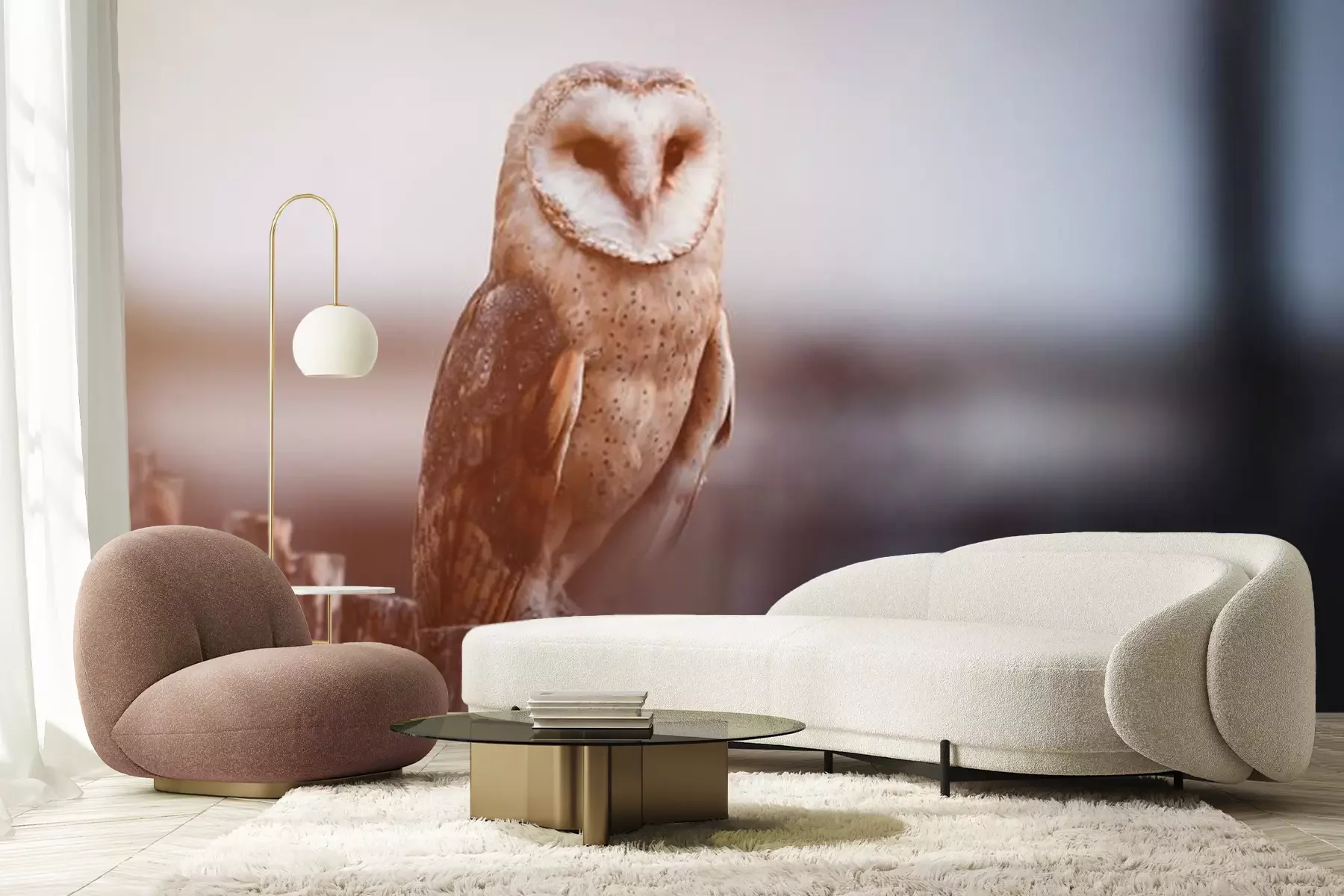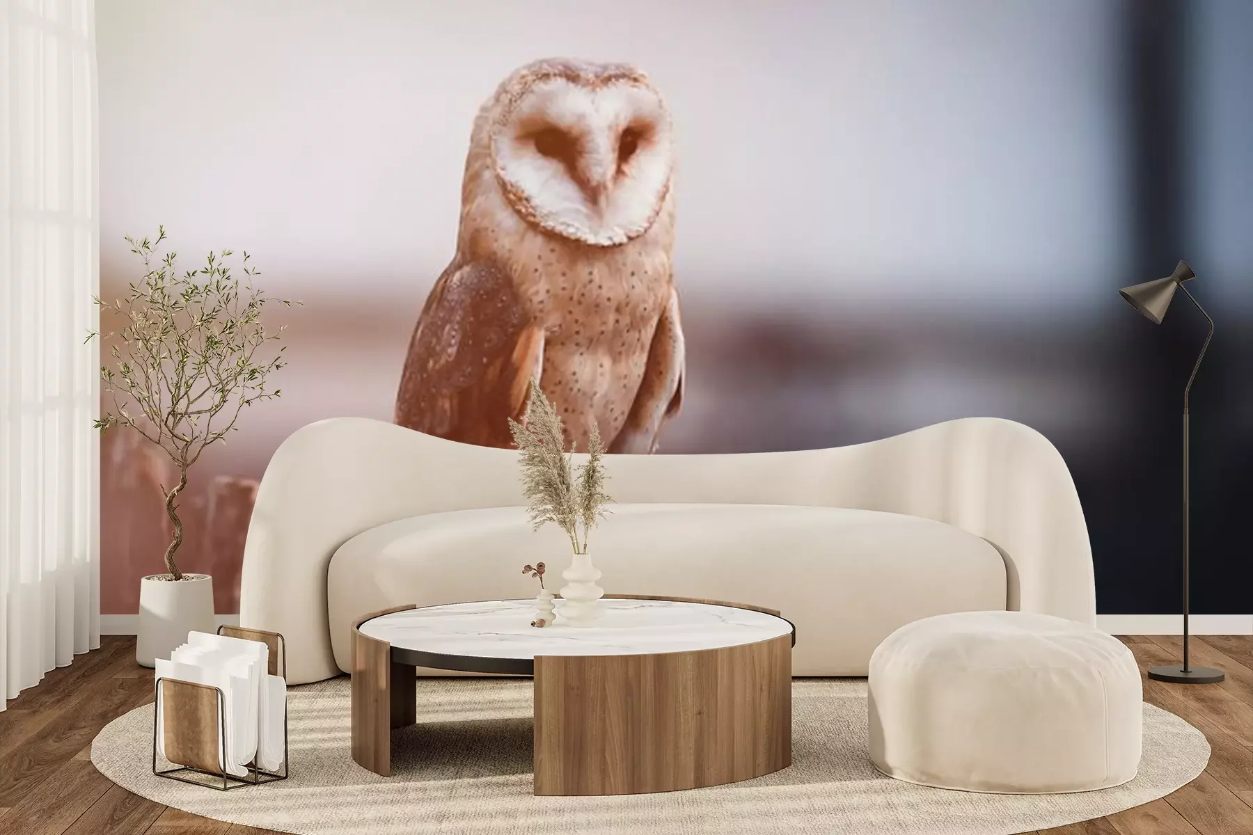 Papier peint  Barn owl (Tyto alba) sitting on a wooden fence. Winter village in background. Barn owl portrait. Owl sitting on fence. Owl on fence.