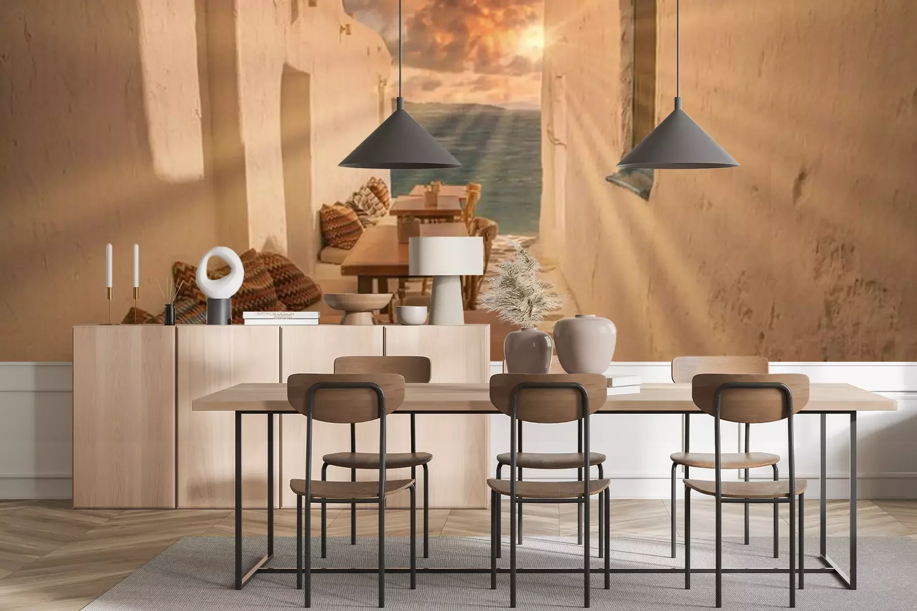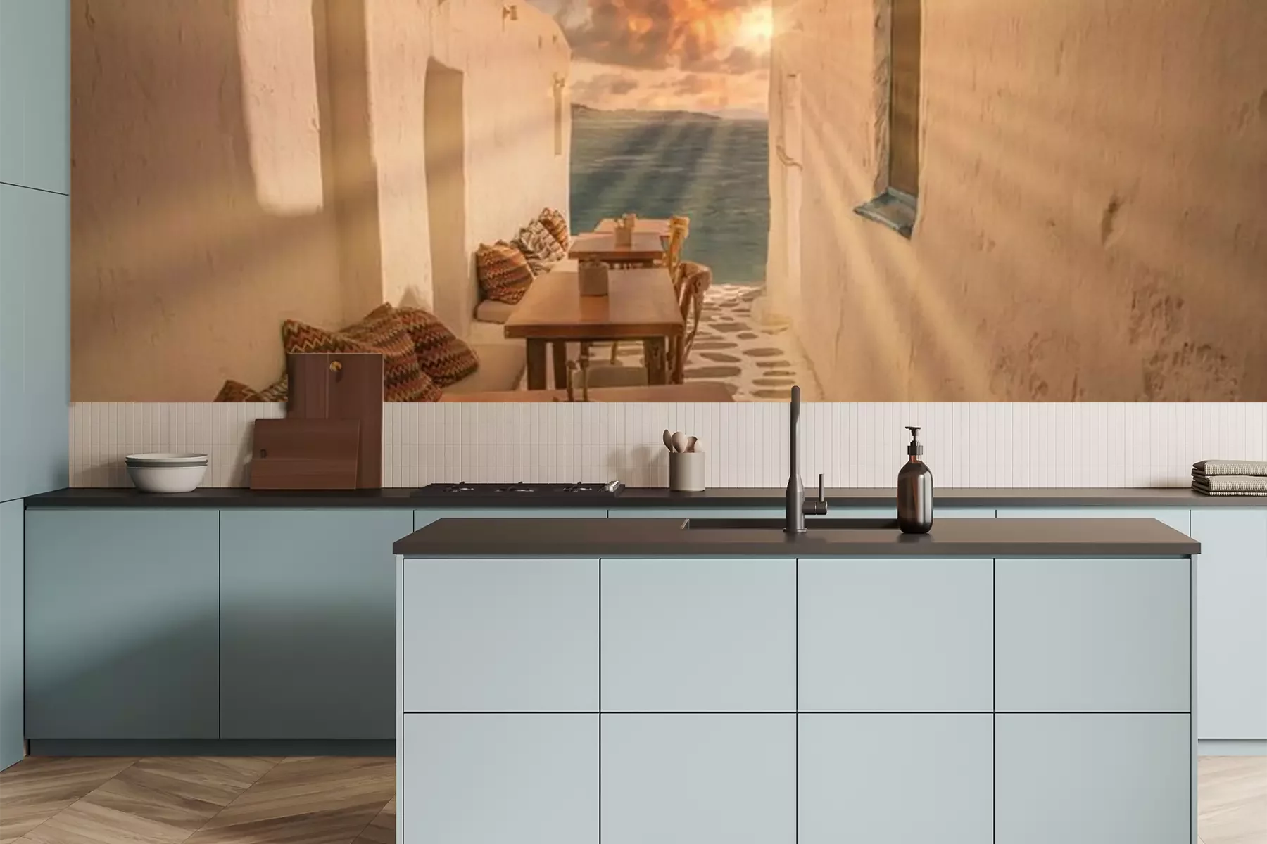 Papier peint  Benches with pillows in a typical Greek bar in Mykonos town with sea view, Cyclades islands, Greece. Travel concept.