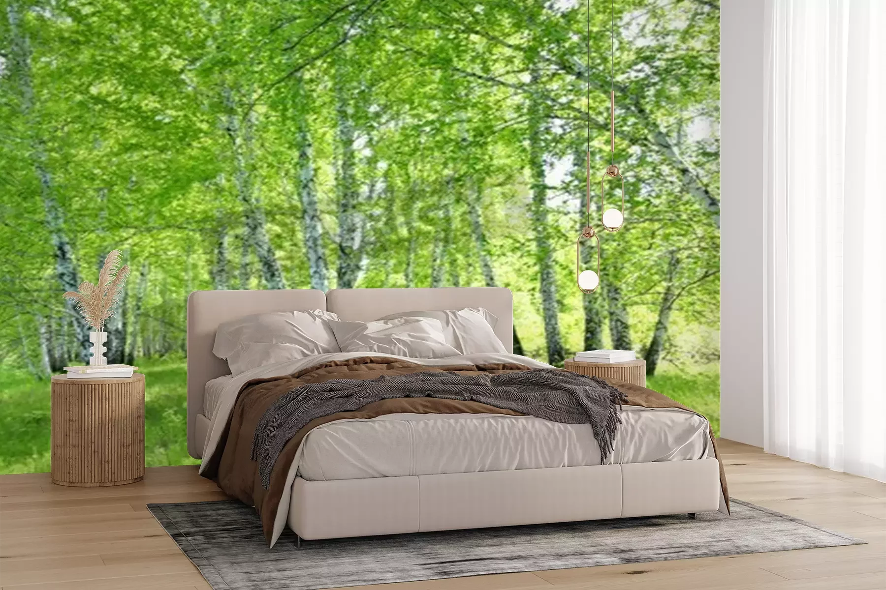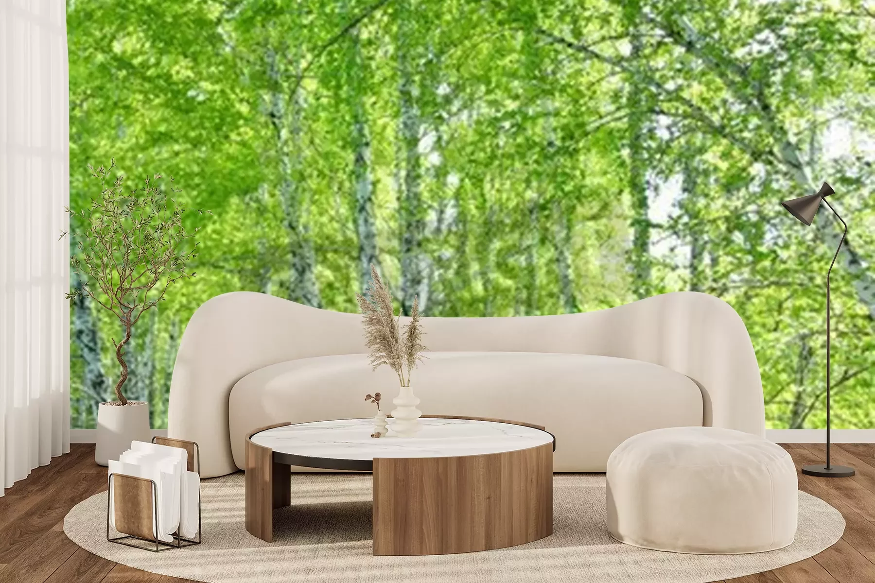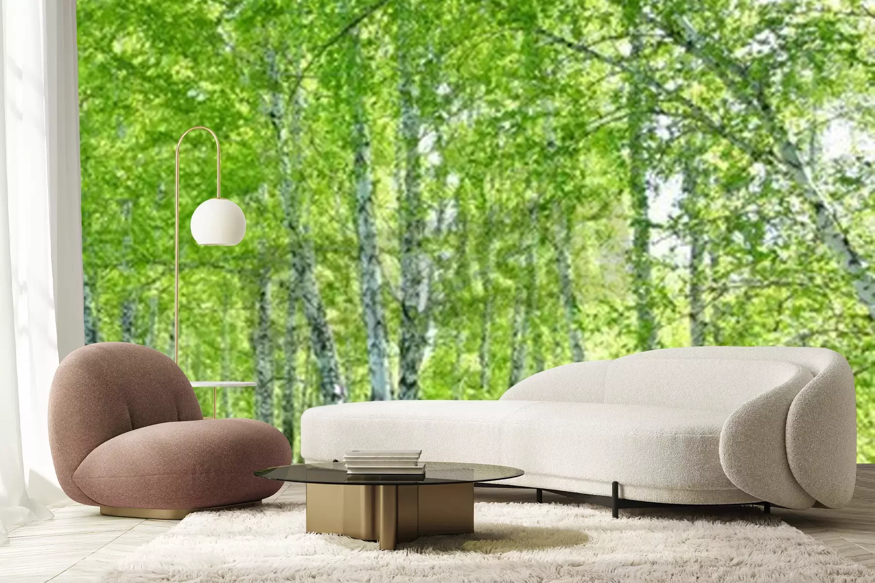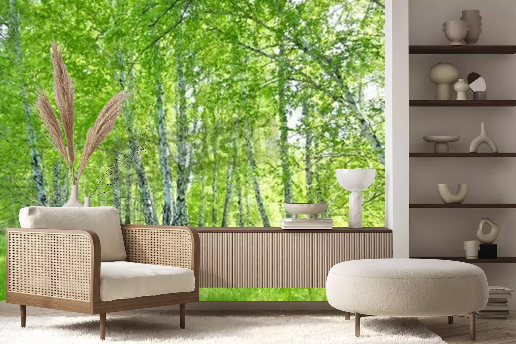 Papier peint  Bouleaux noirs et blancs avec des feuilles