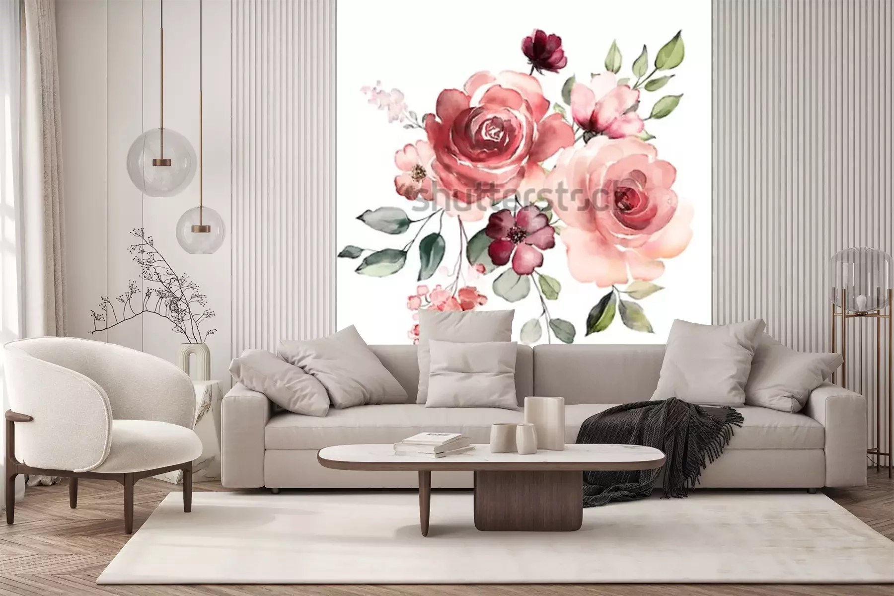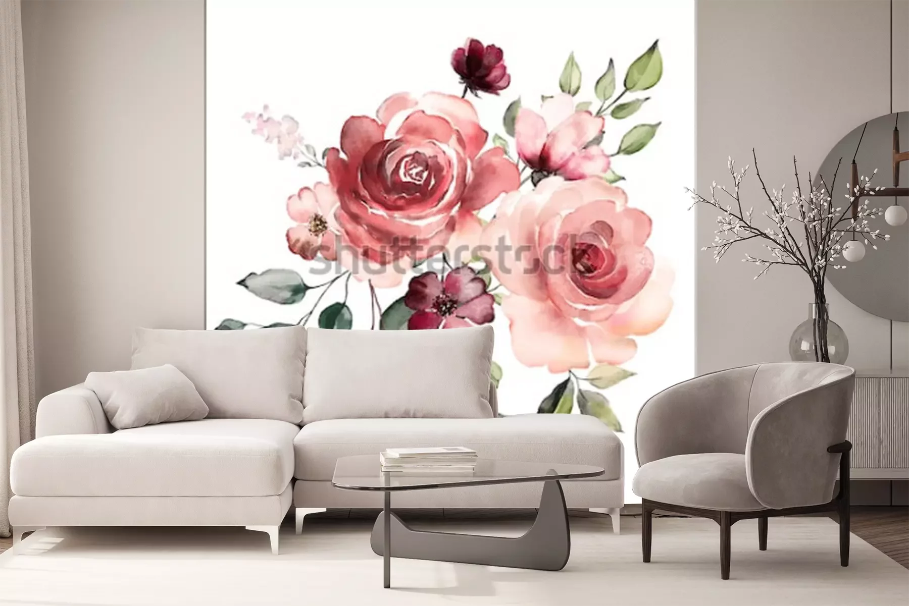 Papier peint  Bouquet de roses et feuilles aquarelle