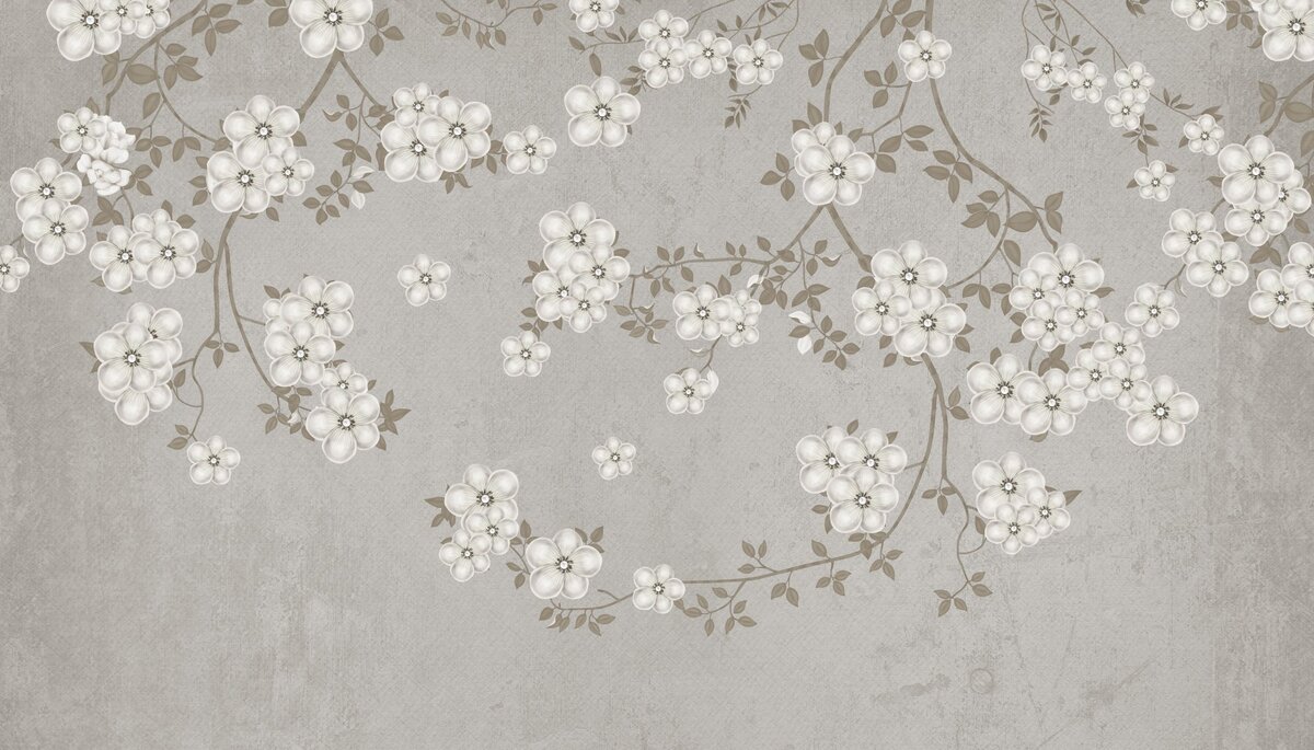 Papier peint : Branches avec des fleurs blanches sur béton