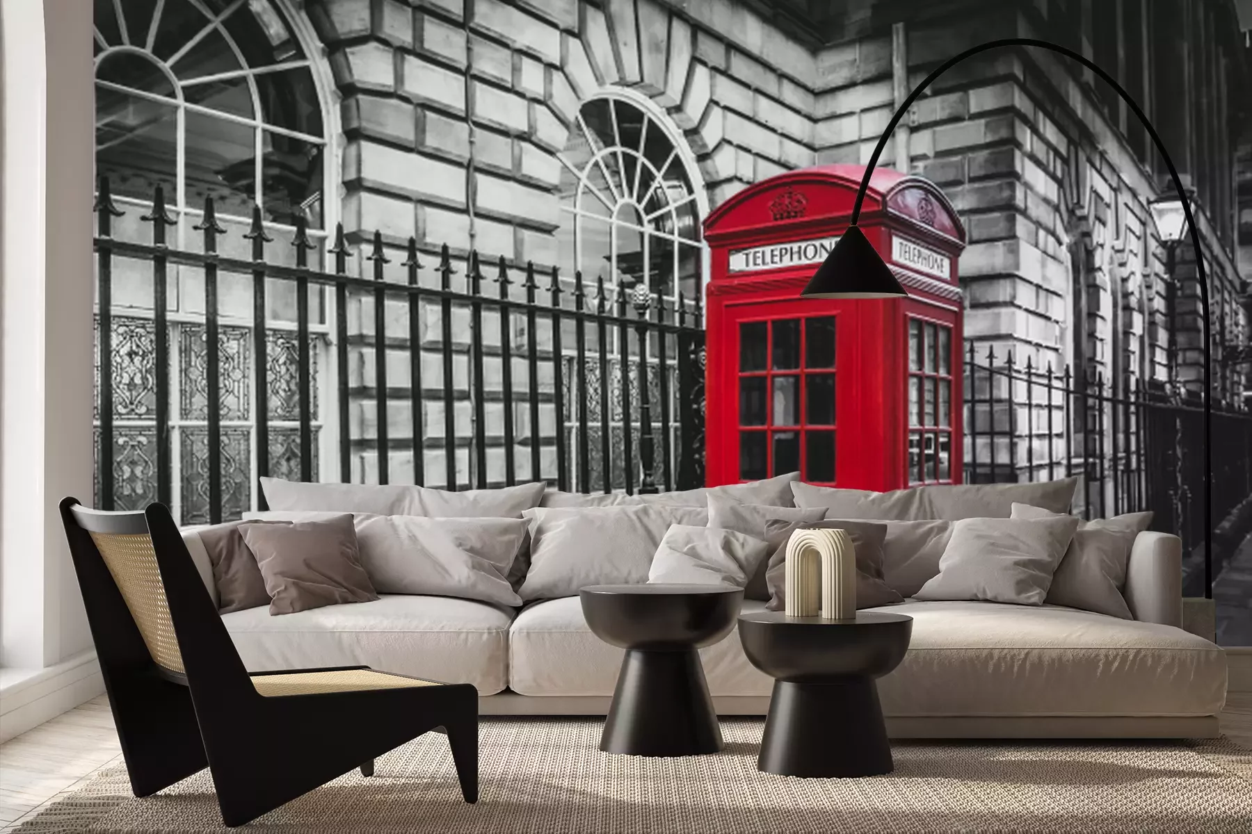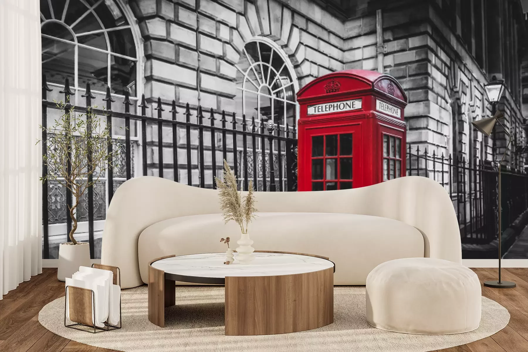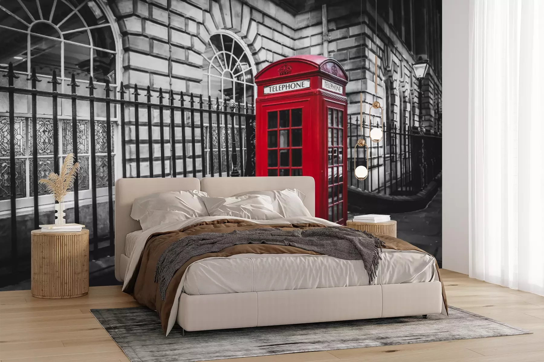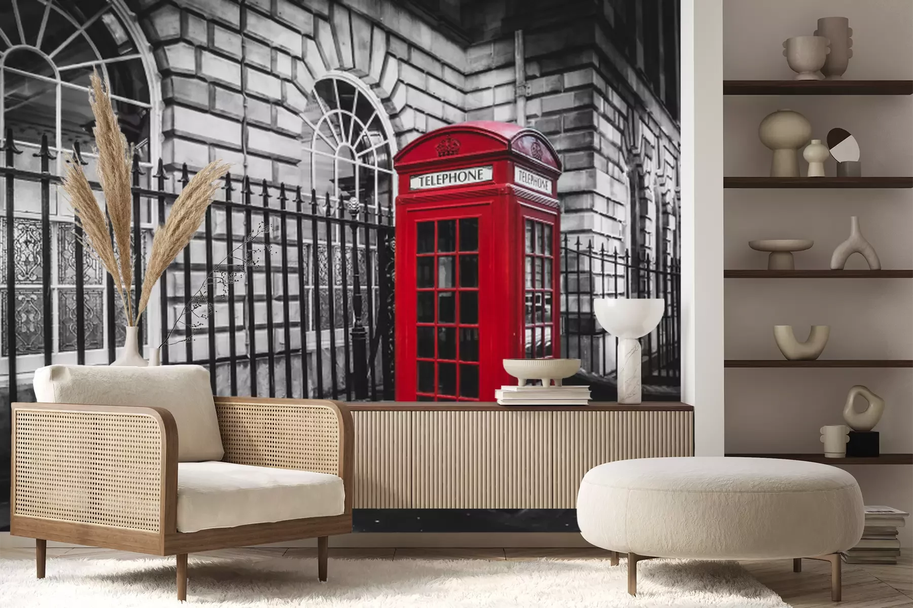 Papier peint  Cabine téléphonique rouge sur fond noir et blanc