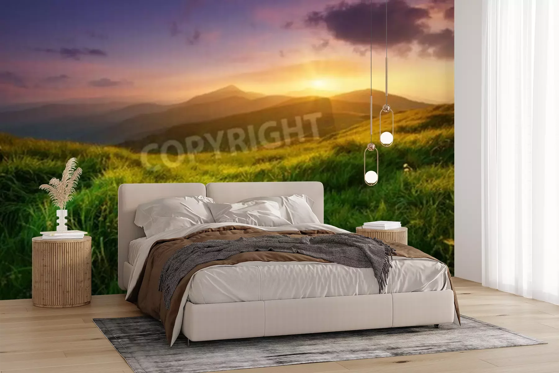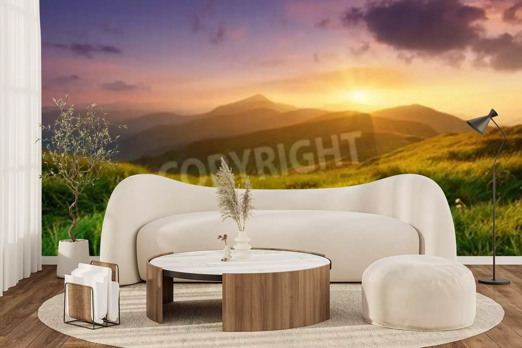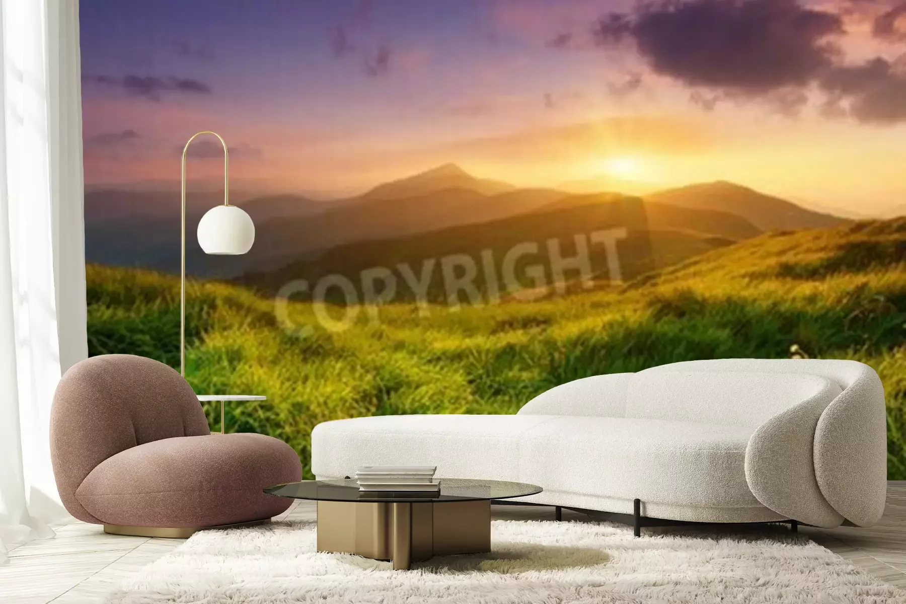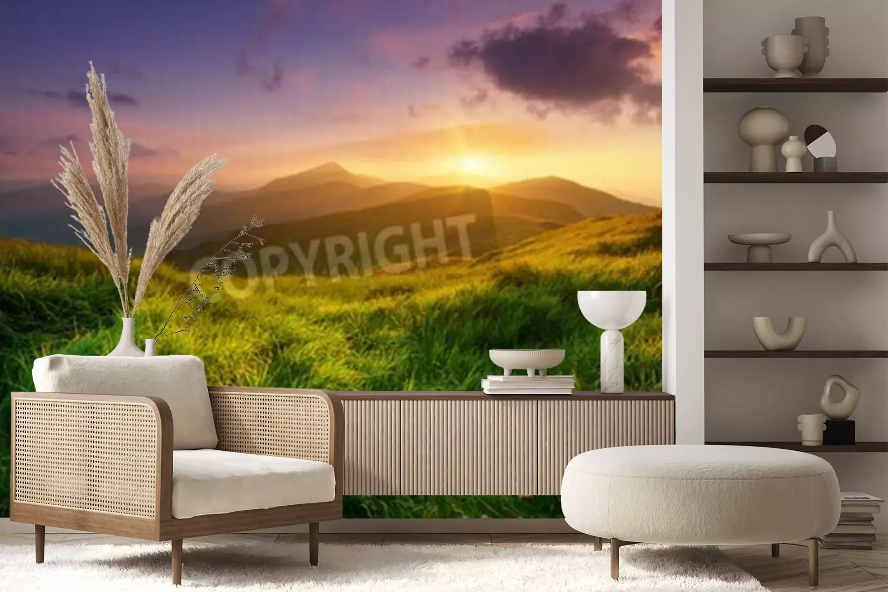 Papier peint  Champ d'herbe et montagnes au coucher du soleil