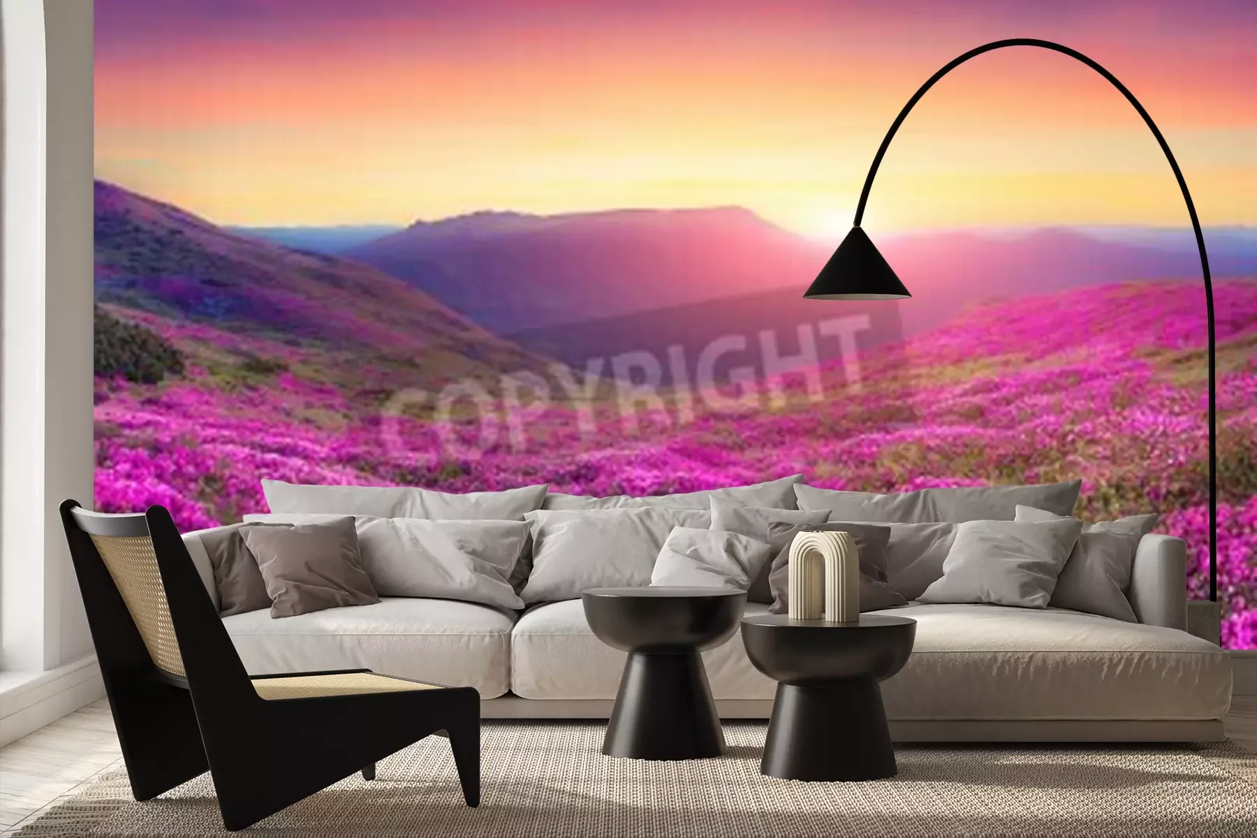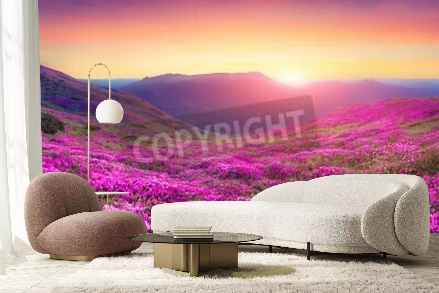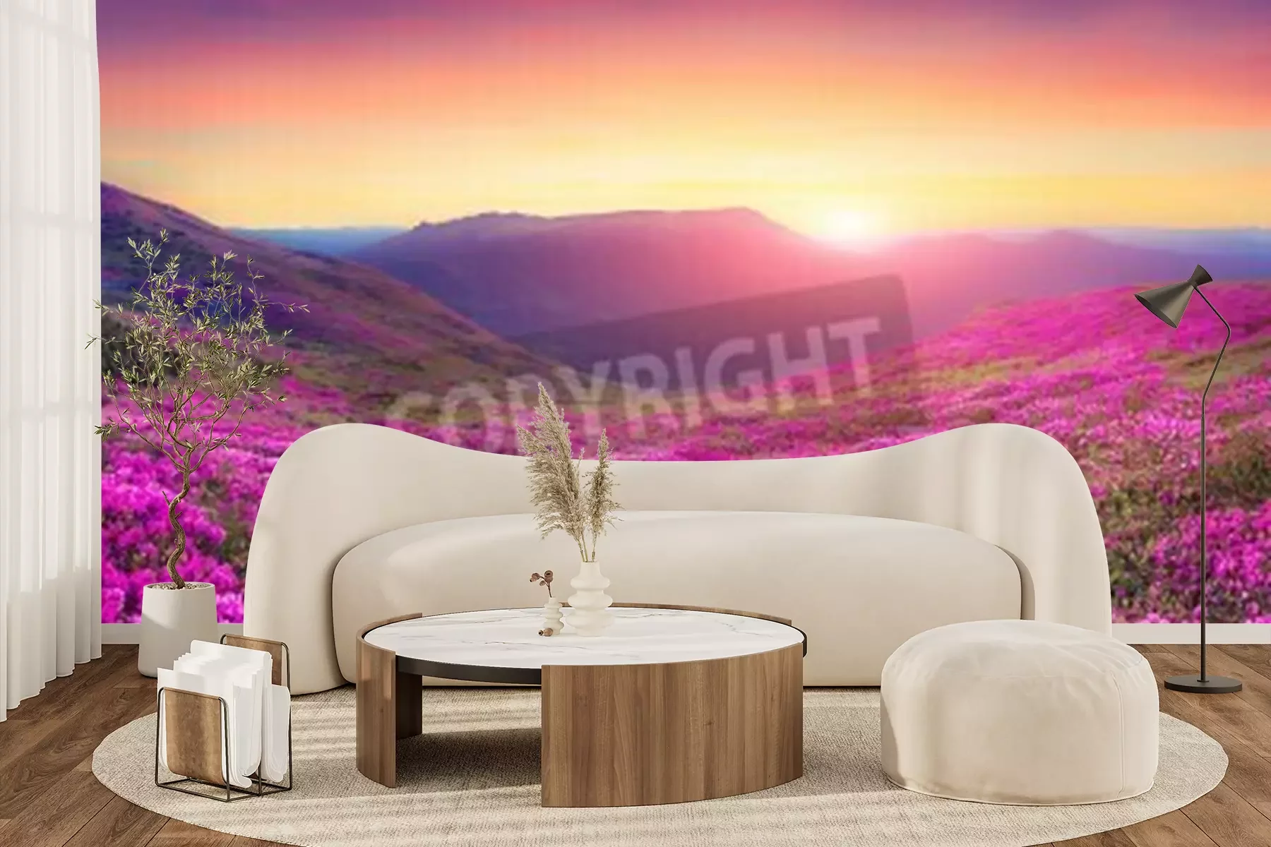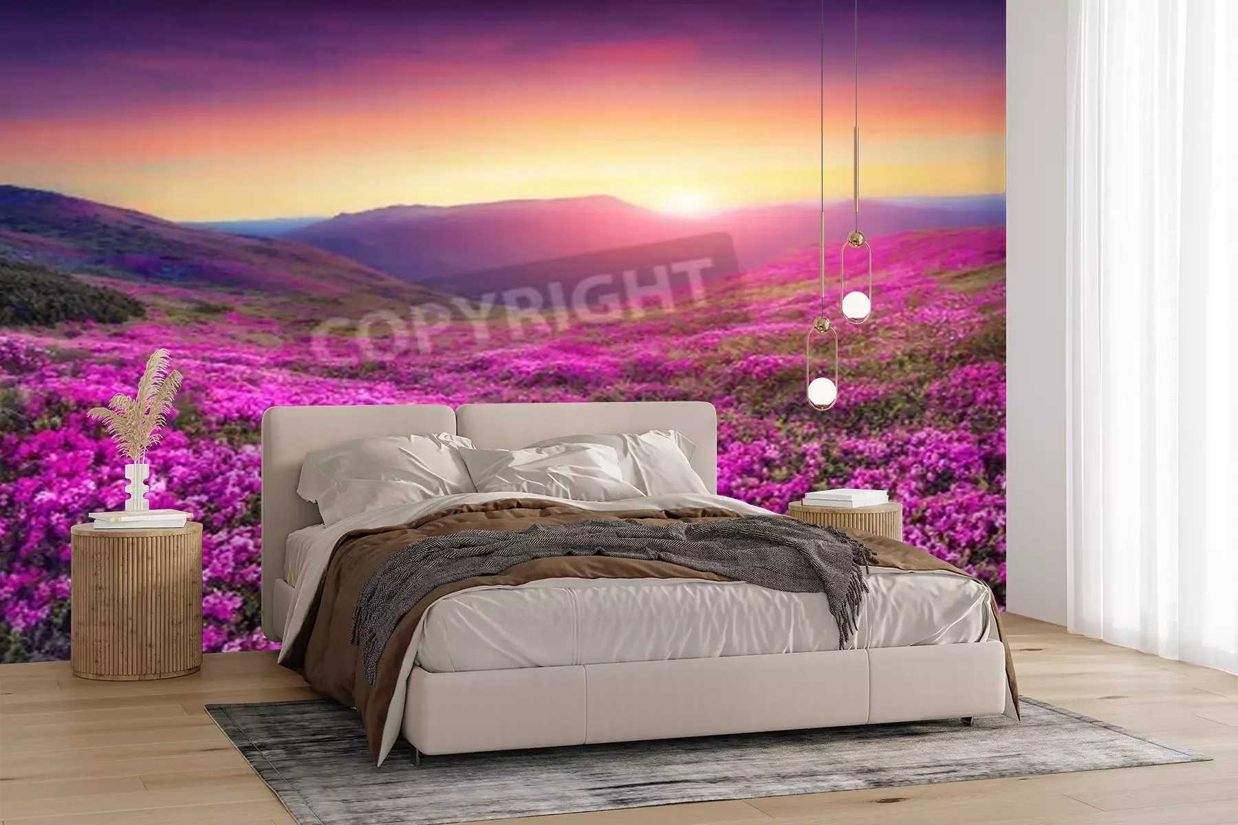 Papier peint  Champ de fleurs au lever du soleil