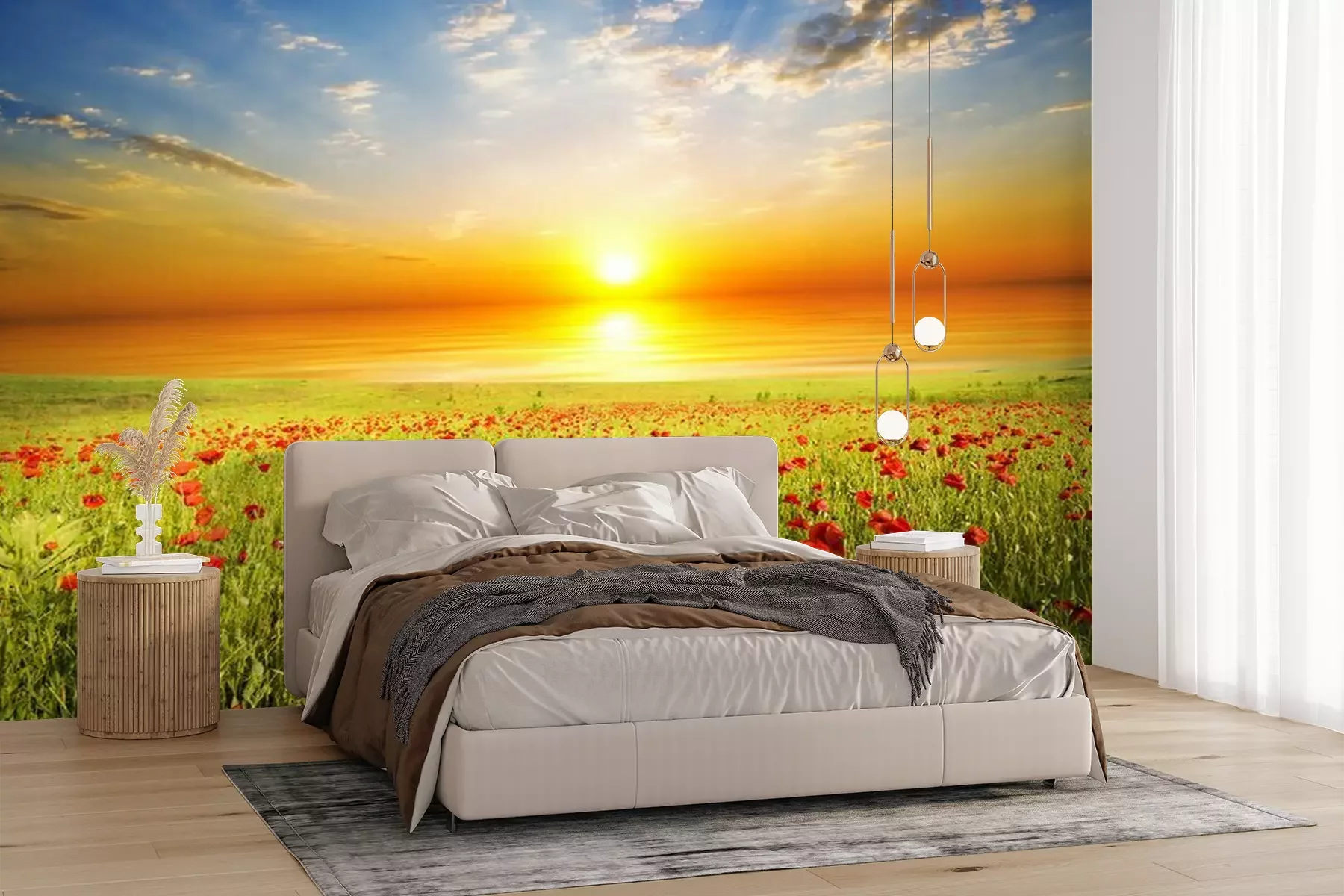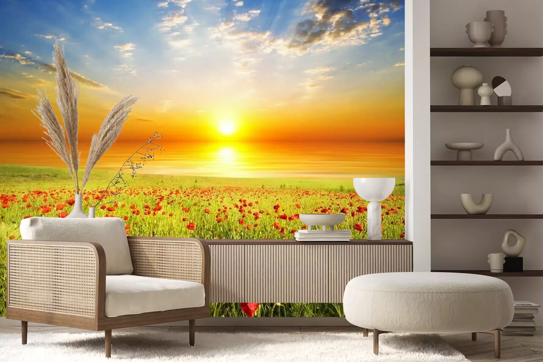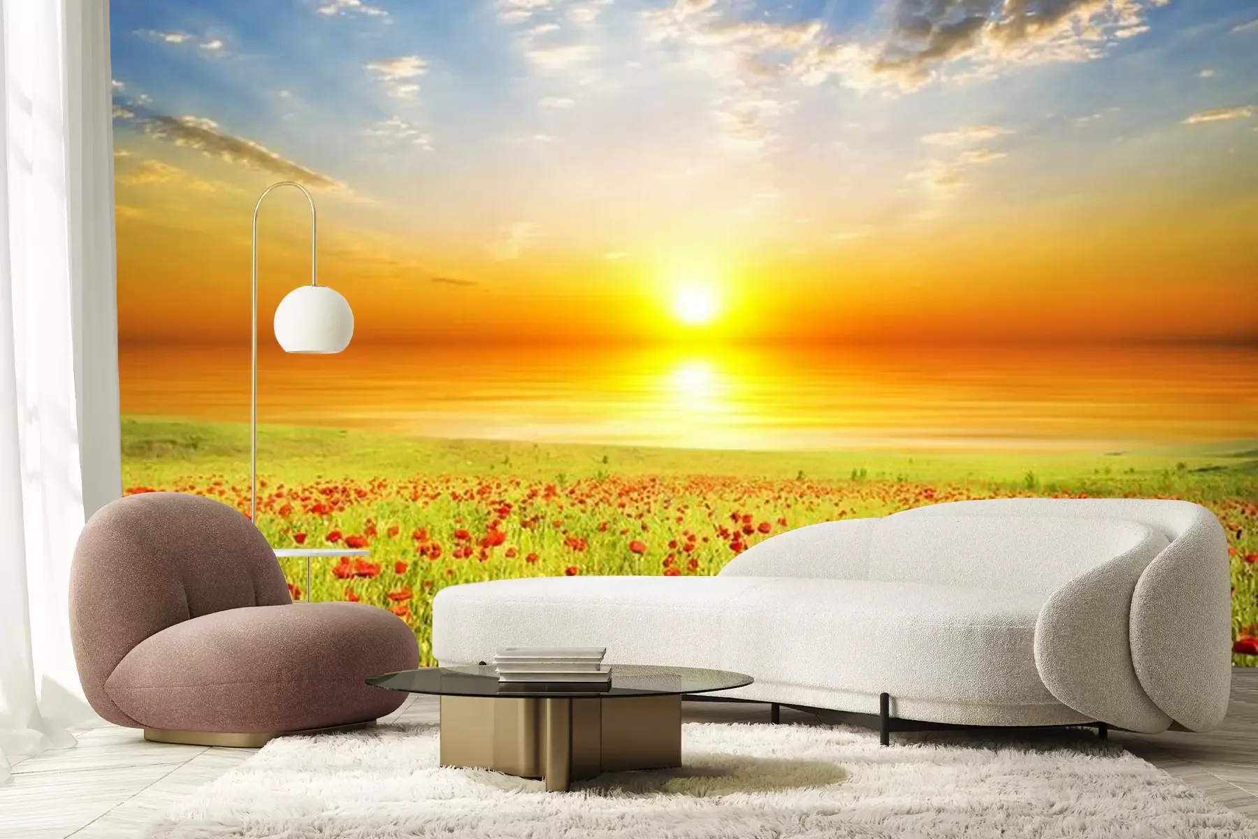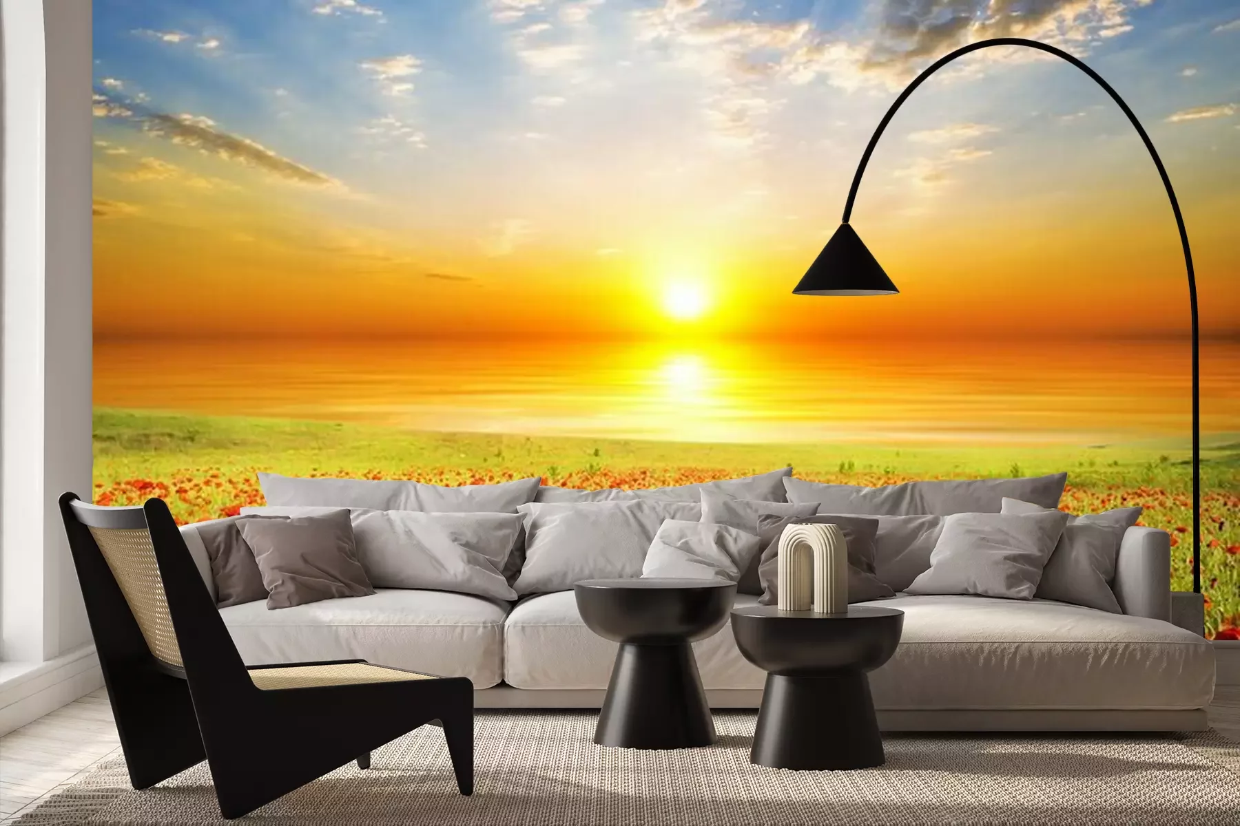 Papier peint  Champ de fleurs mer et coucher de soleil