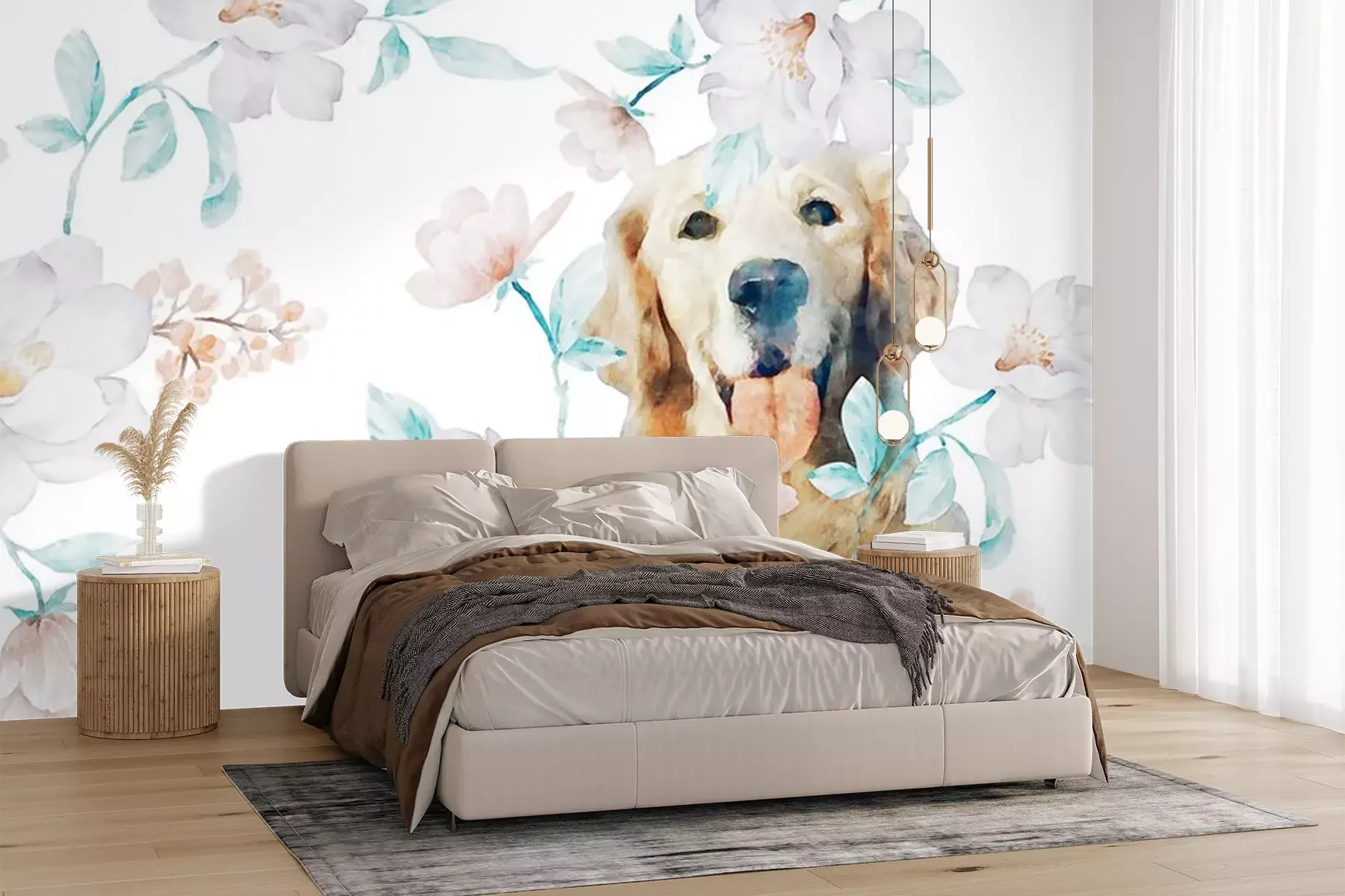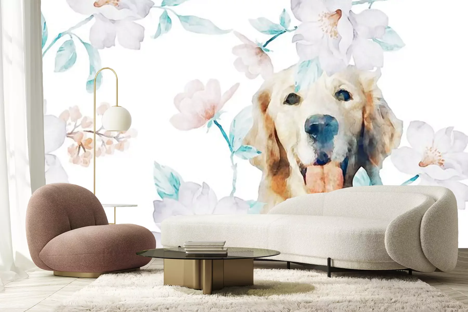 Papier peint  Charmant chien au milieu de fleurs aquarellées sur un fond blanc