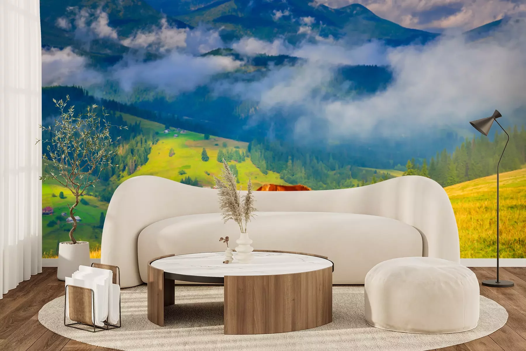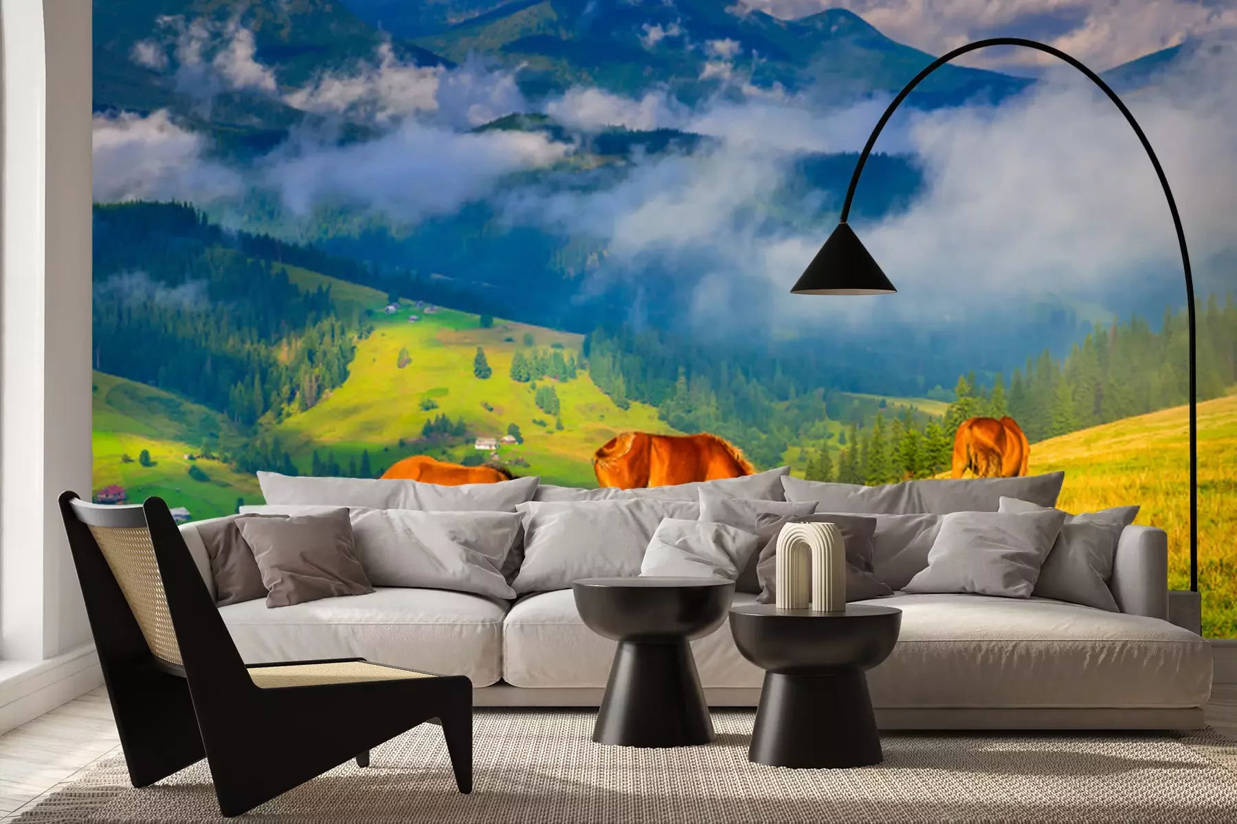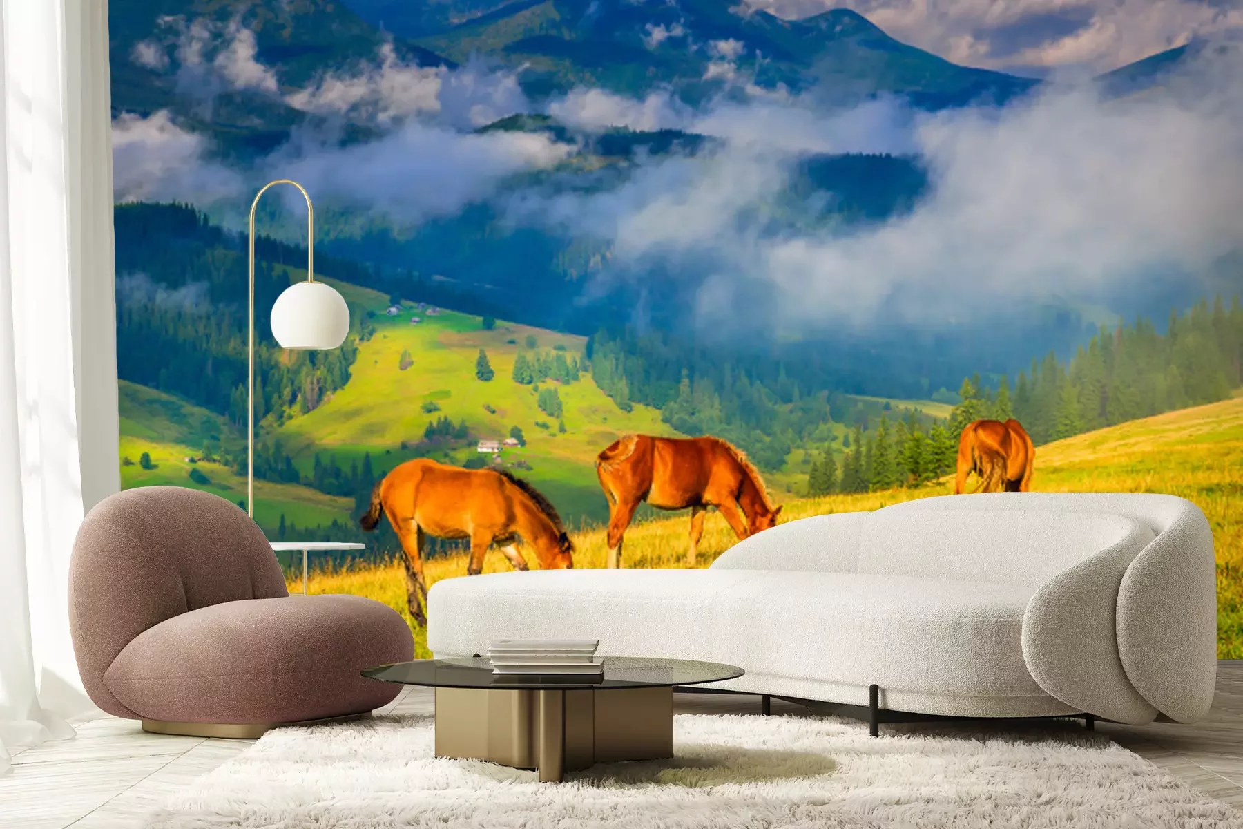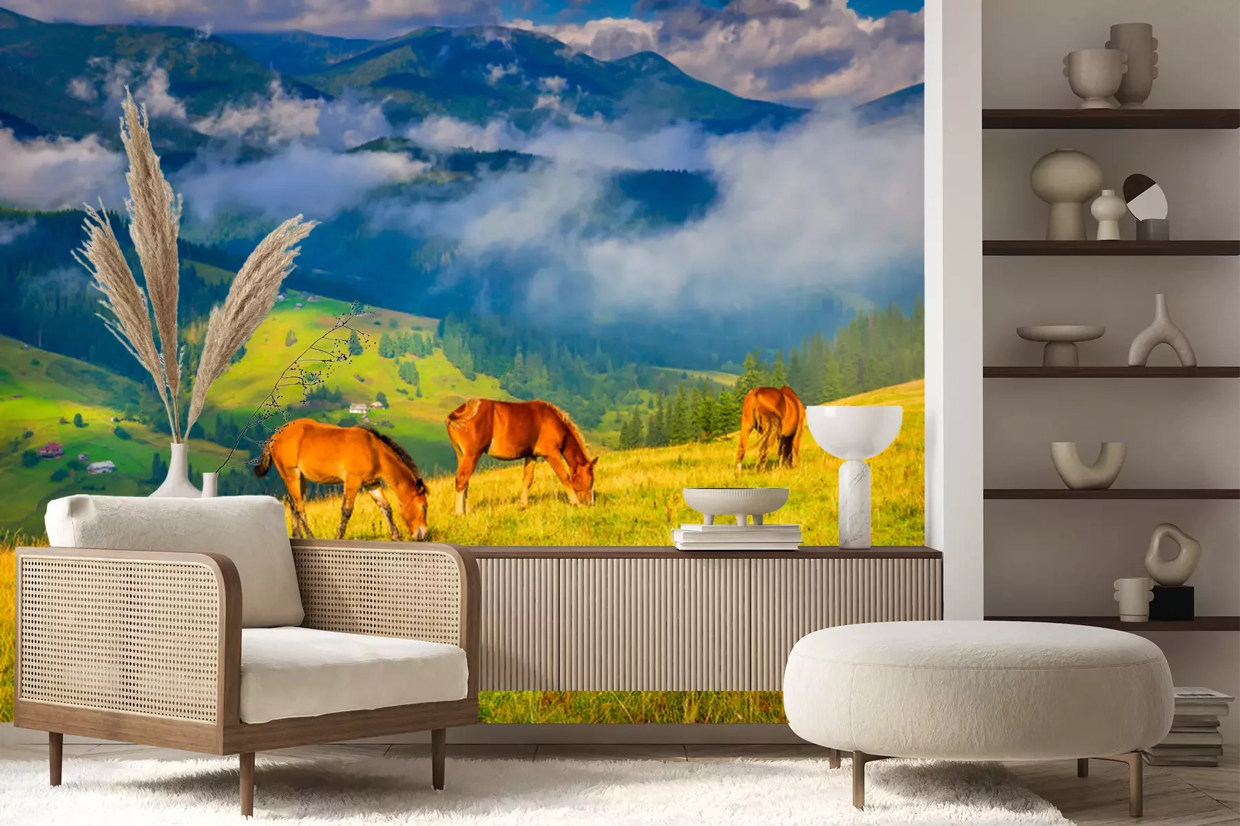 Chevaux dans une prairie près des montagnesLivraison sans problème assurée par des transporteurs de confiance