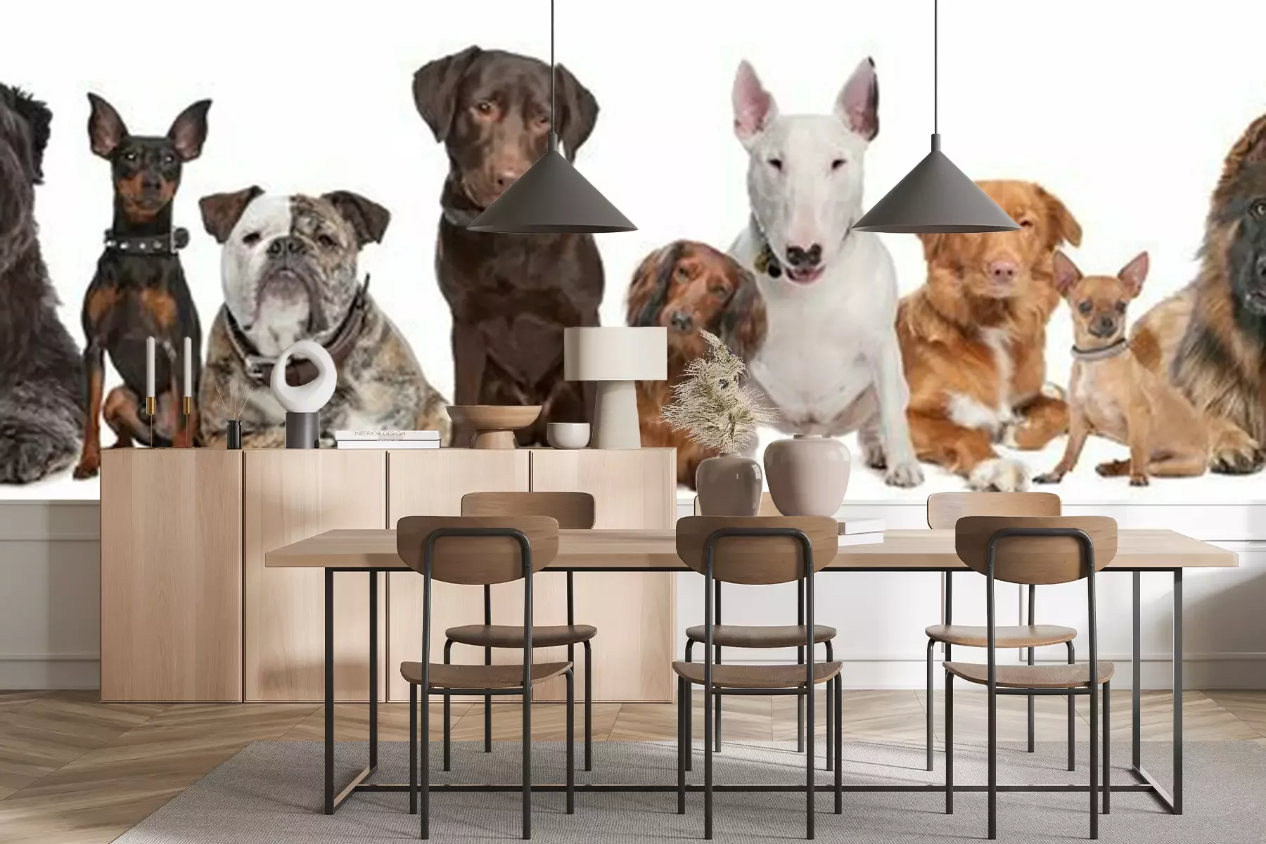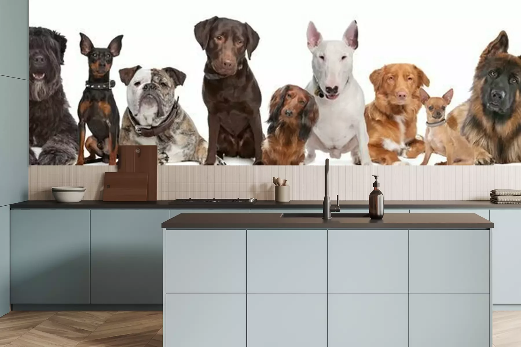 Papier peint  Chiens aux couleurs différentes sur fond blanc