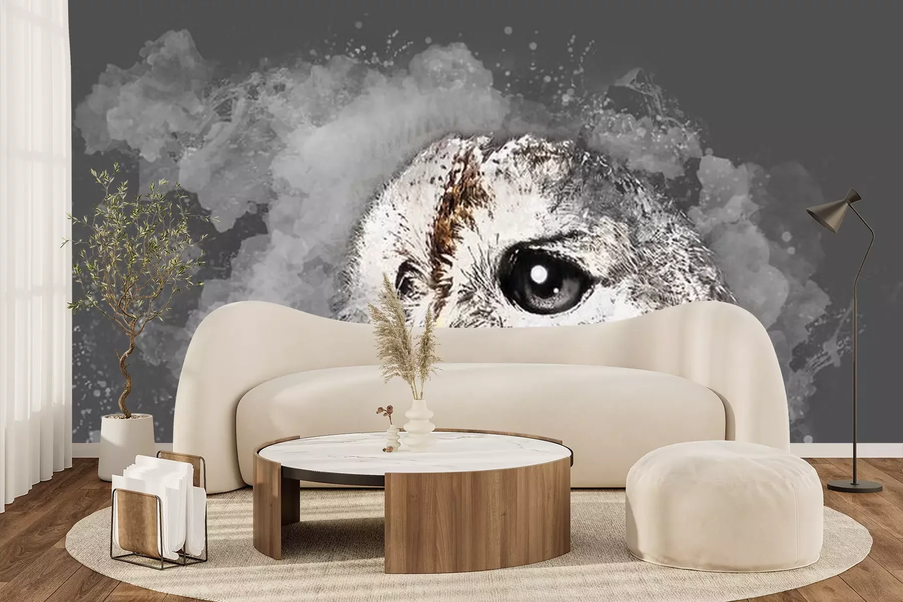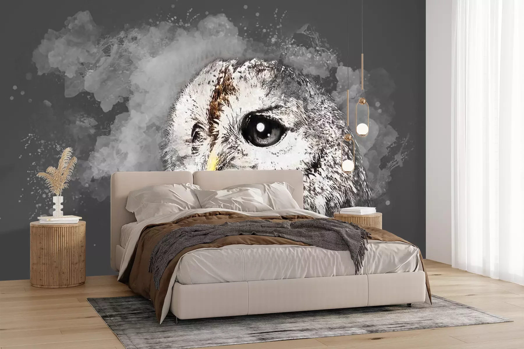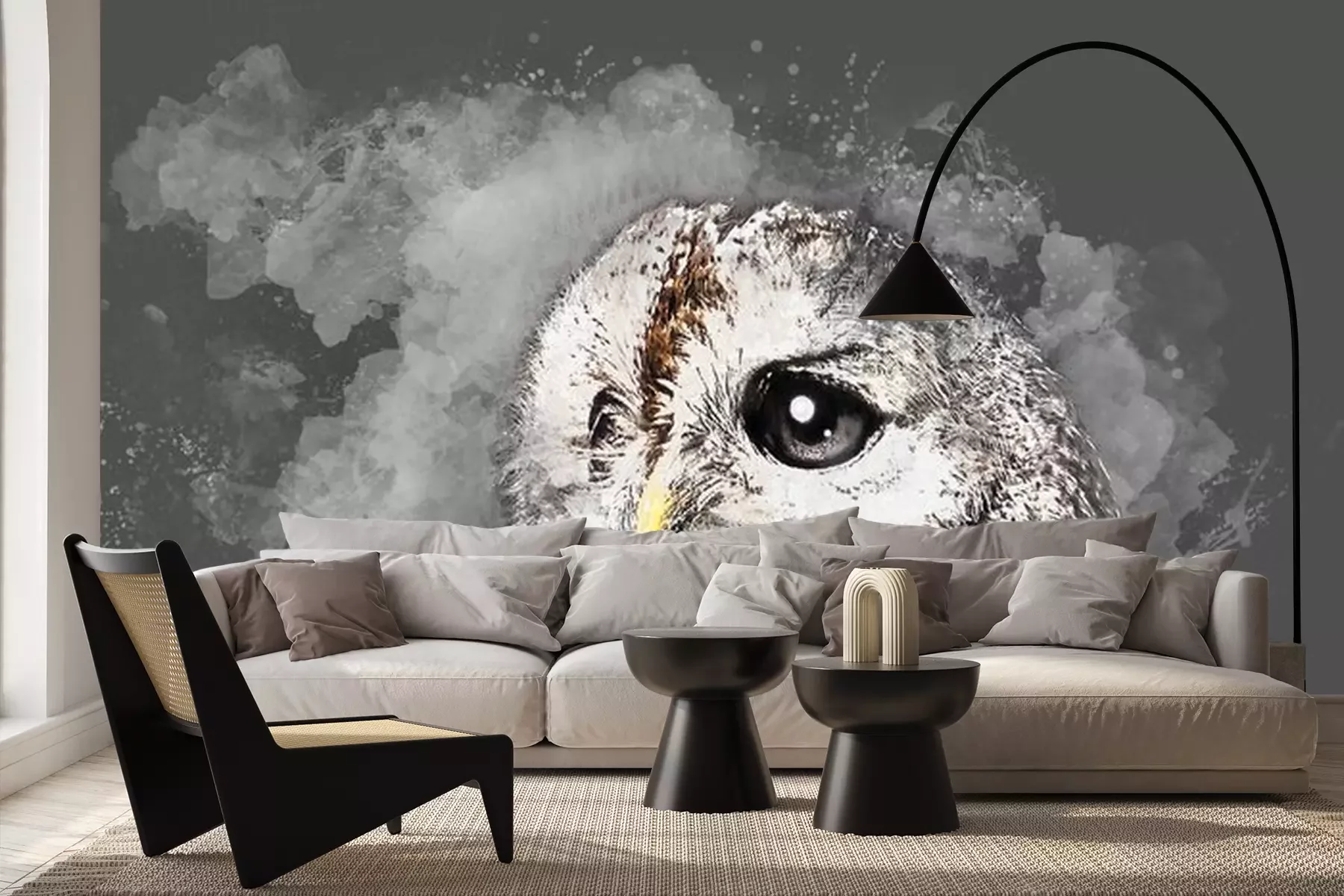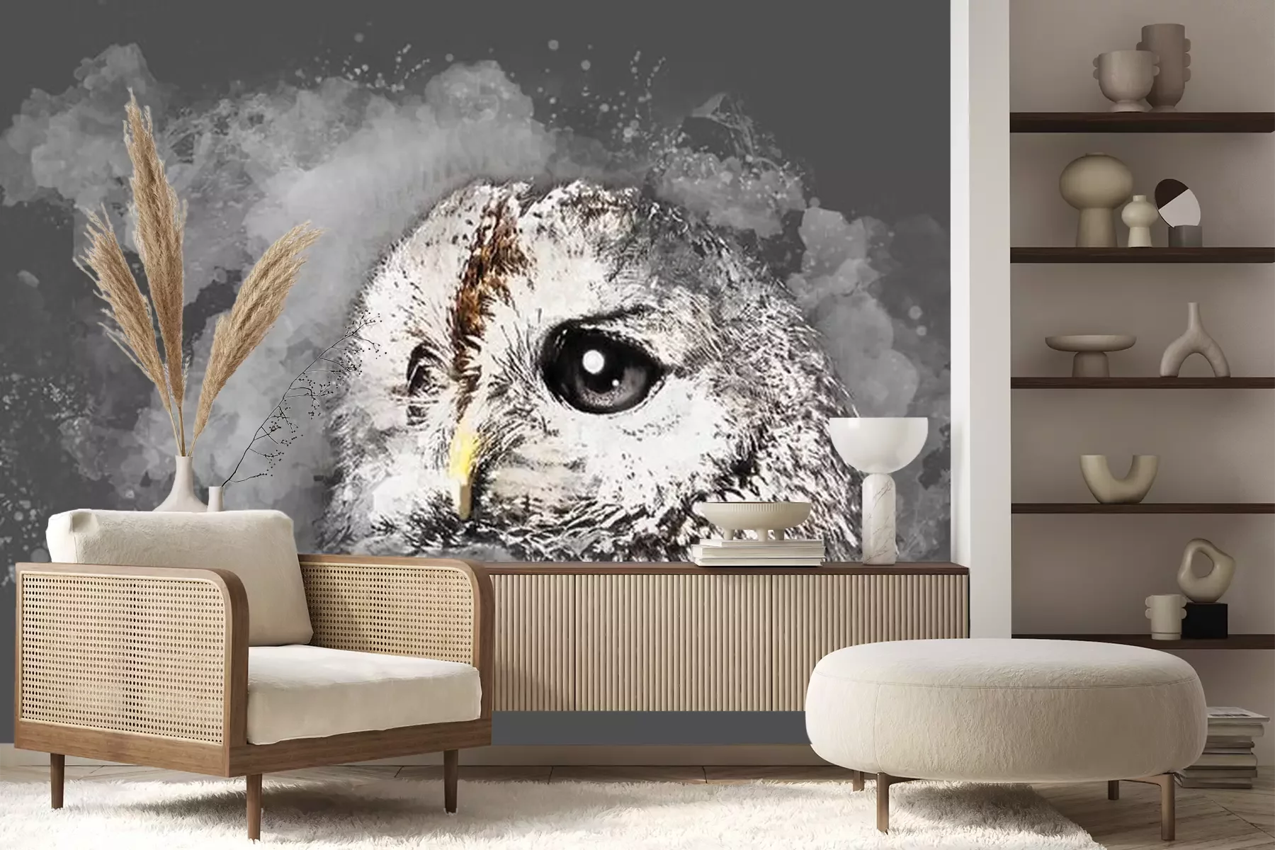 Papier peint  Chouette aquarellée avec de grands yeux sur un fond gris