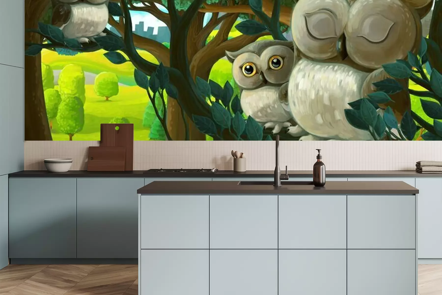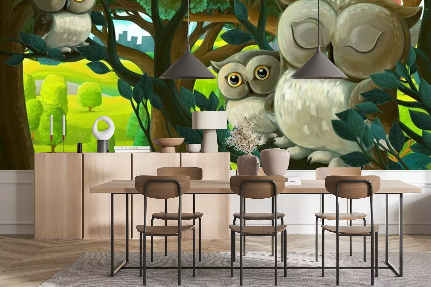 Papier peint  Chouettes assises sur une branche comme dans un dessin animé