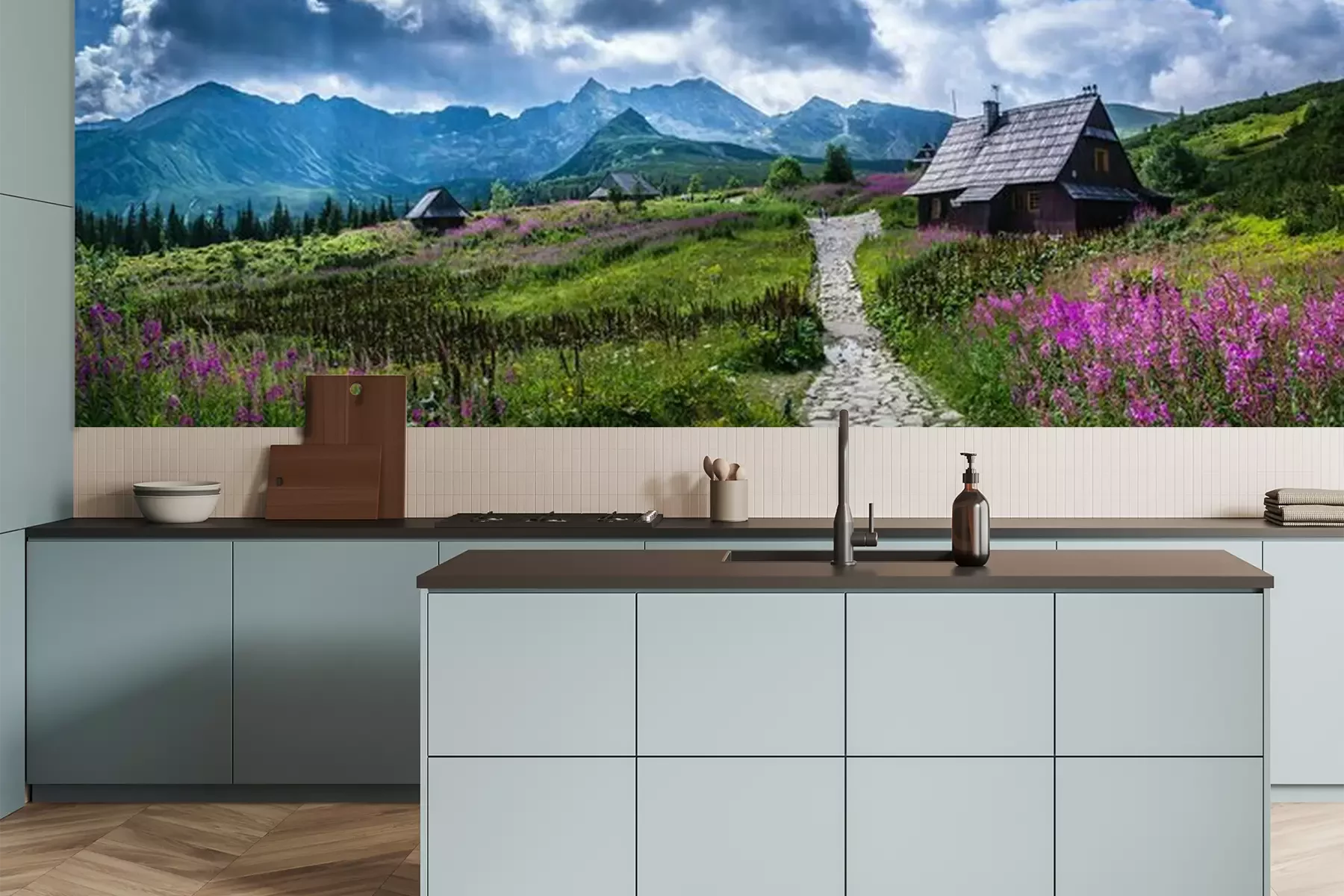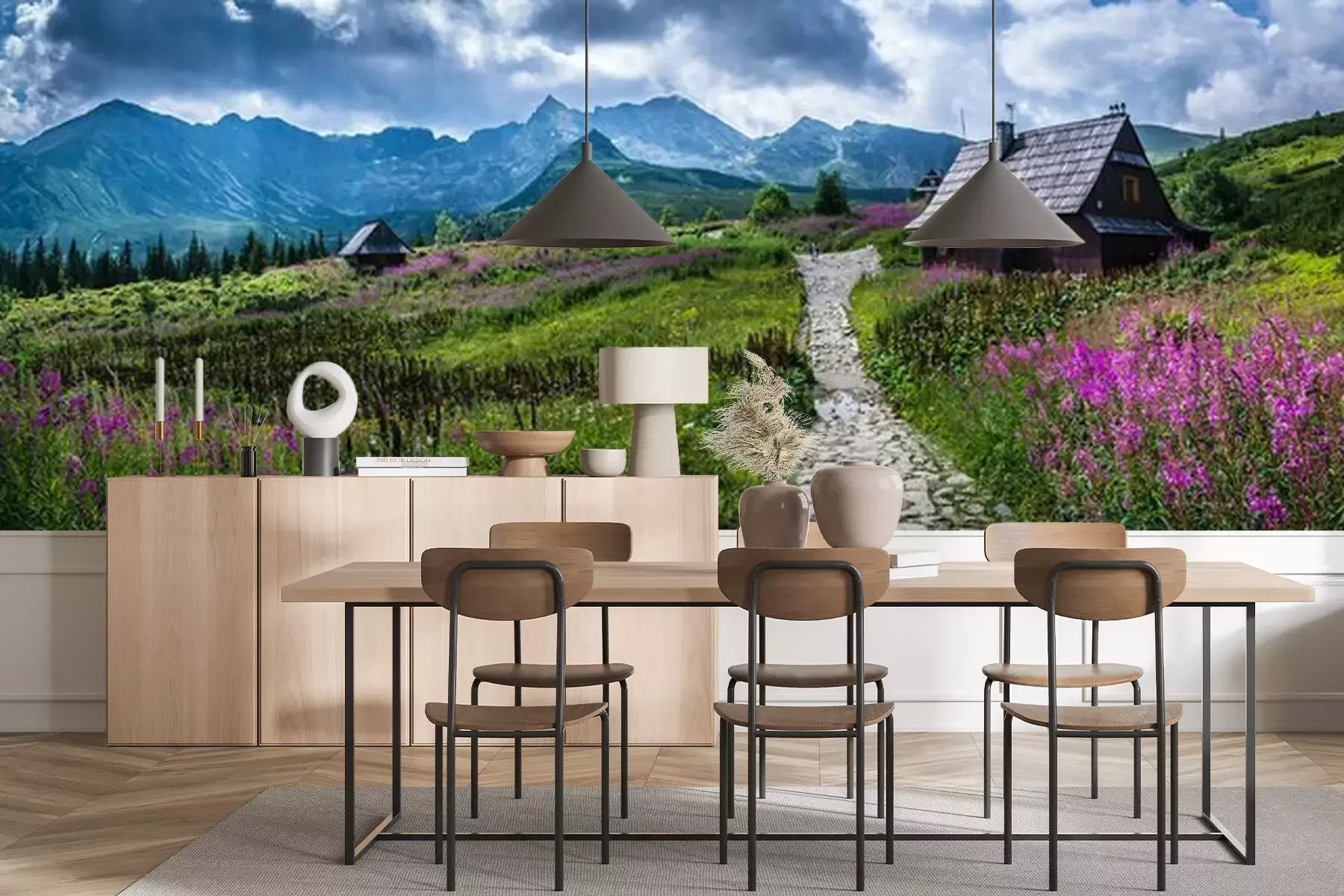 Papier peint  Clairière verte avec des montagnes en arrière-plan