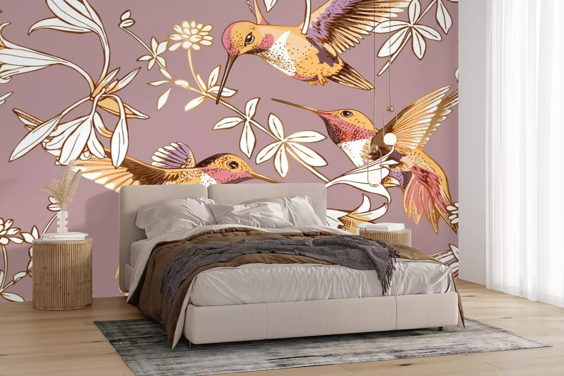 Papier peint  Colibris au milieu de fleurs sur un fond dans les tons roses