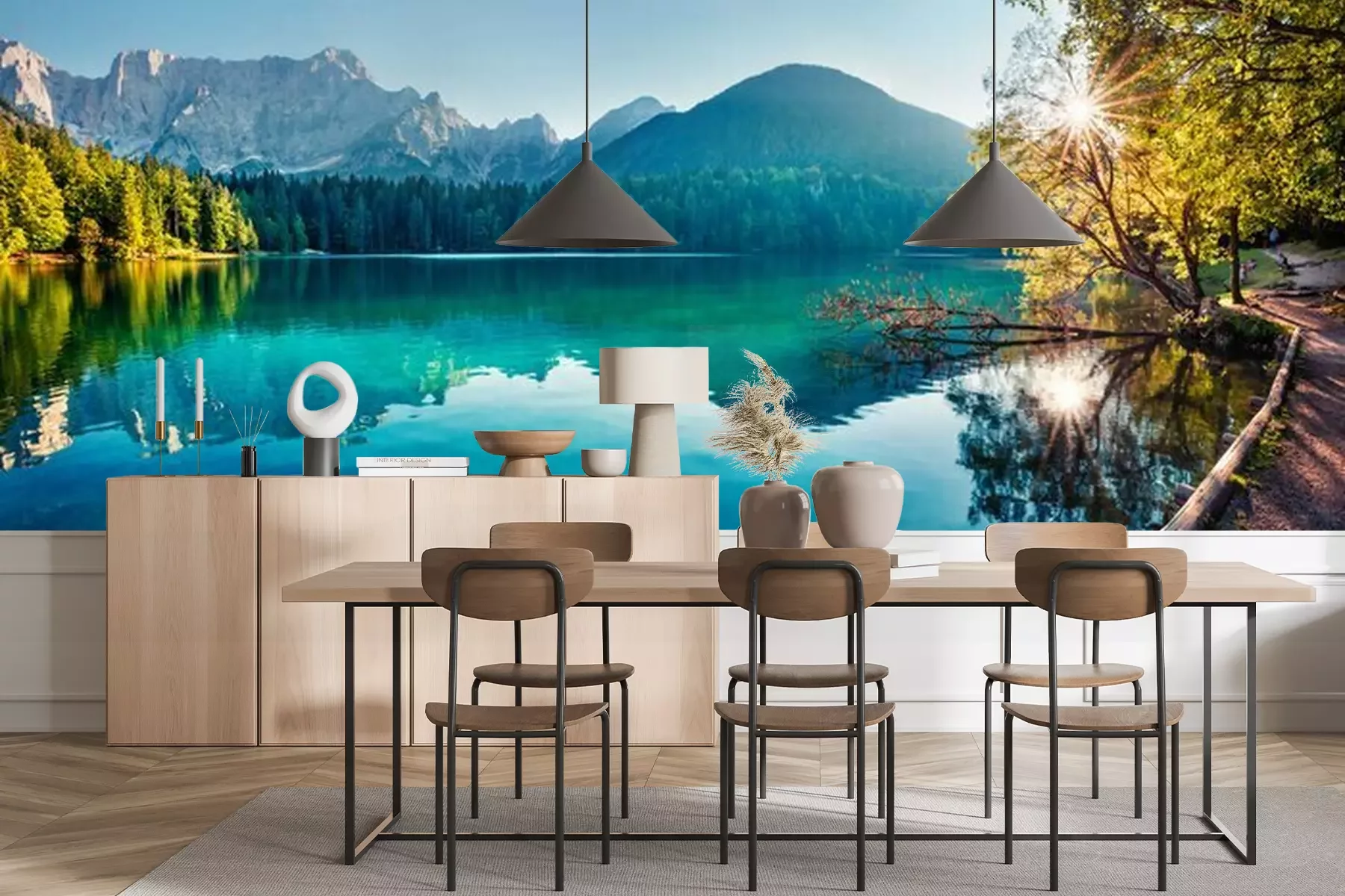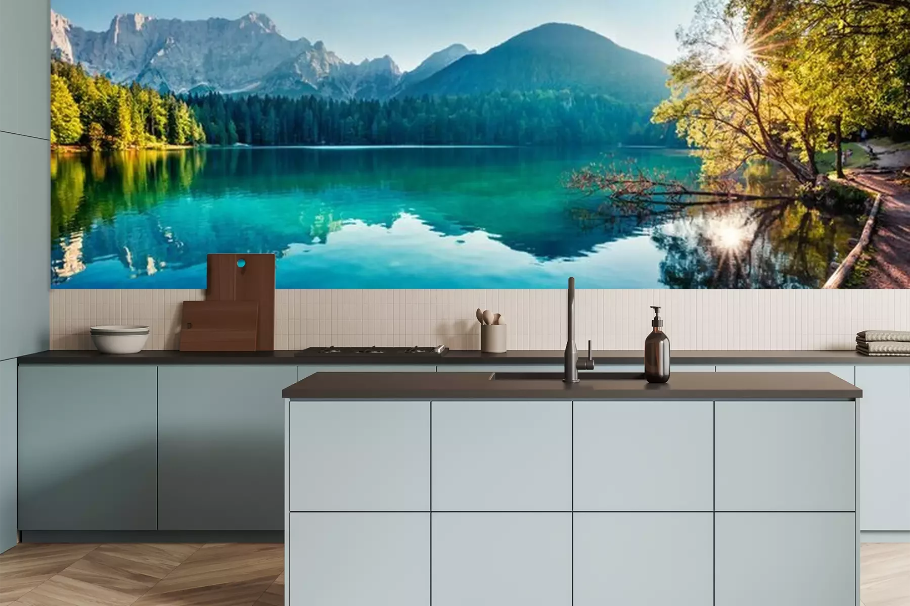 Papier peint  Colorful summer view of Fusine lake. Bright morning scene of Julian Alps with Mangart peak on background, Province of Udine, Italy, Europe. Traveling concept background.