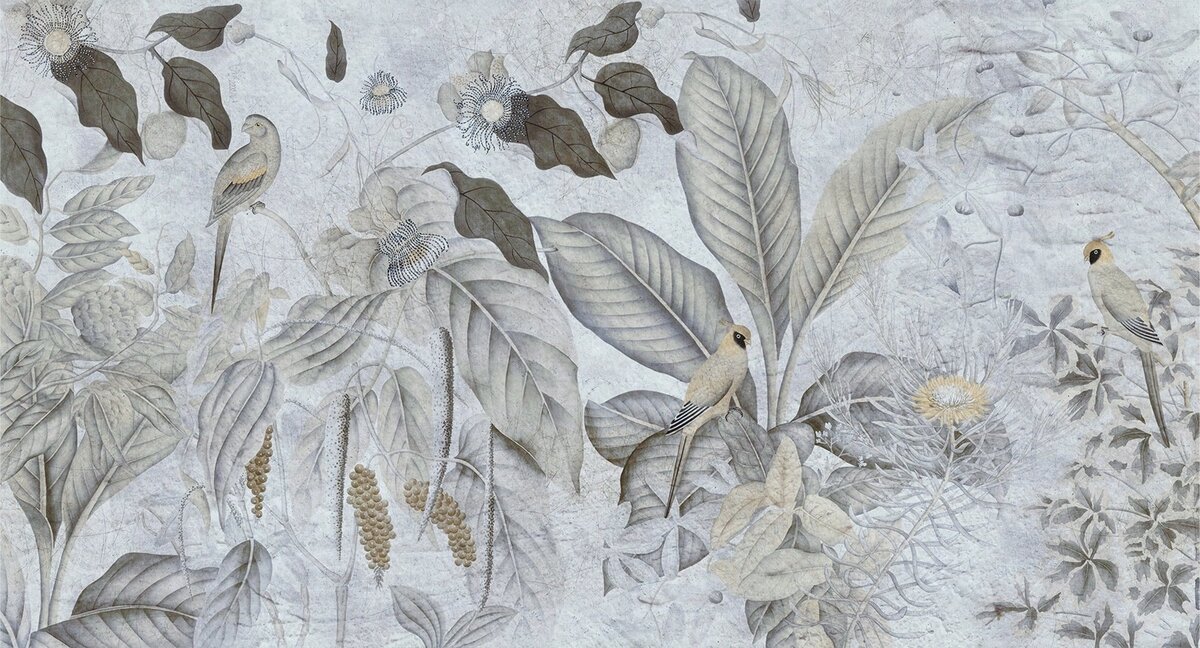 Papier peint : Composition d'oiseaux sur des feuilles exotiques