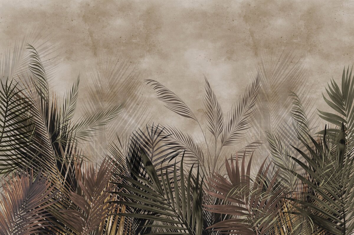 Papier peint : Composition tropicale avec des feuilles de palmier sur fond beige