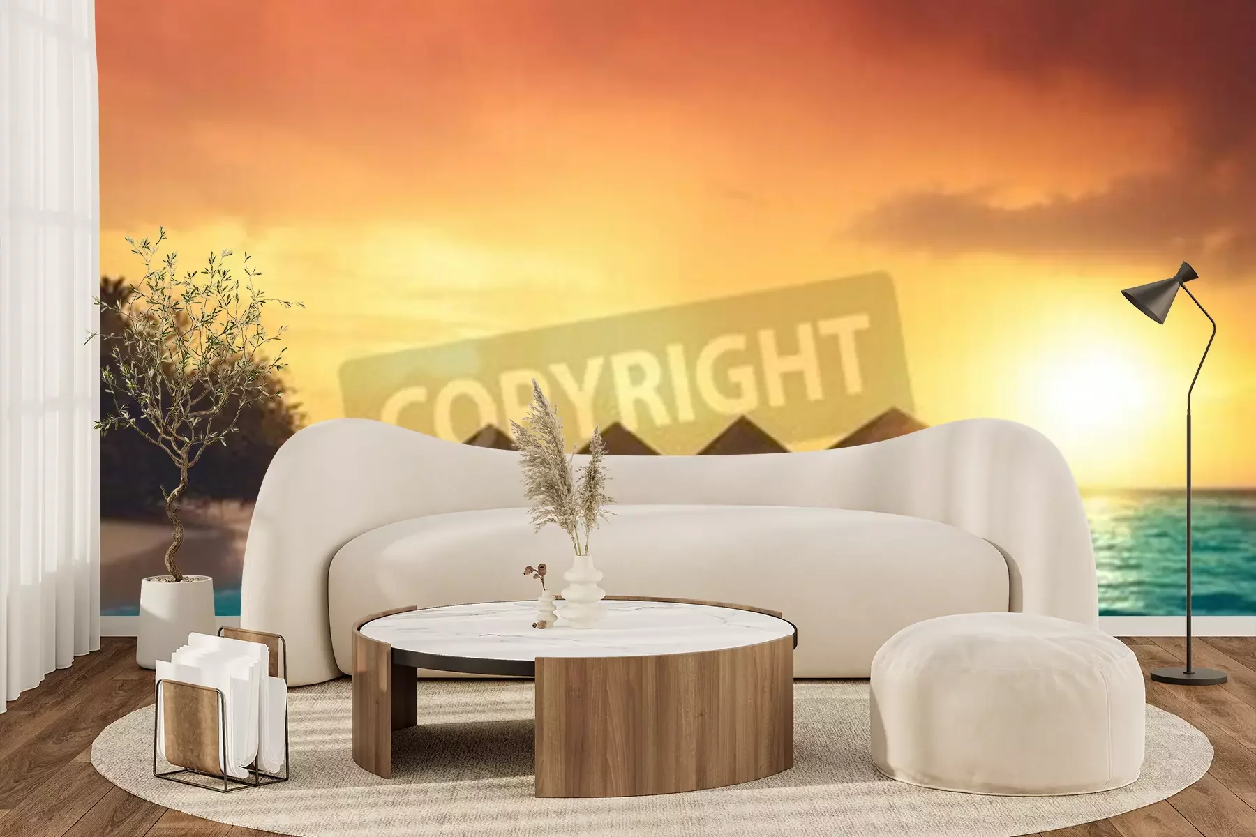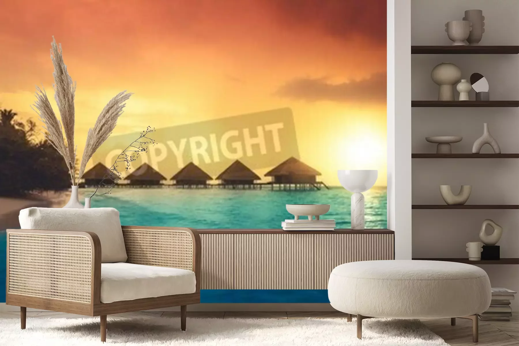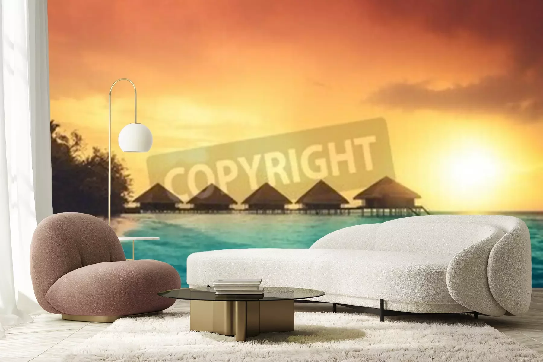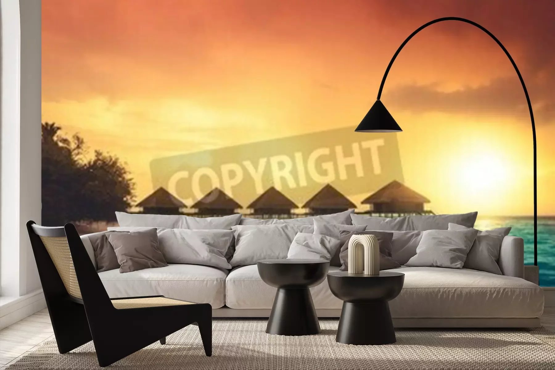 Papier peint  Coucher de soleil derrière des maisons sur la mer