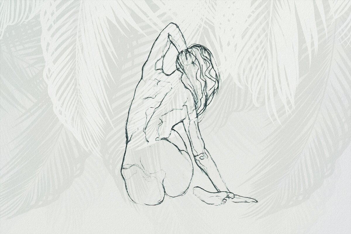 Papier peint : Croquis d'une femme délicate sur fond de feuilles