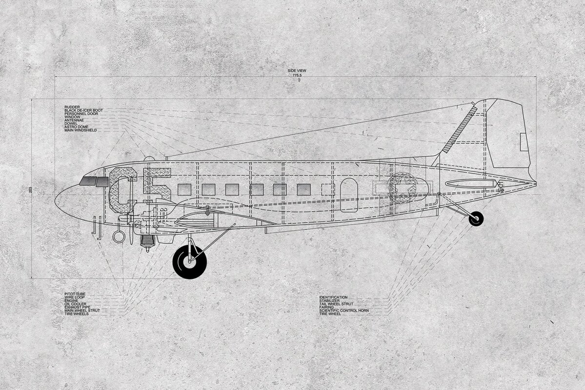 Dessin technique d’un avion sur fond gris texturé