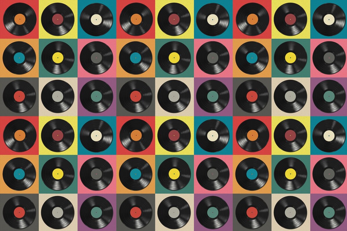 Papier peint : Disques vinyles sur des carreaux colorés
