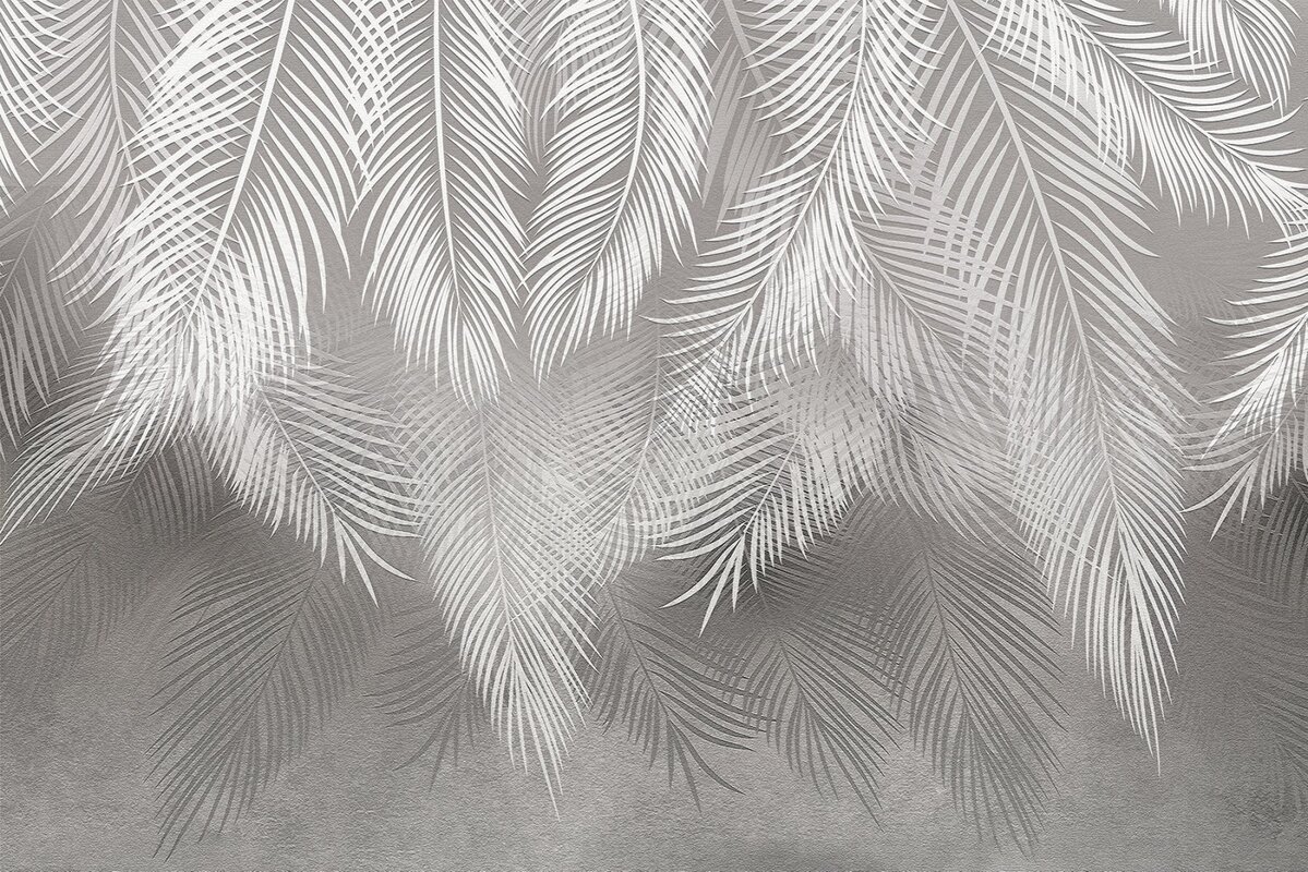 Papier peint : Feuilles de palmier tropicales en blanc et gris sur fond effet béton