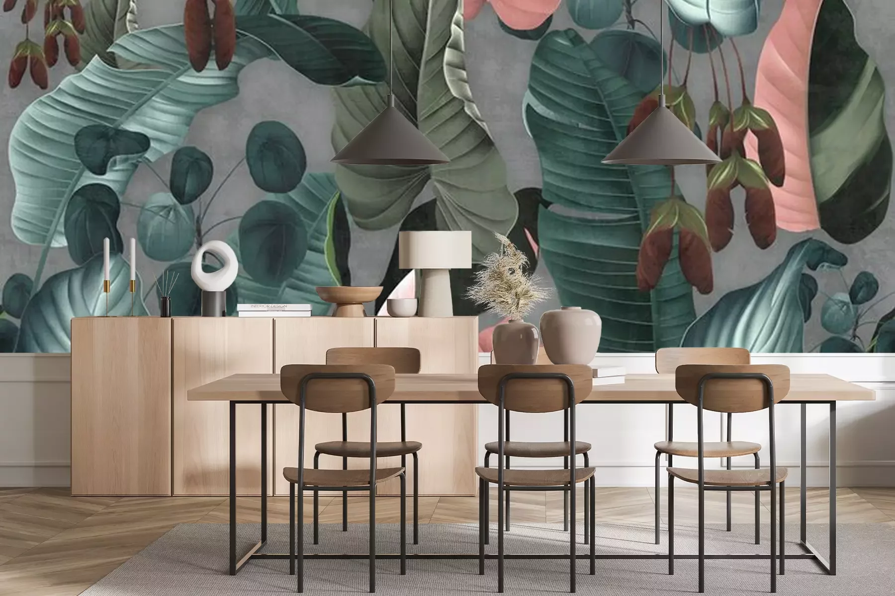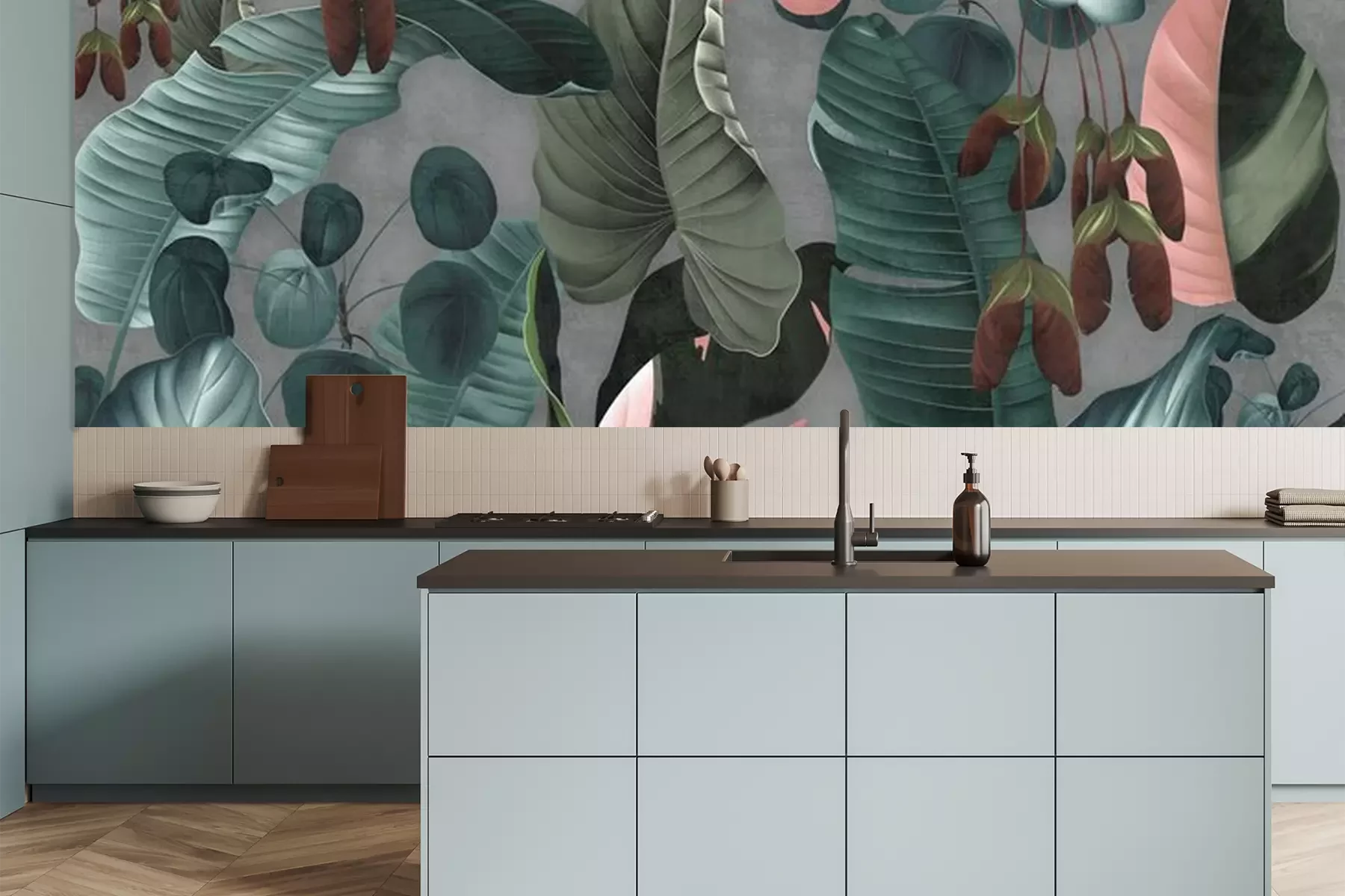 Papier peint  Feuilles exotiques en 3D sur fond de béton et nuances de gris