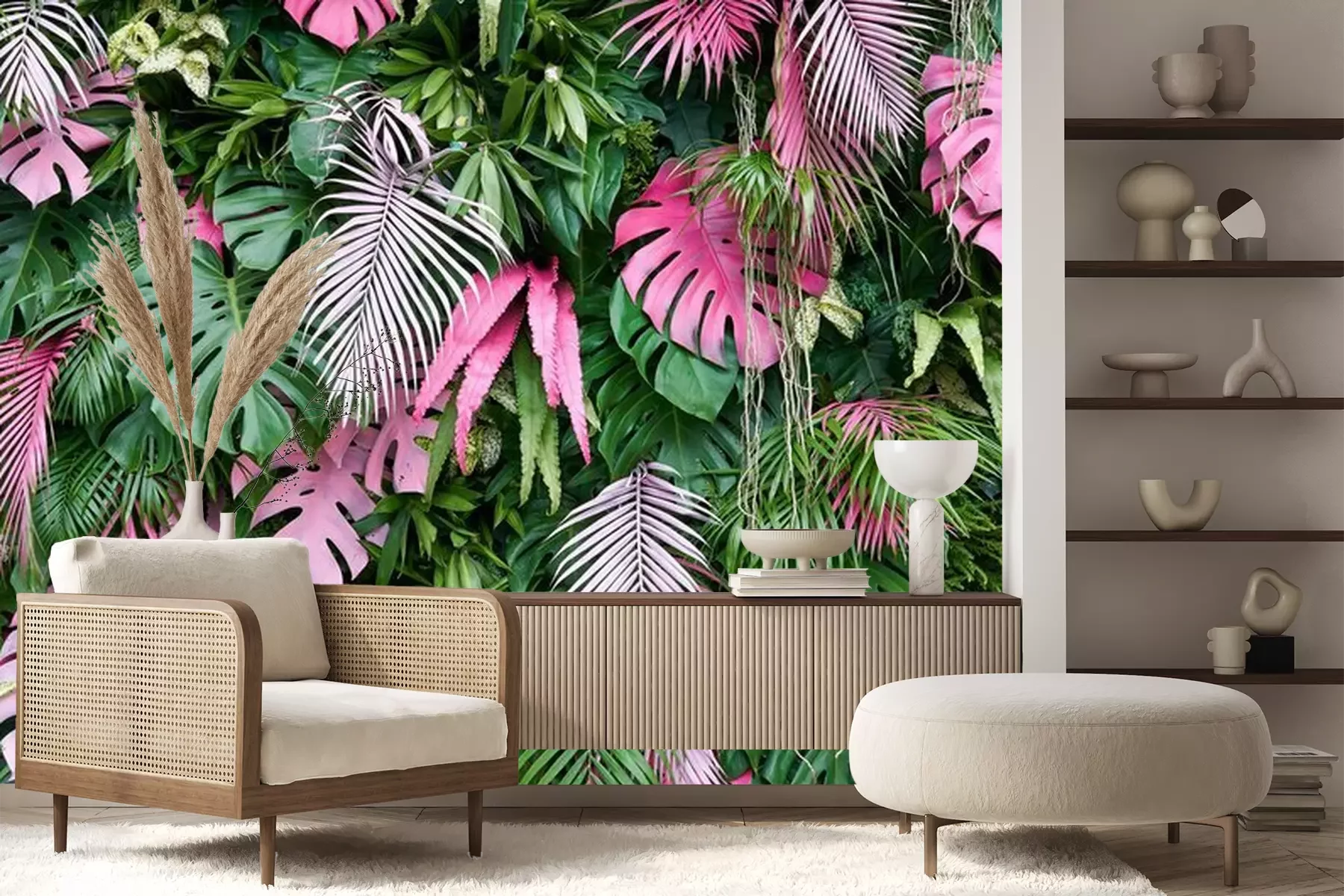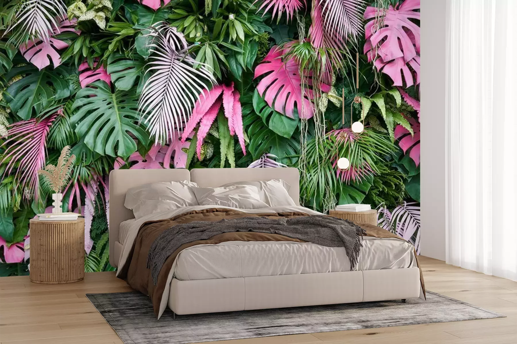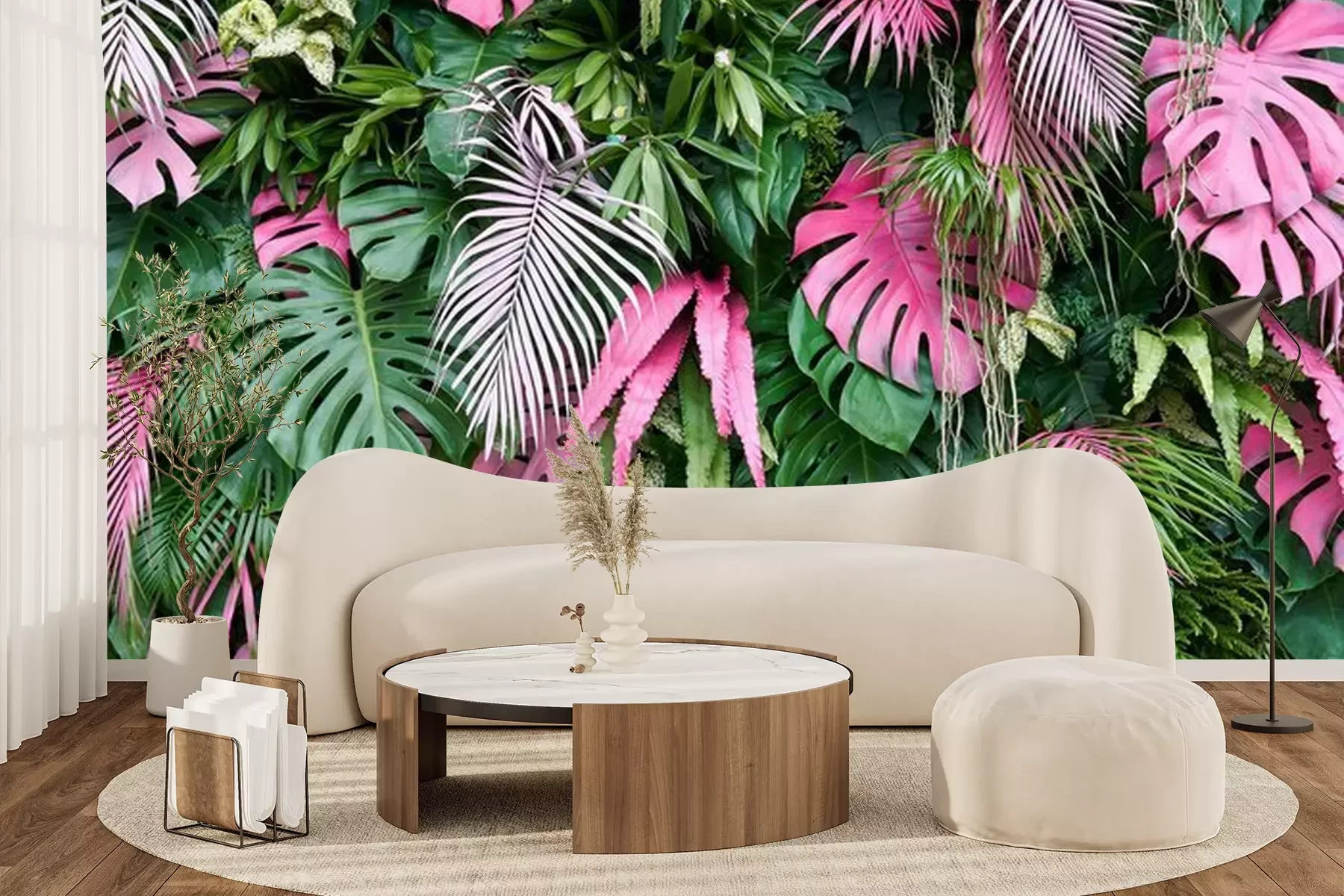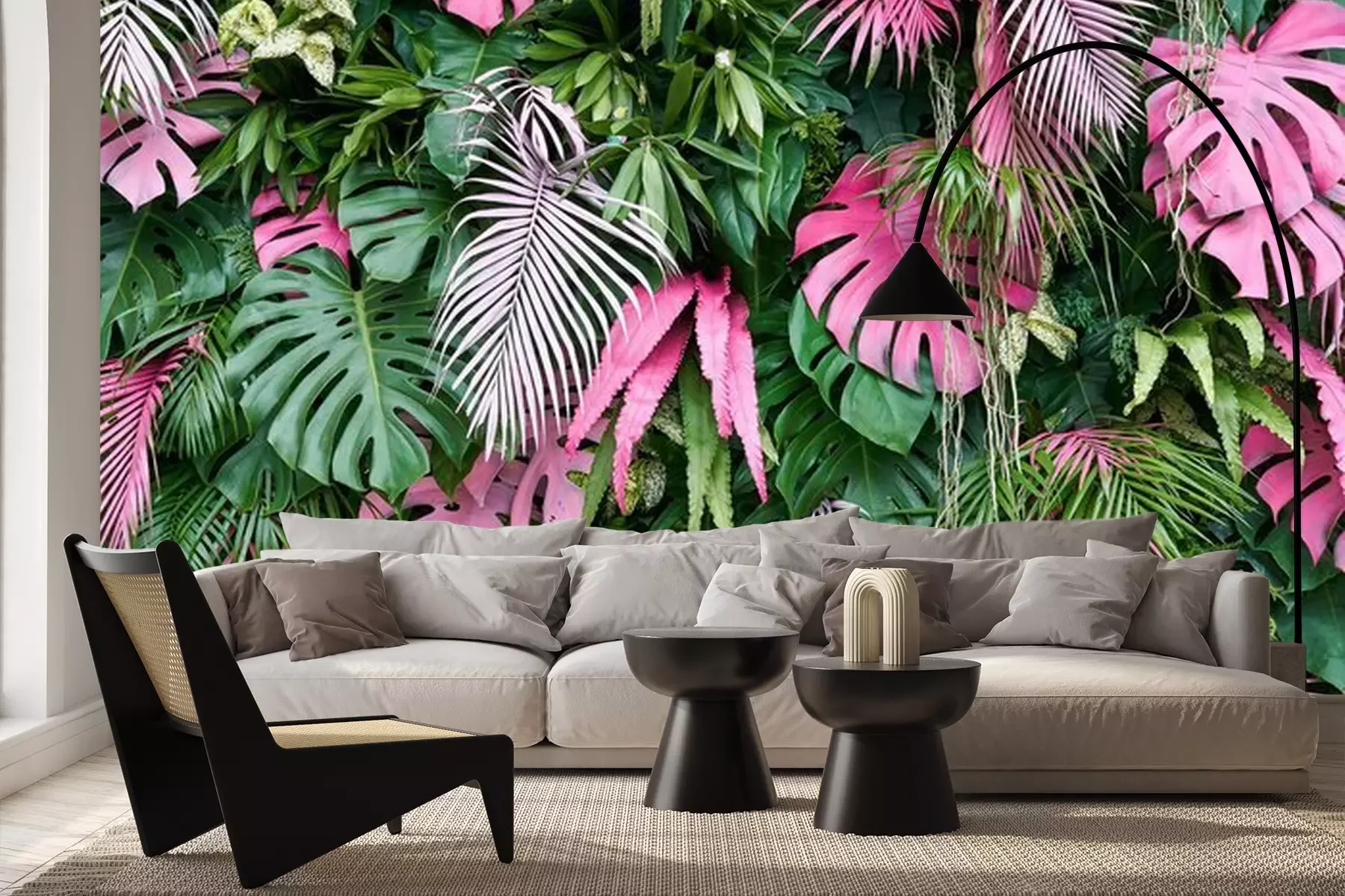 Papier peint  Feuilles tropicales vertes et roses