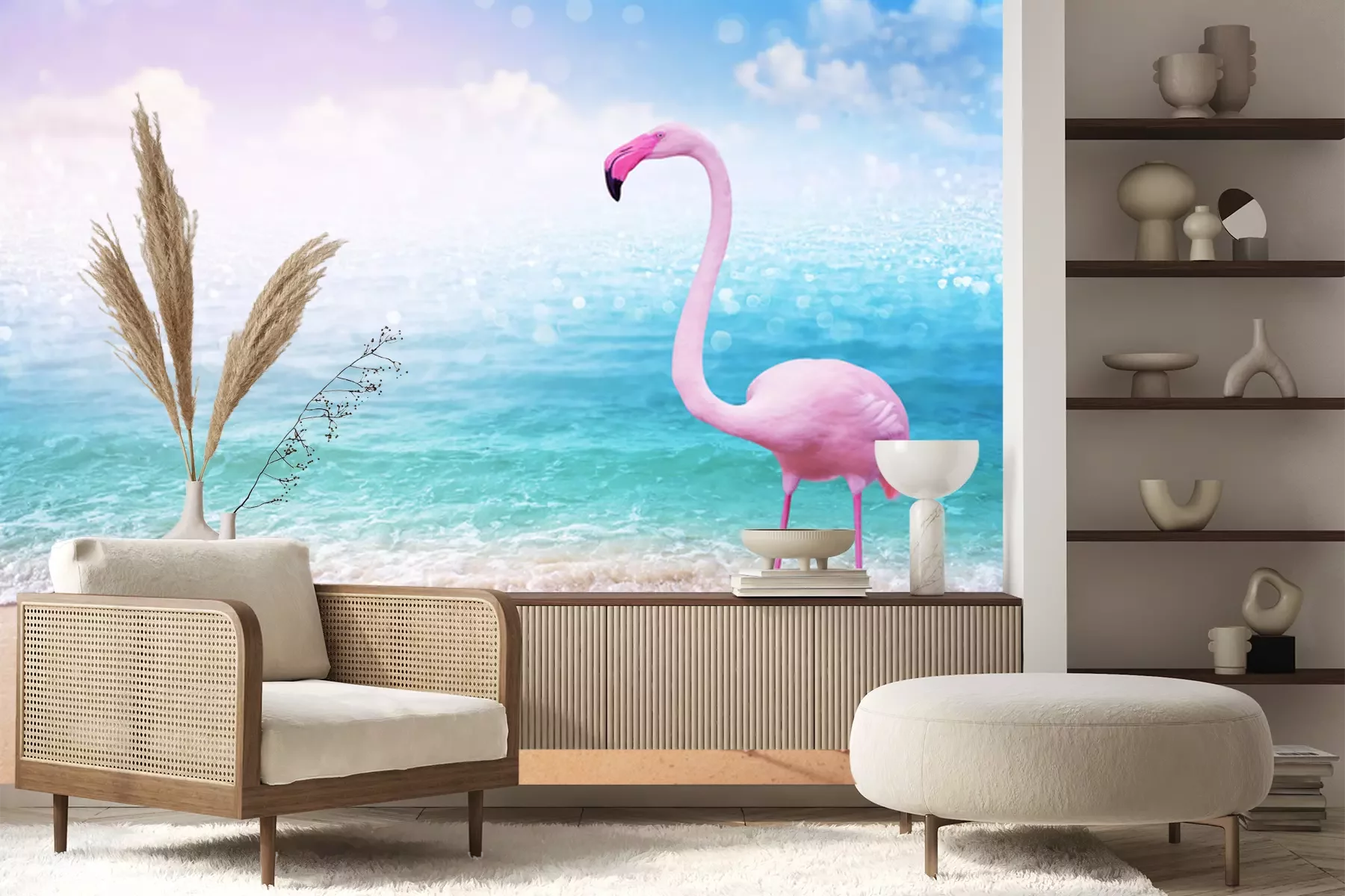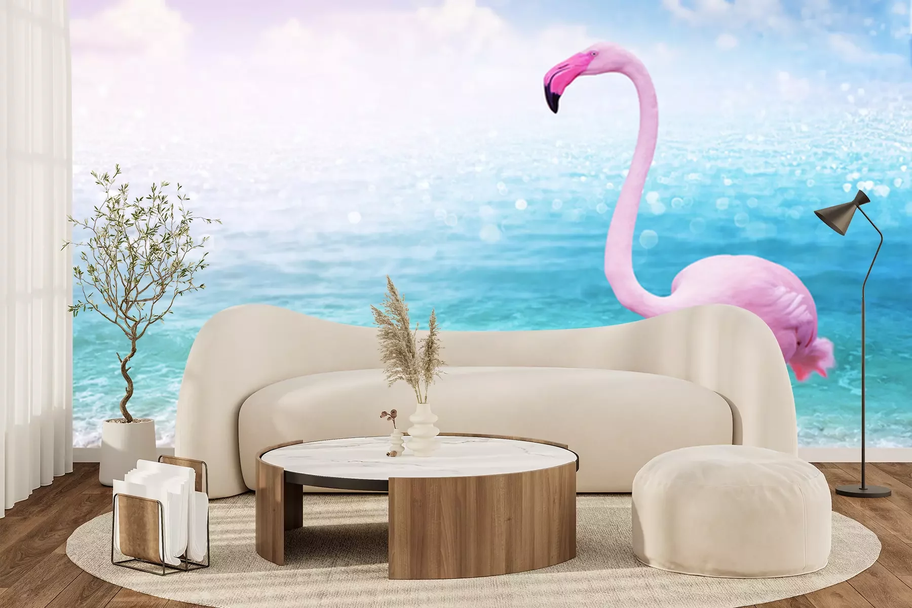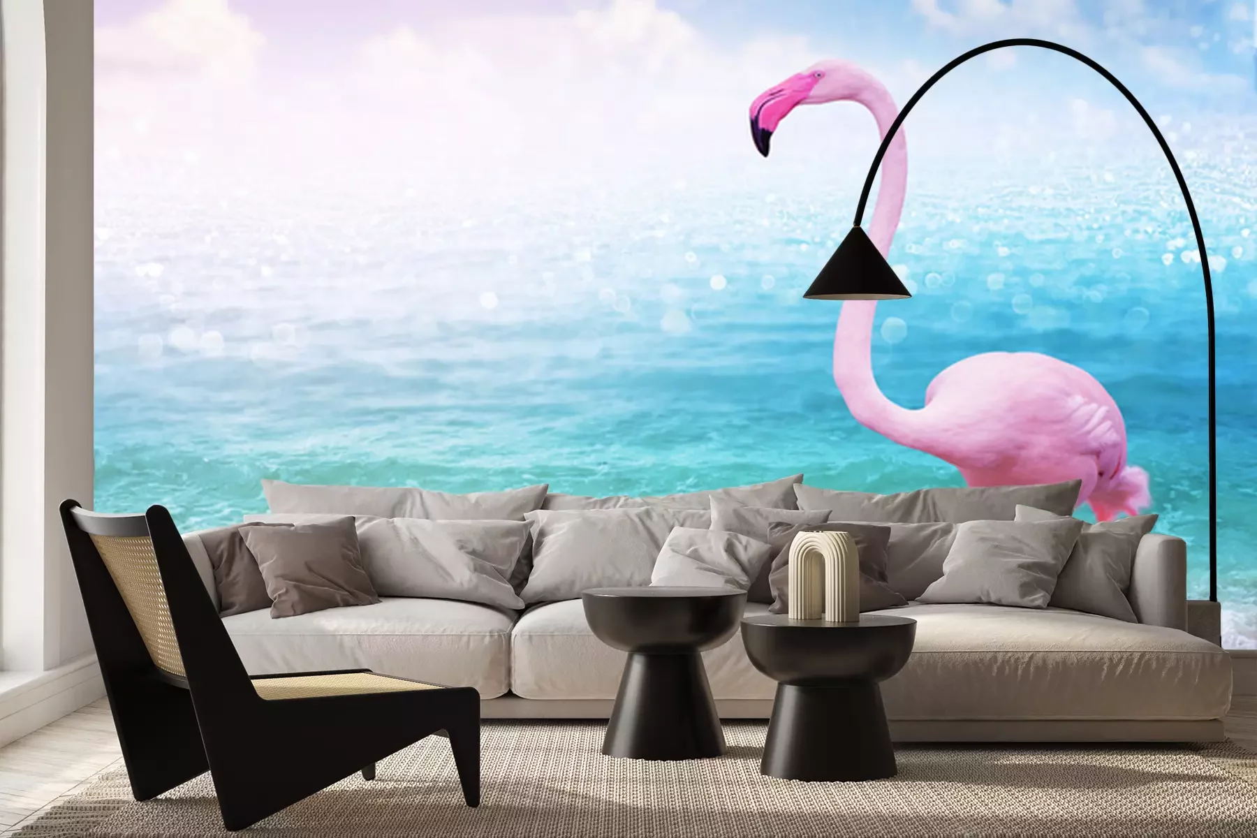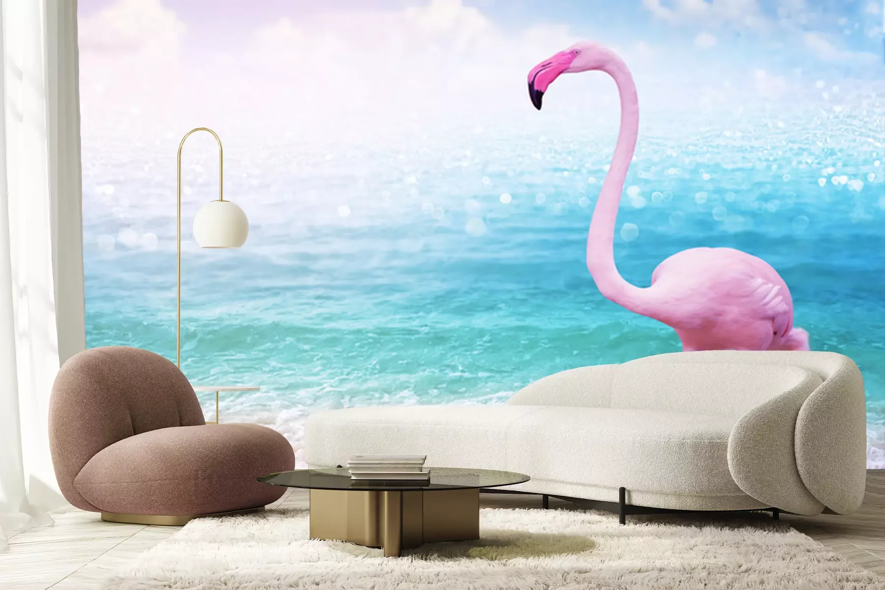 Papier peint  Flamant rose avec la mer en arrière-plan