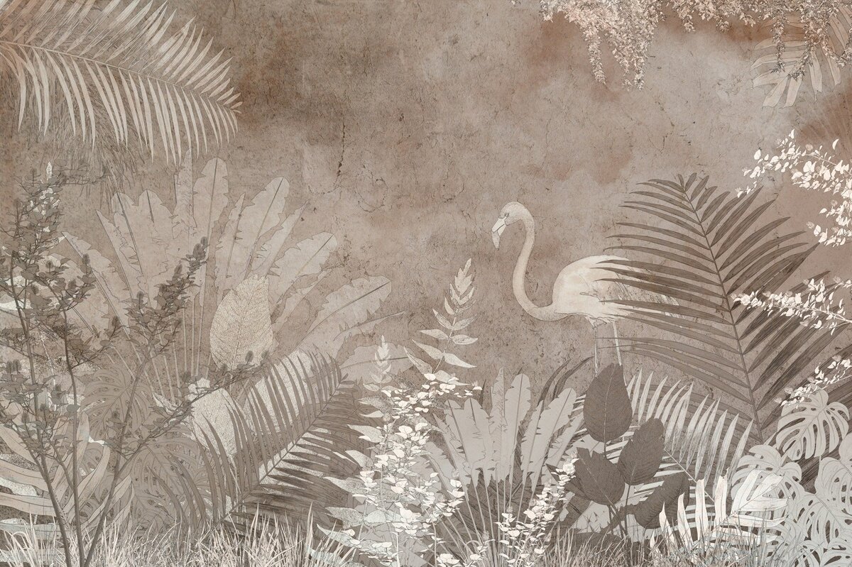 Papier peint : Flamant rose et feuilles tropicales dans des tons de brun sur fond en béton