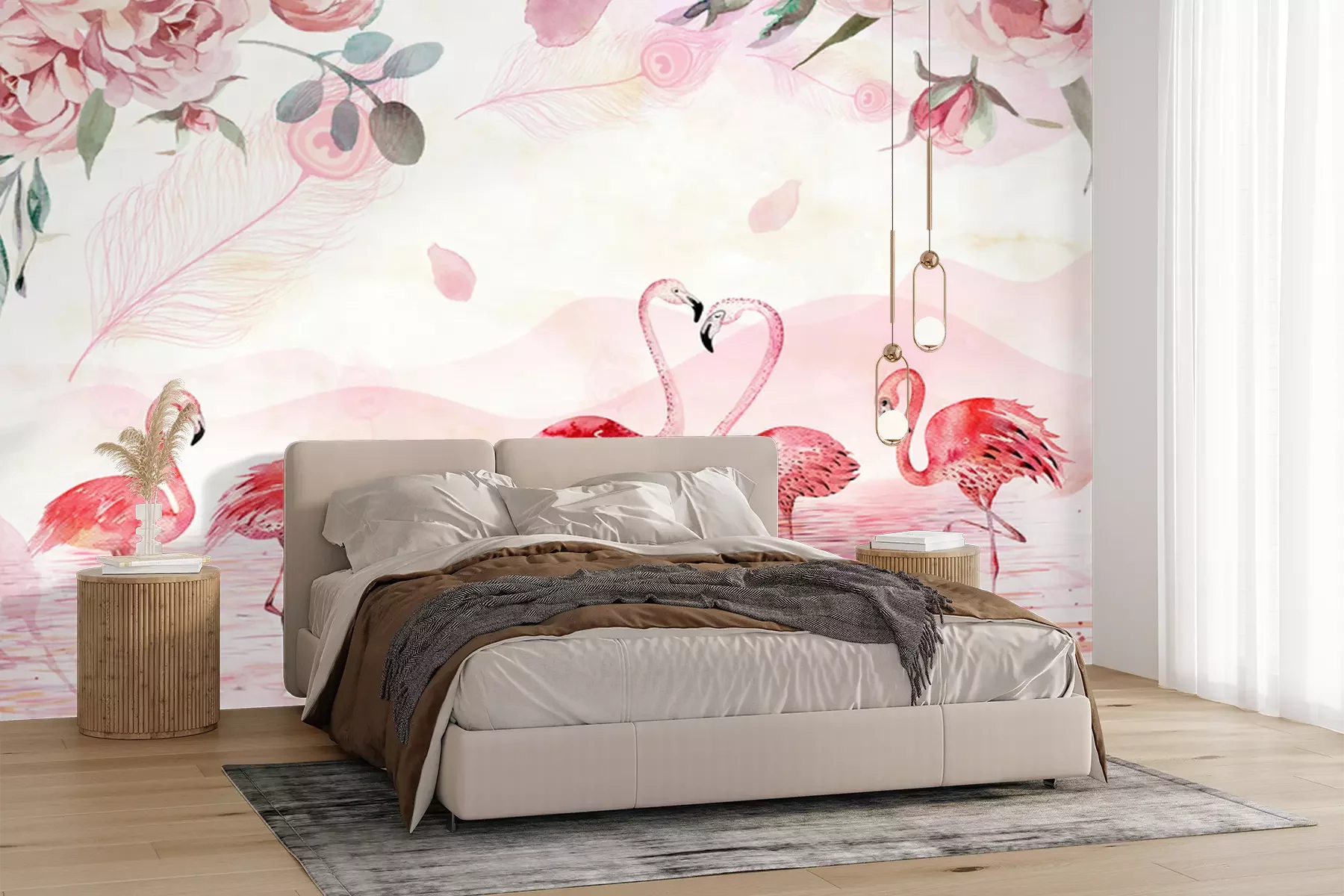 Papier peint  Flamants dans un lac avec un paysage de montagne en arrière-plan