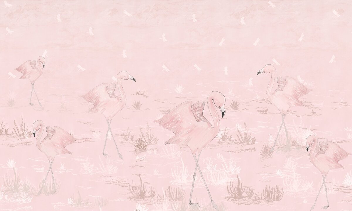Papier peint : Flamants roses dans une clairière avec des libellules
