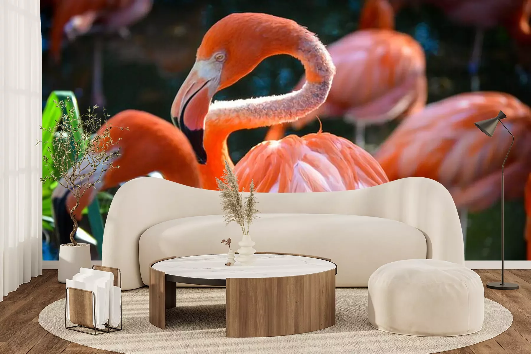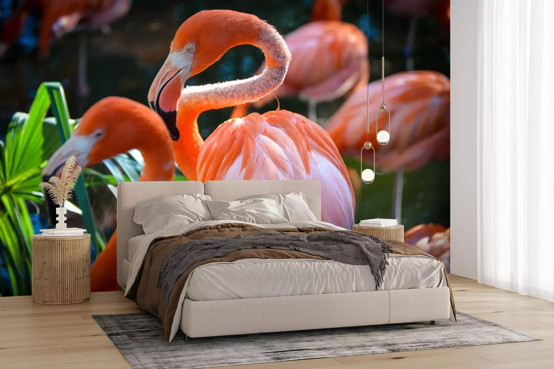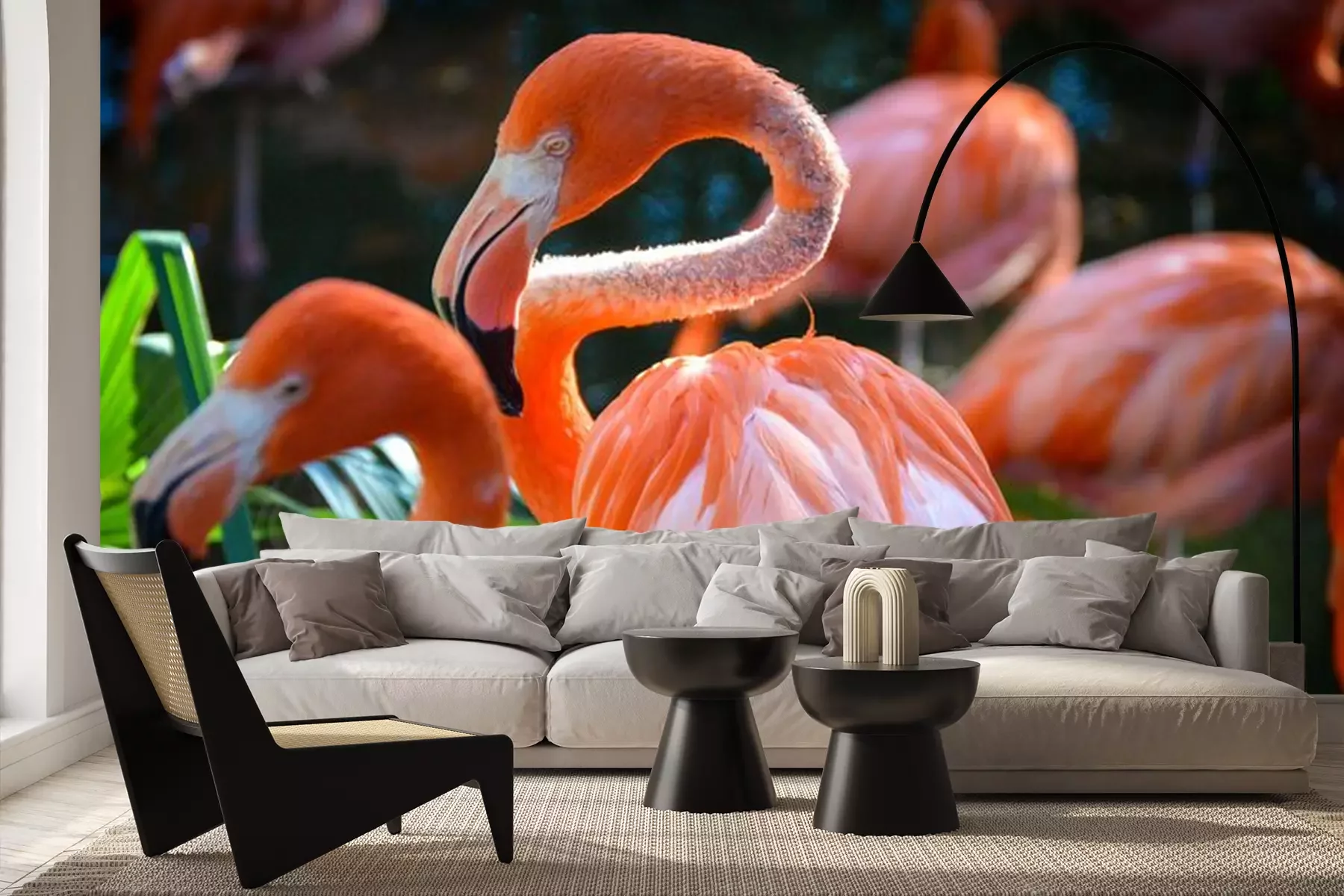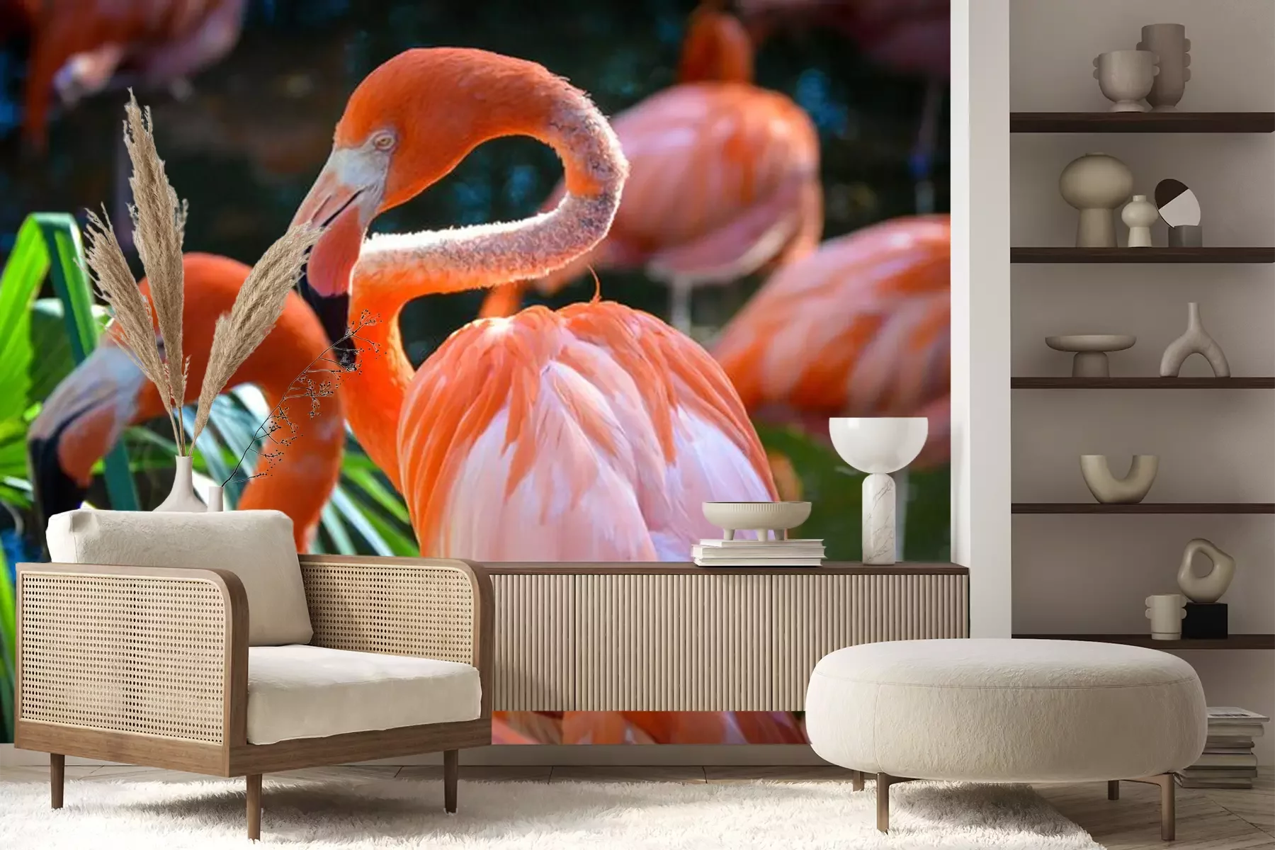 Papier peint  Flamants roses sur fond de verdure