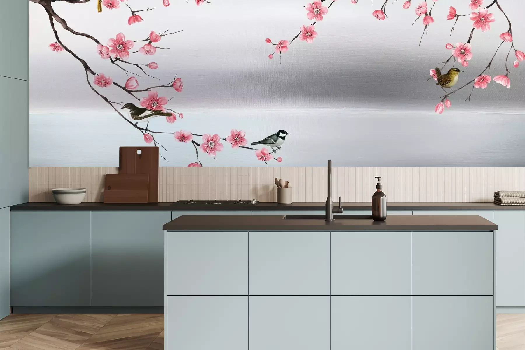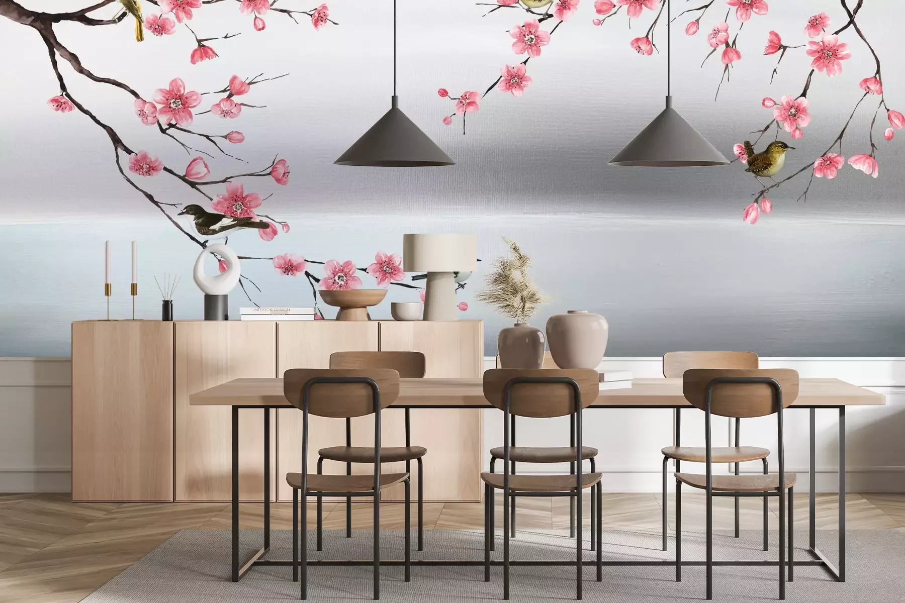 Fleurs de cerisier roses avec des oiseaux en aquarelle