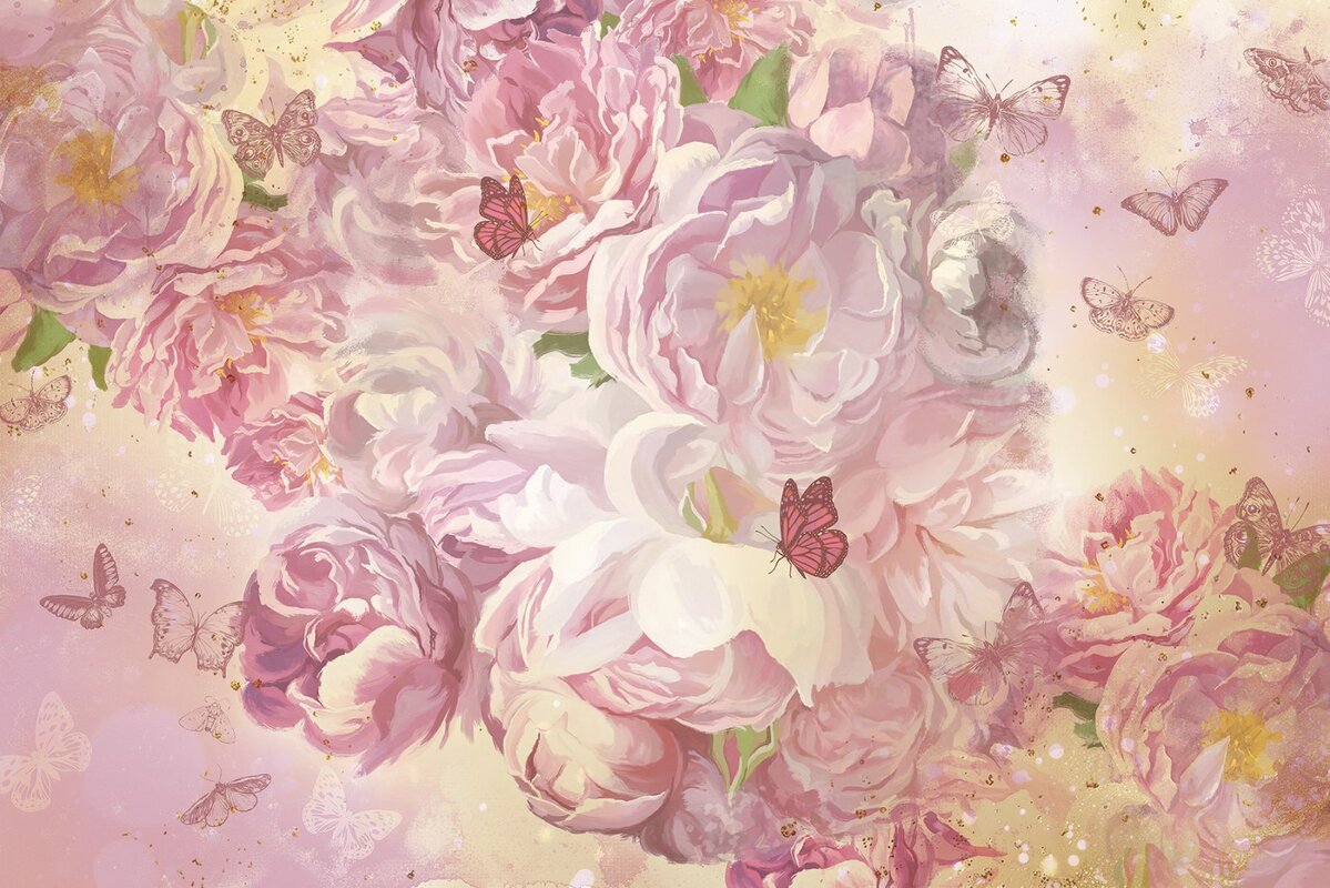 Papier peint : Fleurs roses et papillons motif en style peinture