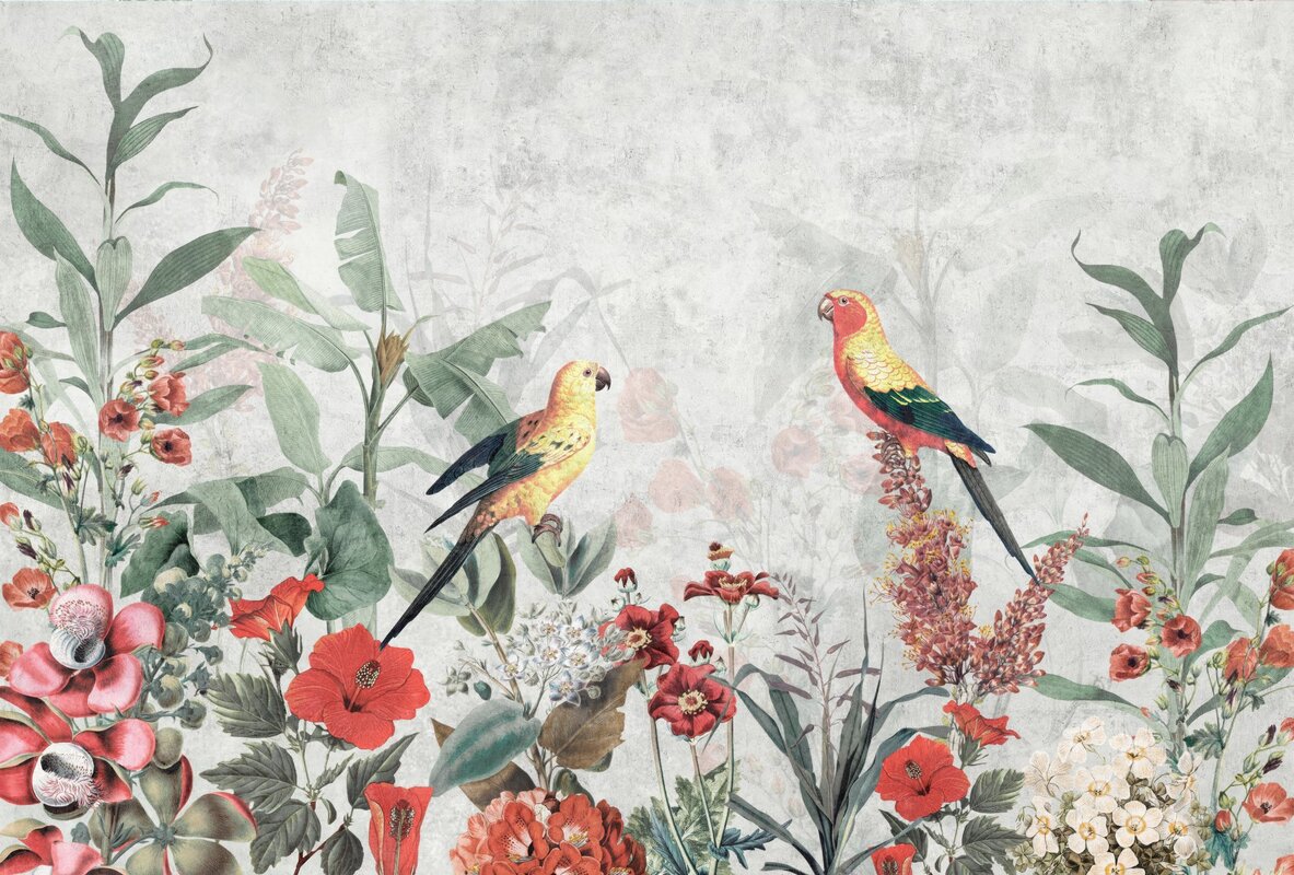 Papier peint : Fleurs tropicales rouges, feuilles et perroquets