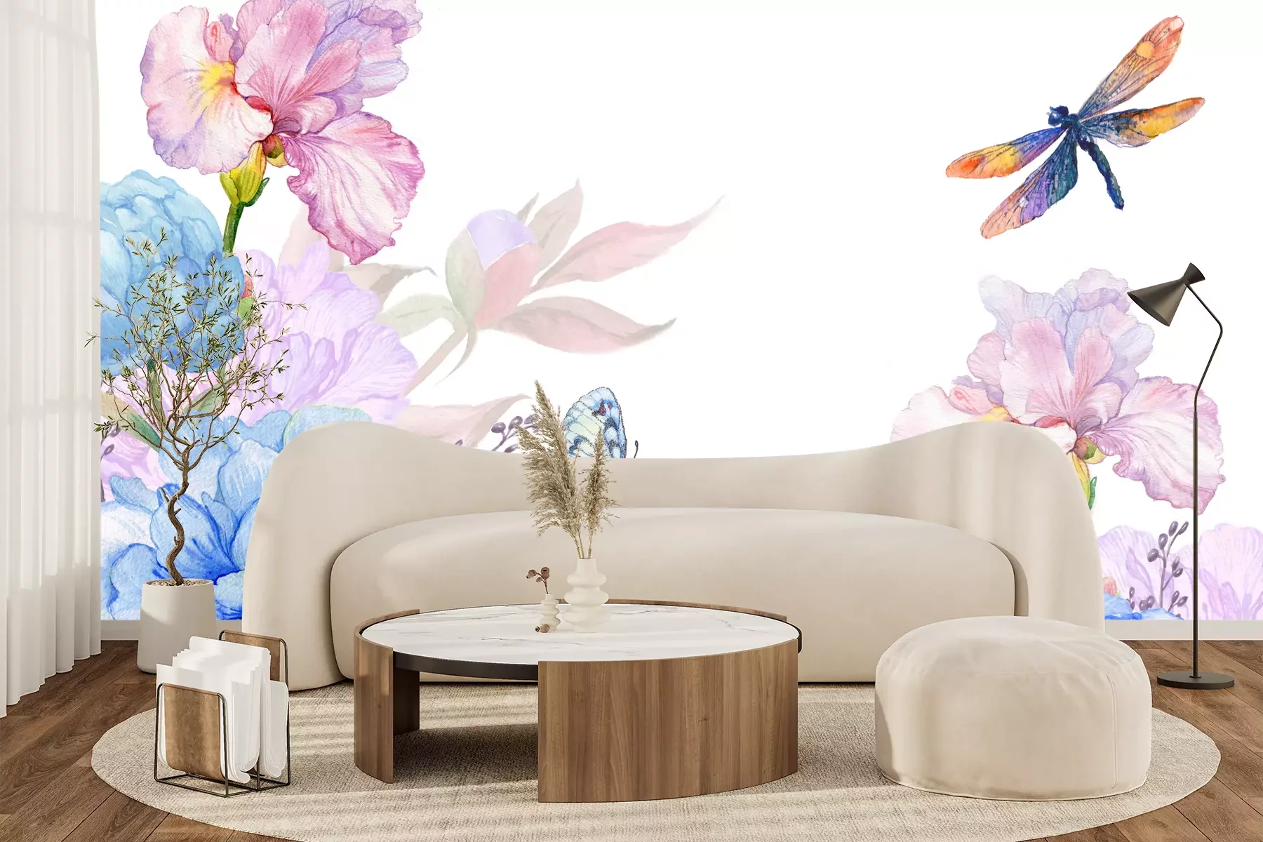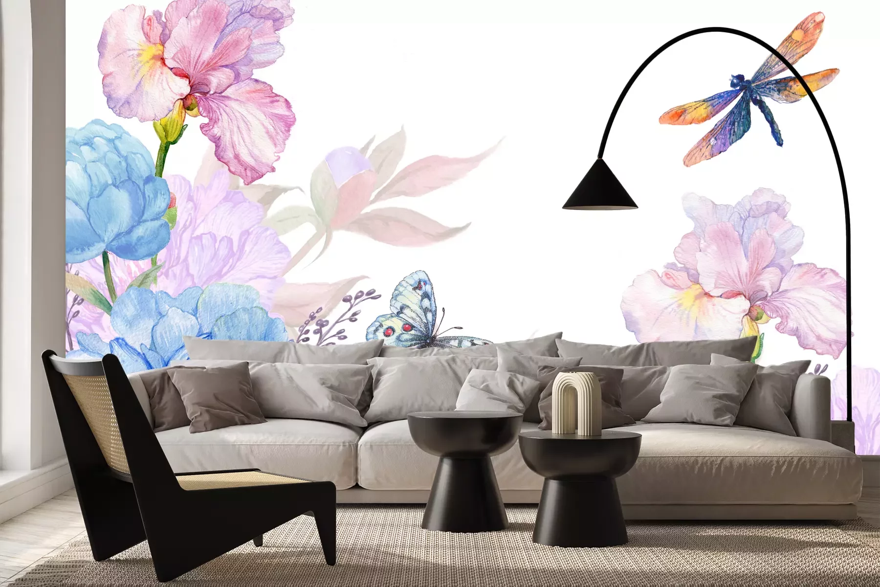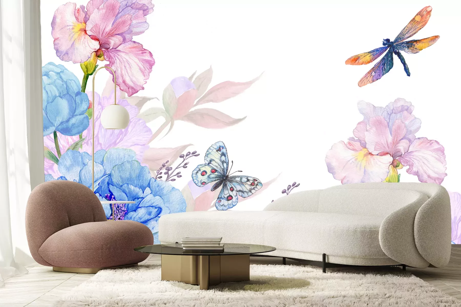 Papier peint  Floral background .illustration of watercolor. flowers peonies, irises, hydrangeas,butterflies and dragonflies . postcard floral pattern