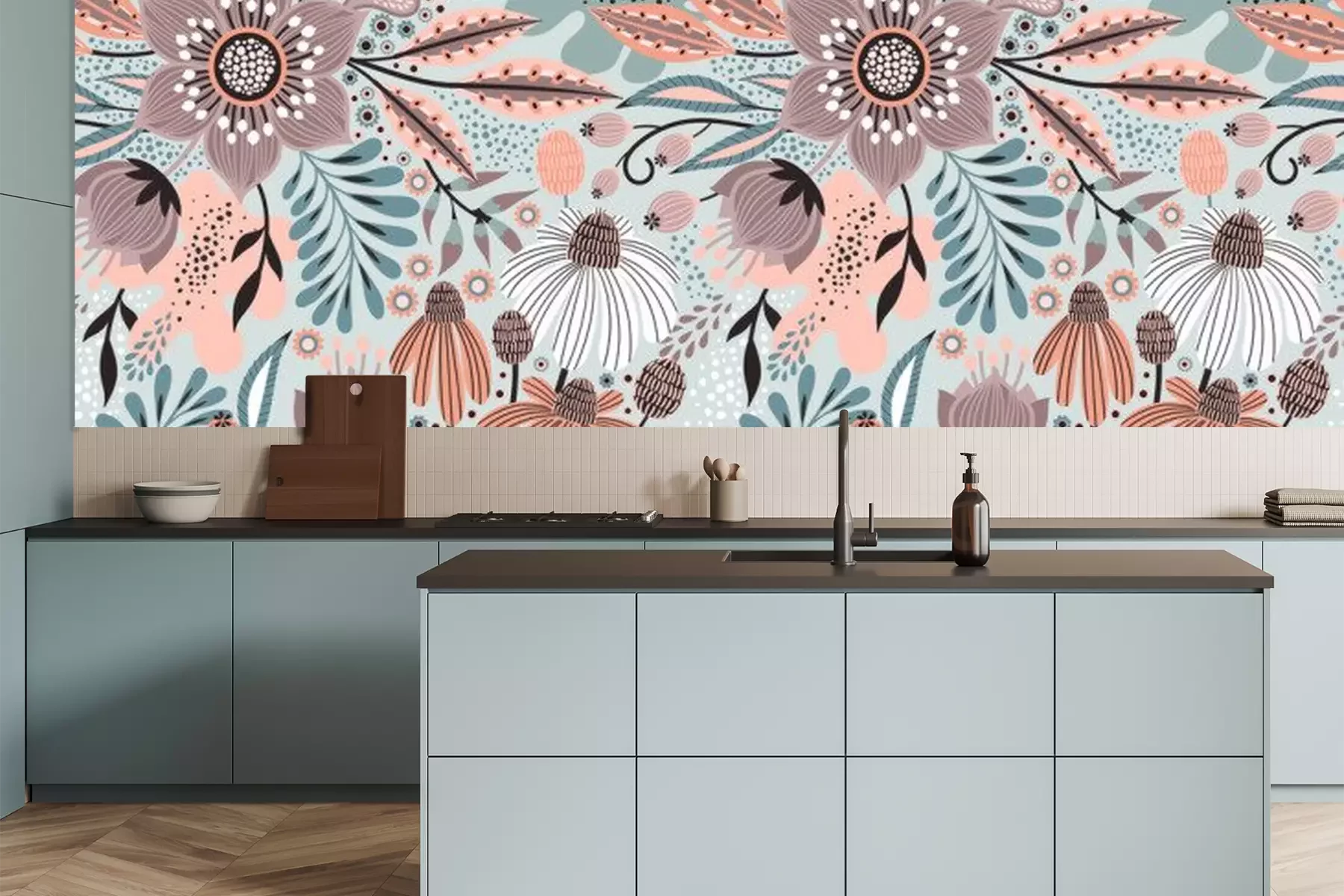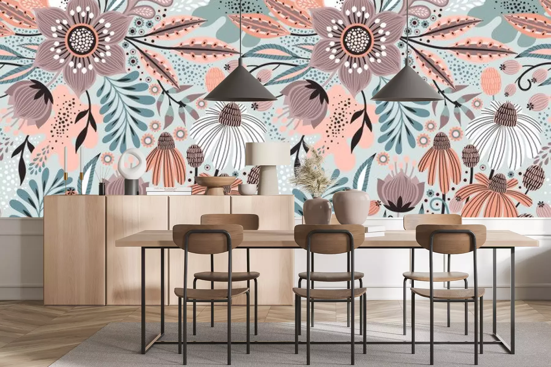 Papier peint  Floral seamless pattern on white. Abstract vector background with flowers and leaves. Natural bright design. Scandinavian style.